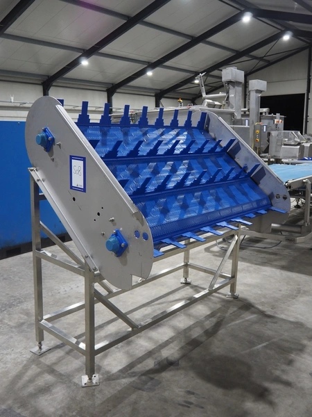 Elevating belt, plastic belt with dividers, belt width: 1600 mm, distance between dividers: 300 mm, divider height: 150 mm, elevating height: 1580 mm, total dimensions: 1100 mm x 1800 mm x 1700 mm.