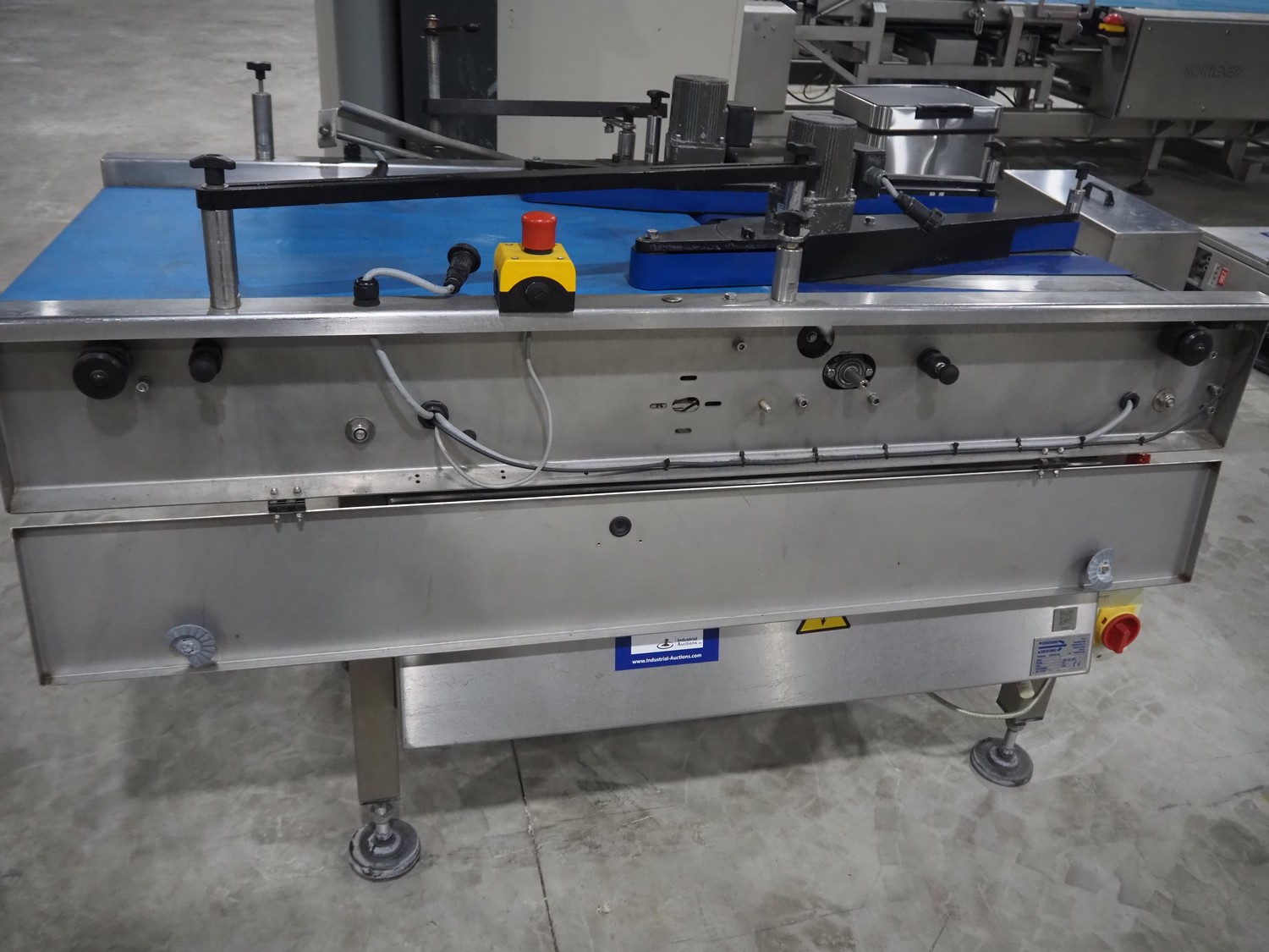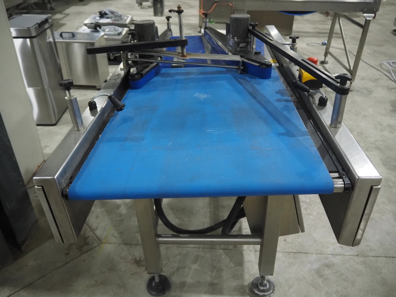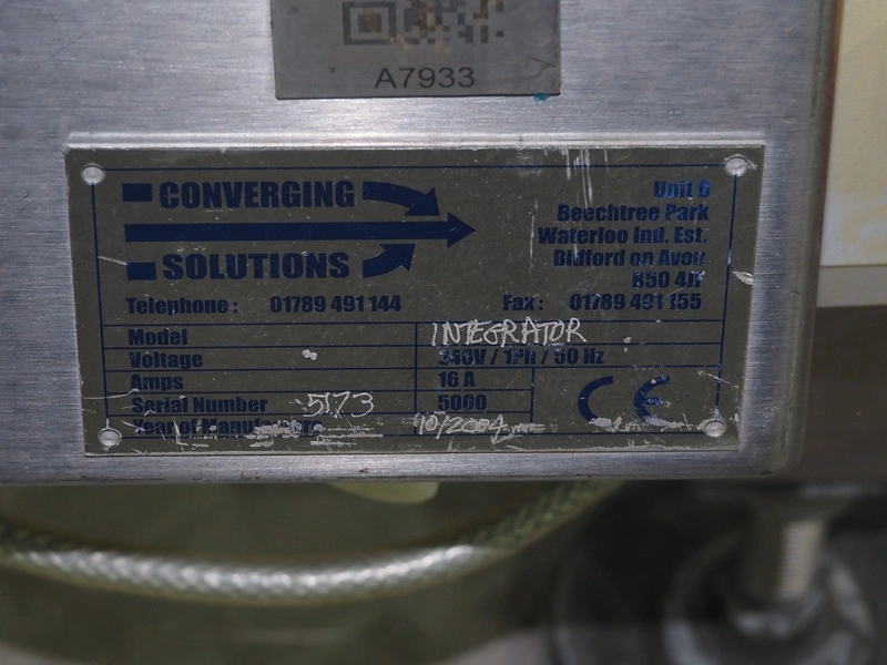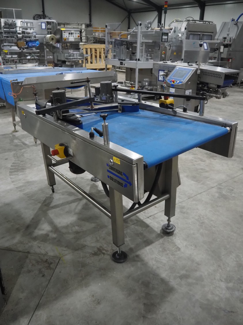 Converging Solutions converging inliner, model: Integrator, serial number: 5173, year of construction: 10/2004, 240 V, 1 Ph, 50 Hz, 16 A, plastic belts, belt width: 625 mm and (4x) 110 mm, total dimensions: 1620 mm x 820 mm x 1120 mm.