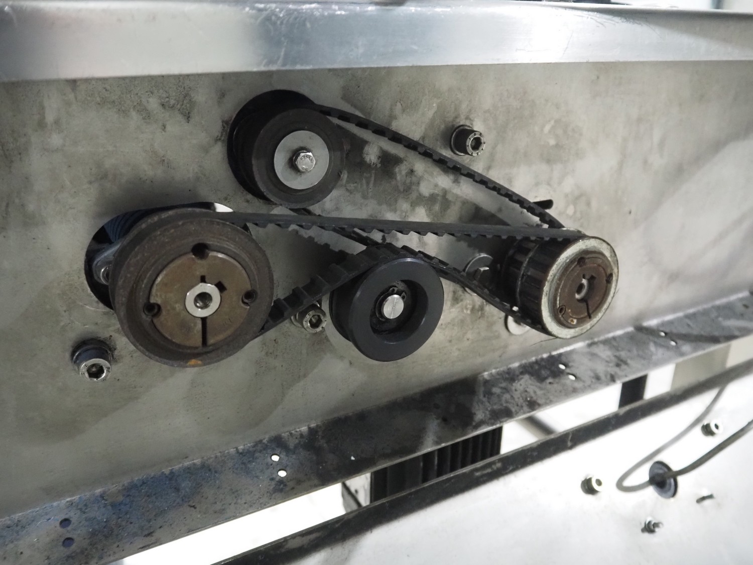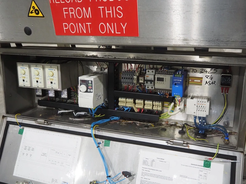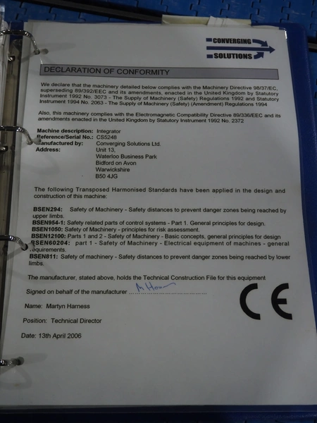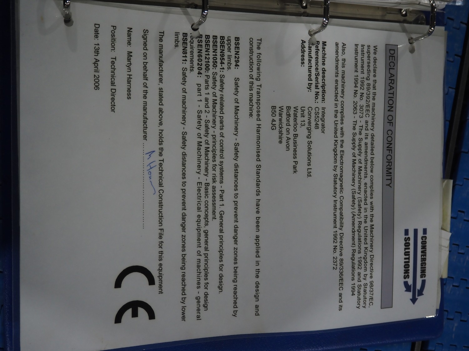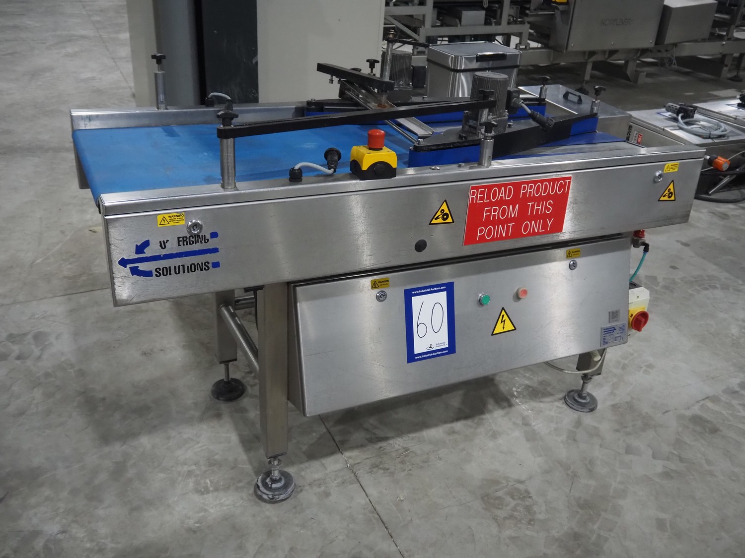 Converging Solutions converging inliner, model: Integrator, serial number: 5173, year of construction: 10/2004, 240 V, 1 Ph, 50 Hz, 16 A, plastic belts, belt width: 625 mm and (4x) 110 mm, total dimensions: 1620 mm x 820 mm x 1120 mm.