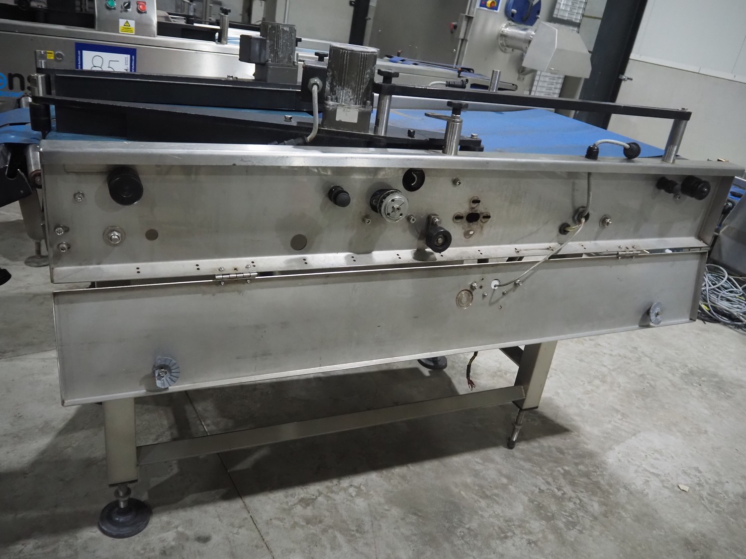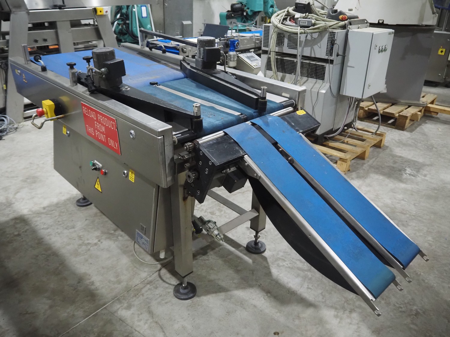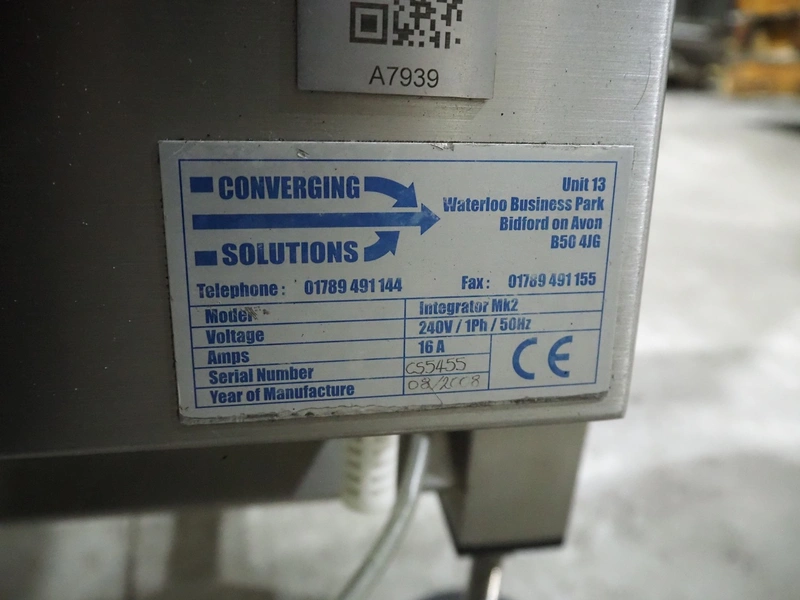 Converging Solutions converging lane dividing belt, model: Integrator Mk2, serial number: CS5455, year of construction: 08/2008, plastic belts, belt width: (2x) 225 mm, (1x) 625 mm, total dimensions: 1580 mm x 820 mm x 1120 mm.