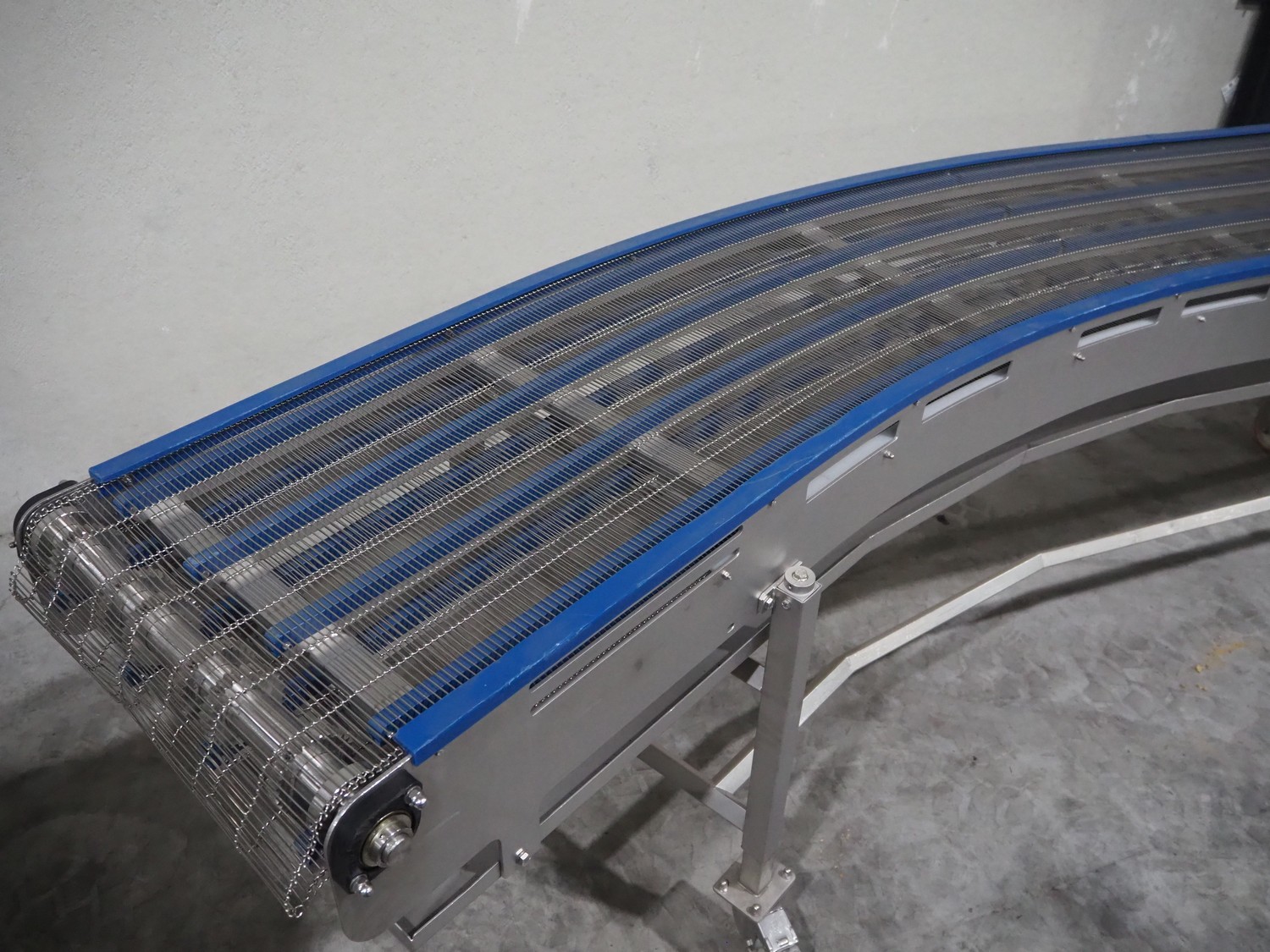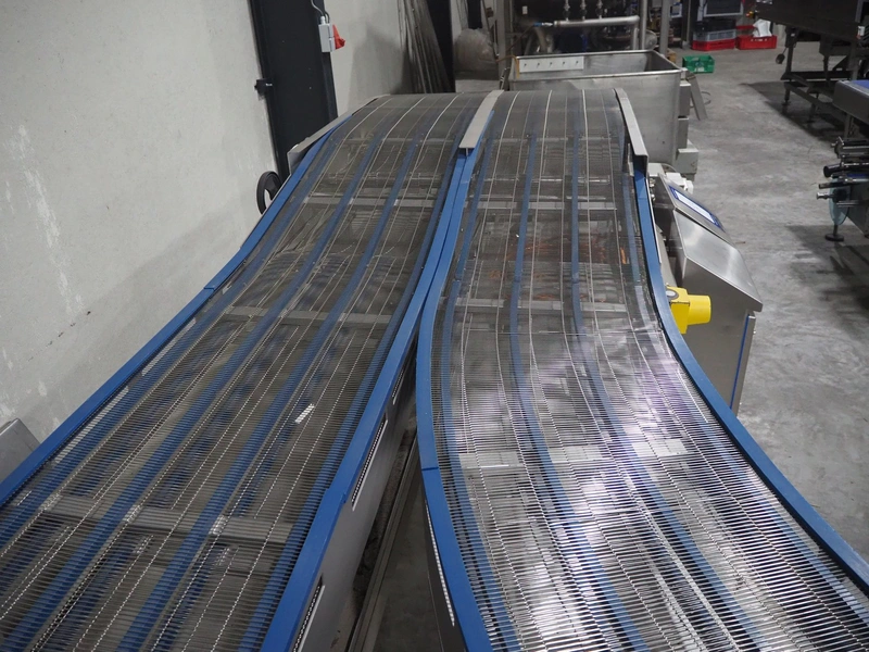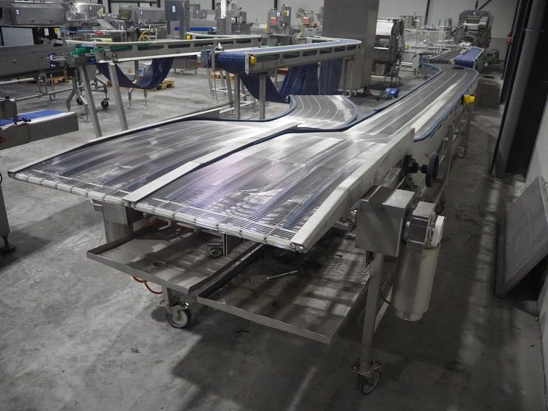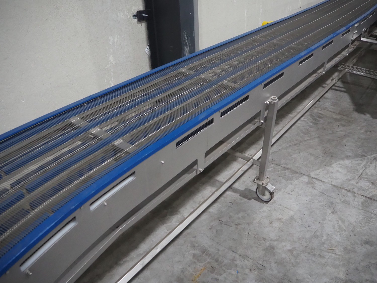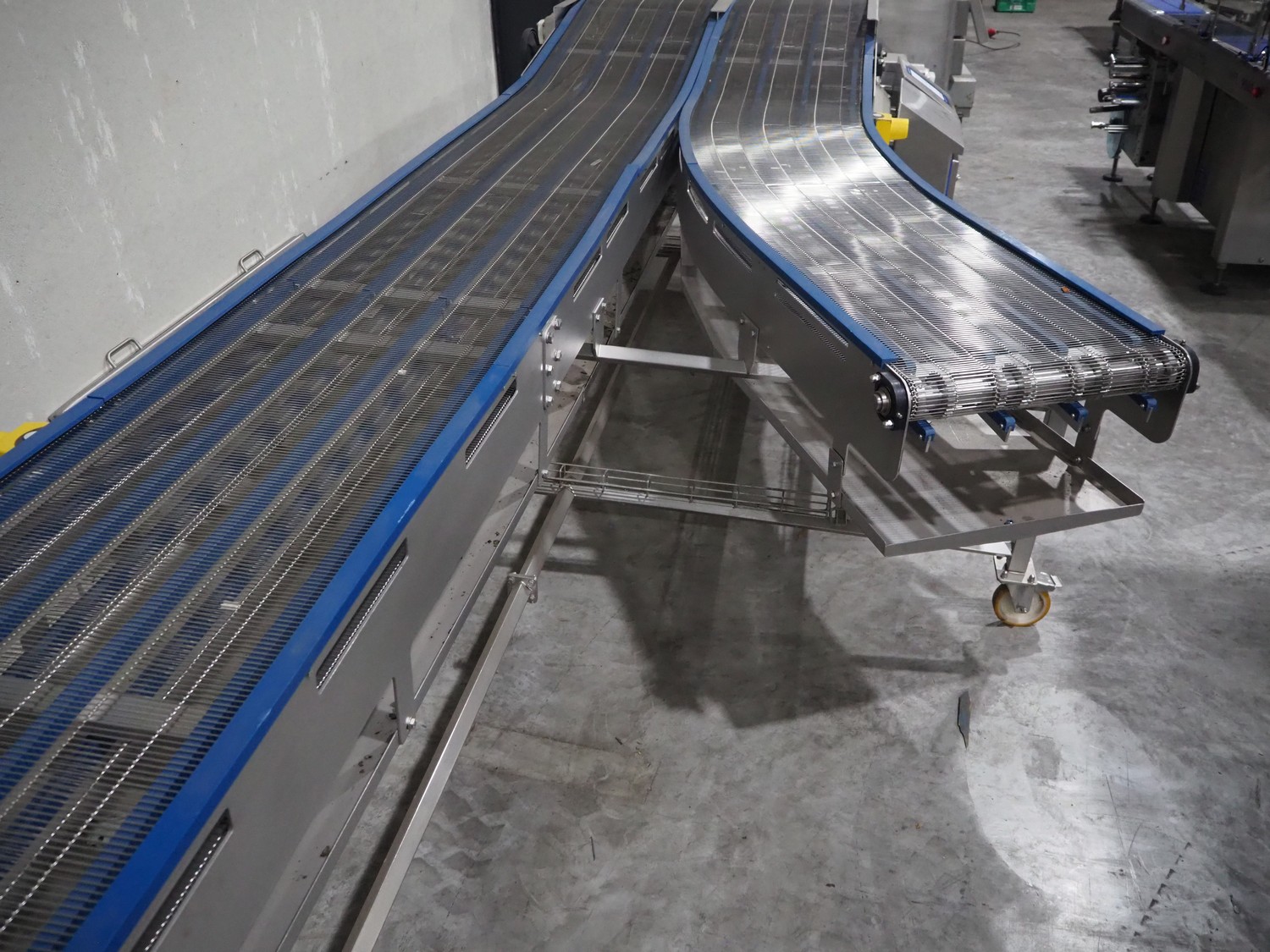 Mobile transport belt, 2 lanes, s/s mesh belts, belt width: 510 mm, total dimensions: 8100 mm x 1900 mm x 1100 mm.