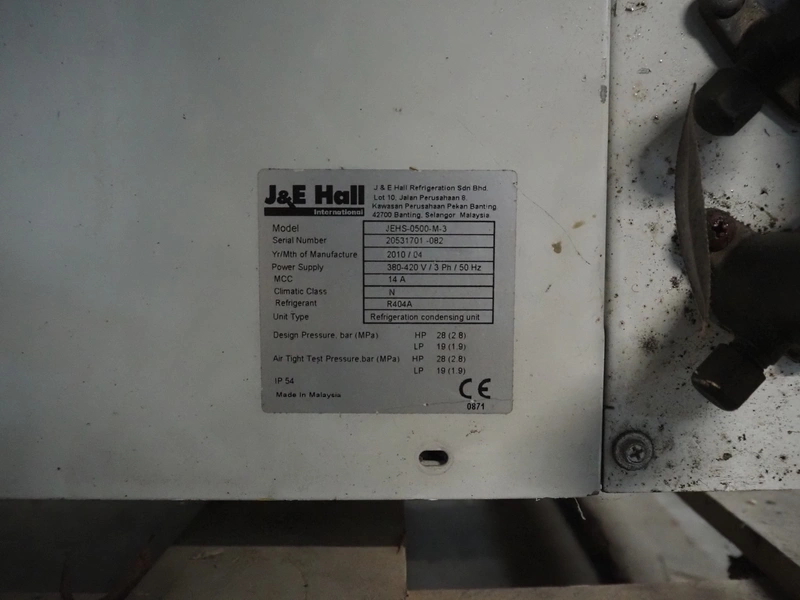 J&E; Hall outside unit for air-conditioning, model: JEHS-0500-M-3, serial number: 20531701-082, year of construction: 2010/04, 380/420 V, 3 Ph, 50 Hz, 14 A, refrigerant: R404a, dimensions: 1300 mm x 500 mm x 900 mm.