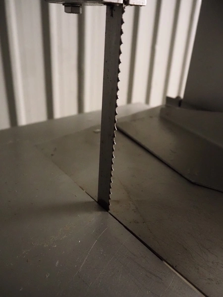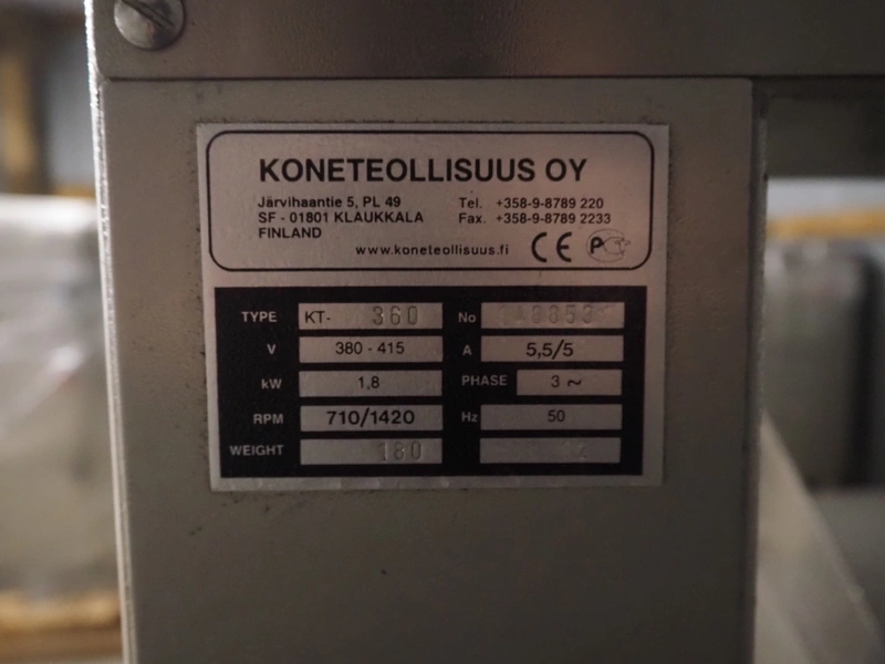 Koneteollisuus OY bandsaw, type: KT-360, serial number: 148853, 380-415 V, 3 Ph, 50 Hz, 5.5/5 A, 1.8 kW, 710/1420 RPM, weight: 180 kg, table dimensions: 480 mm x 670 mm, total dimensions: 900 mm x 850 mm x 1720 mm.