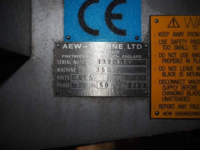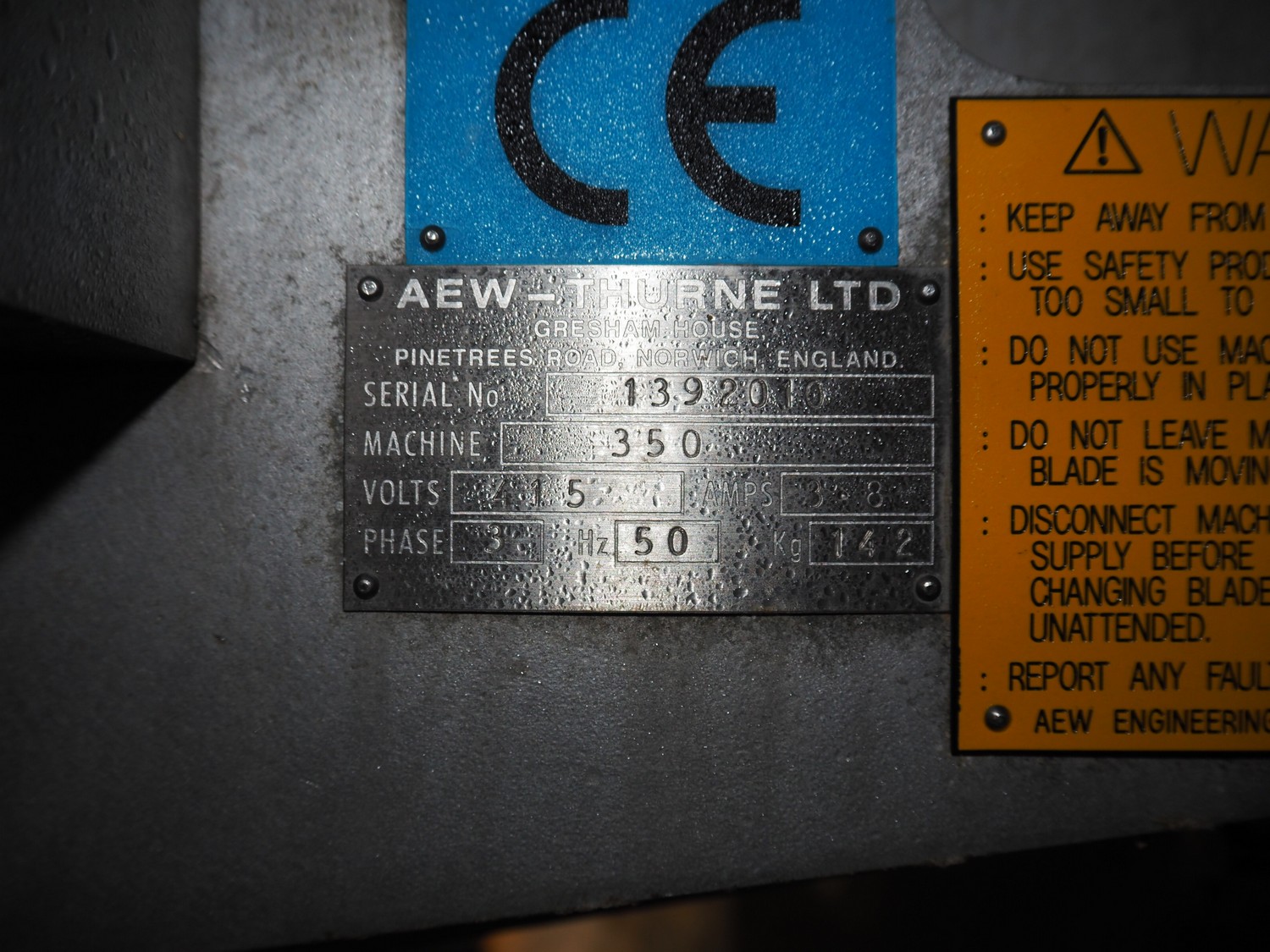 AEW-Thurne LTD bandsaw, type: 350, serial number: 1392010, 415 V, 3 Ph, 50 Hz, 3.8 A, weight: 142, table dimensions: 920 mm x 680 mm, total dimensions: 1060 mm x 800 mm x 1660 mm.