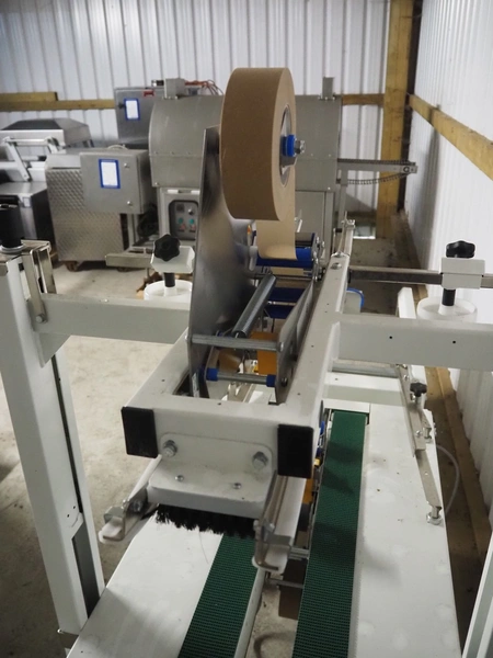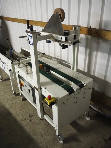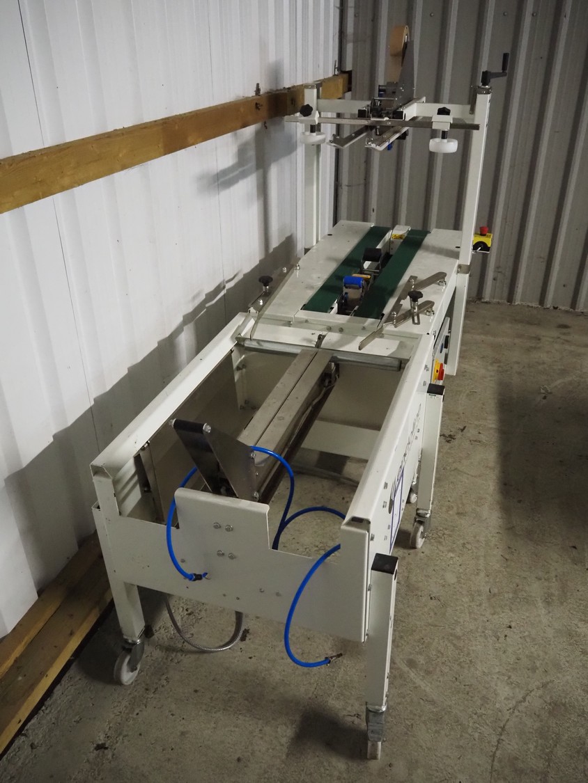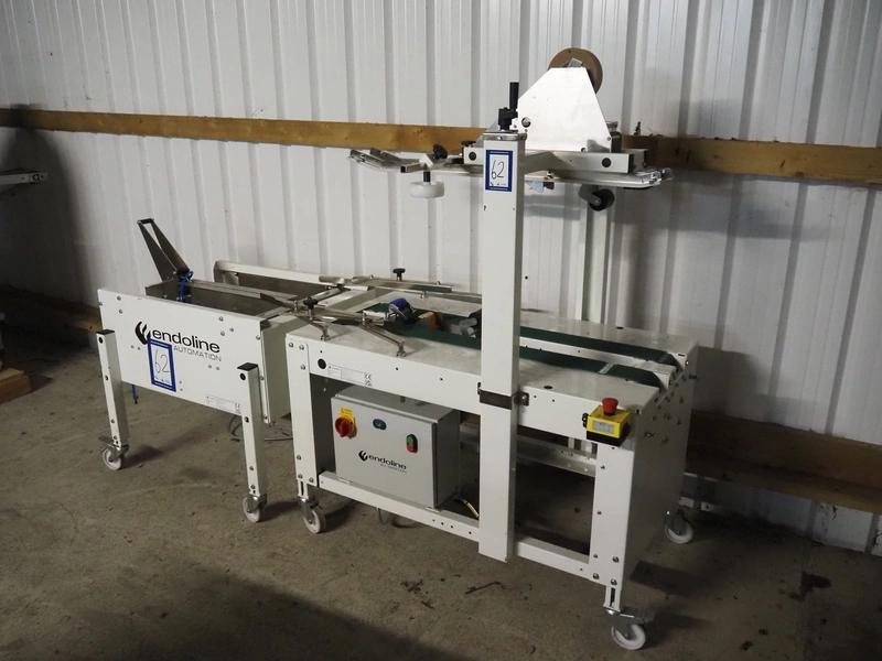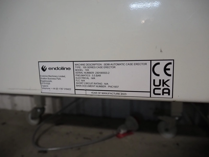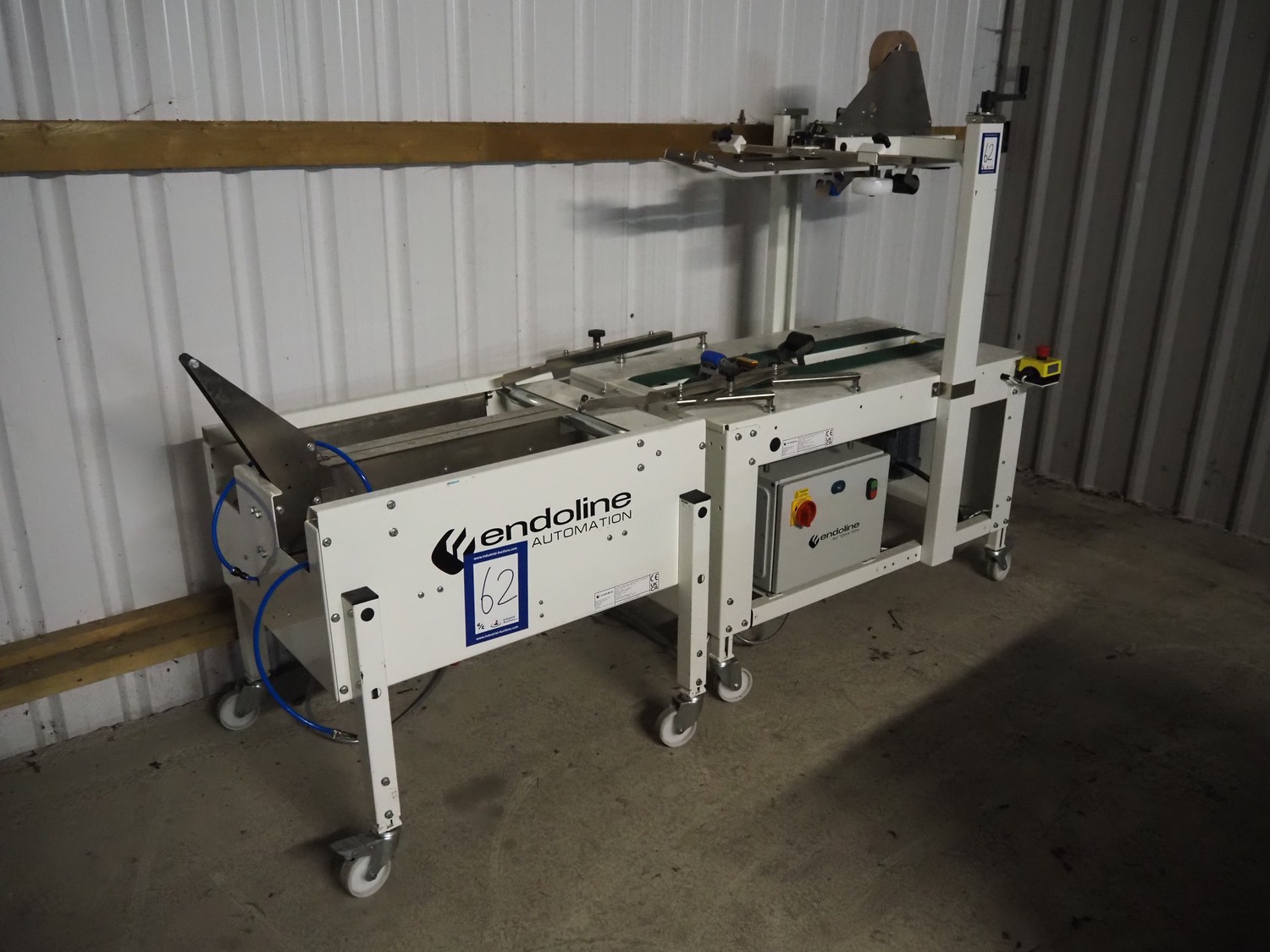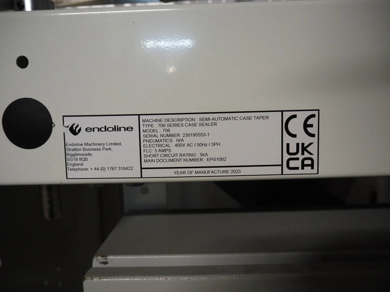 Endoline mobile semi-automatic case taper with top and bottom taper and case erector, type: 706 series case sealer and 100 series case erector, model: 706 and 103, serial number: 230195553, year of construction: 2023, 400 V, 3 Ph, 50 Hz, 3 A, clearance: 450 mm x 450 mm, total dimensions: 2200 mm x 800 mm x 1650 mm.