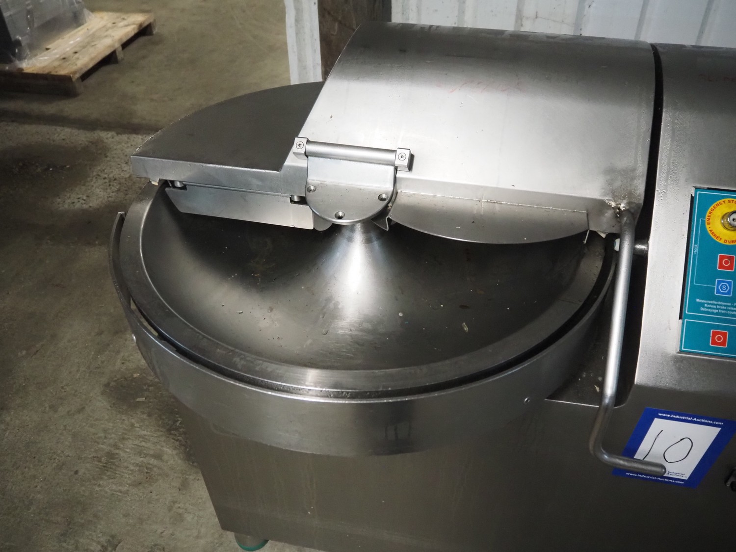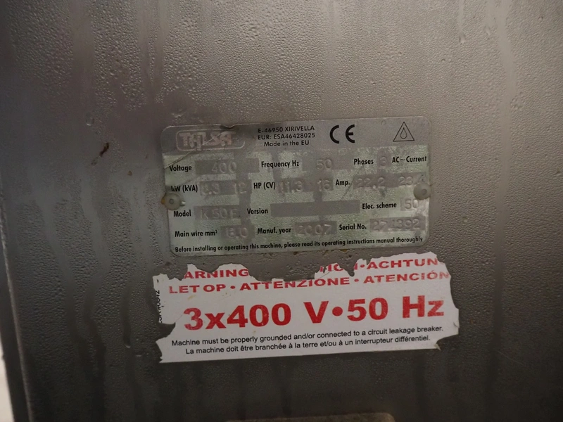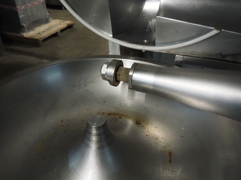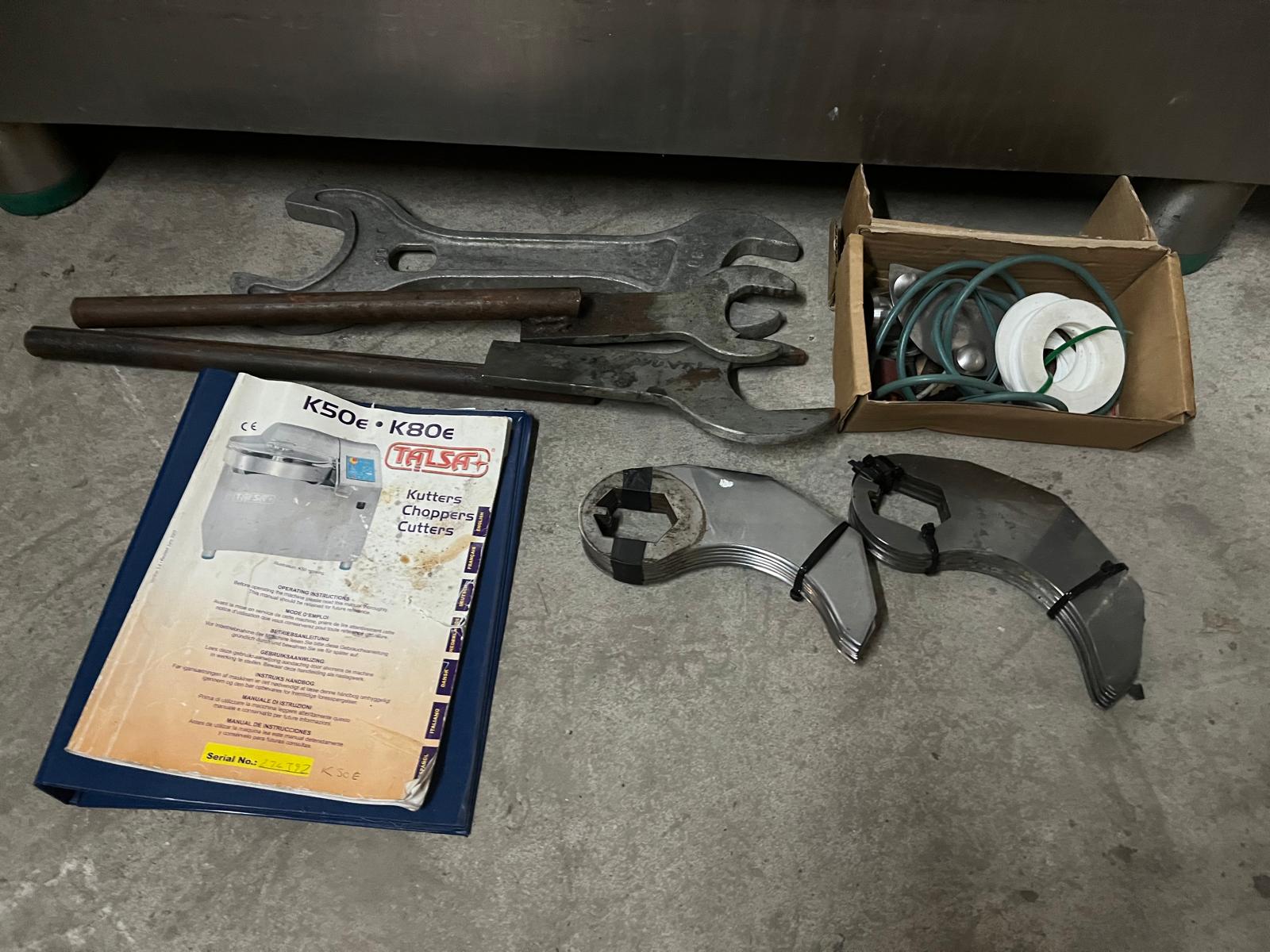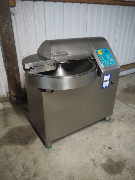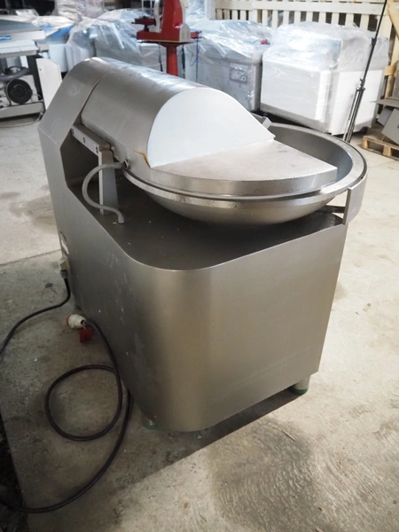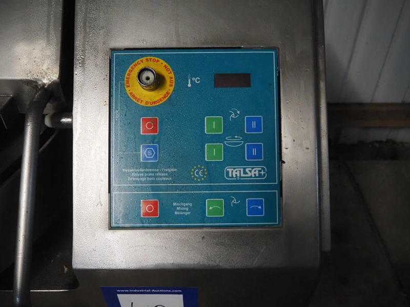 Talsa cutter, model: K50E, serial number: 274392, year of construction: 2007, 400 V, 3 Ph, 50 Hz, 22.2 / 23.4 A, 8.3 kW, s/s bowl, volume: 50 liter, total dimensions: 1350 mm x 1000 mm x 1250 mm. Missing knives.