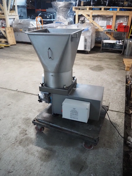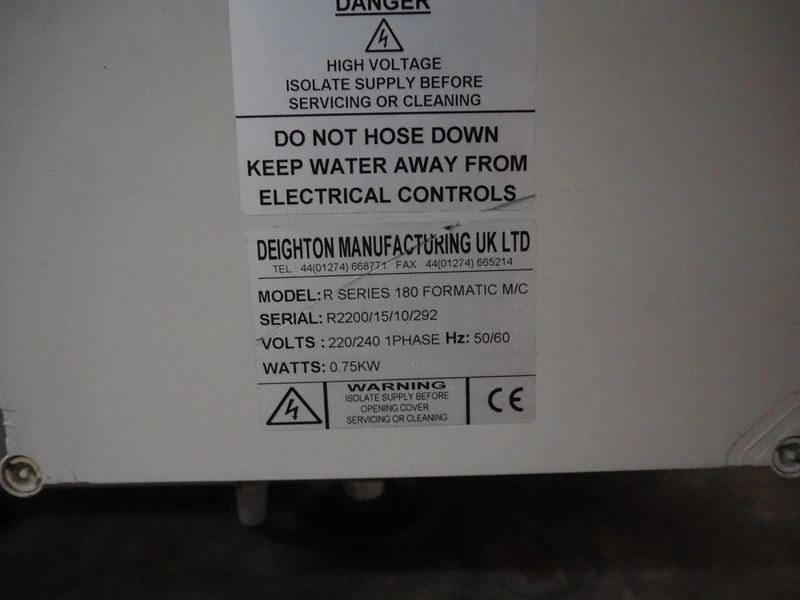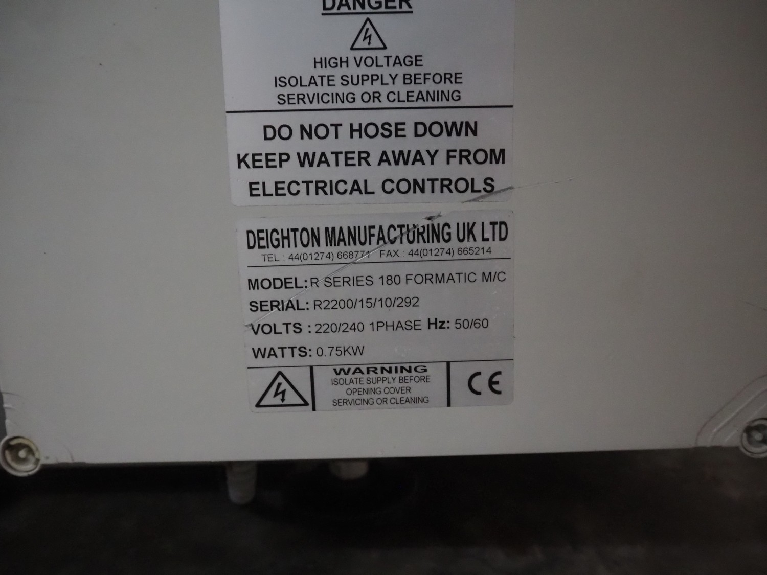 Deighton Manufacturing UK LTD burger forming machine, model: R SERIES 180 FORMATIC M/C, serial number: R2200/15/10/292, 220/240 V, 1 Ph, 50/60 Hz, 0.75 kW, dye: Ø 115 mm, plastic belt, belt width: 120 mm, total dimensions: 1200 mm x 950 mm x 1020 mm.