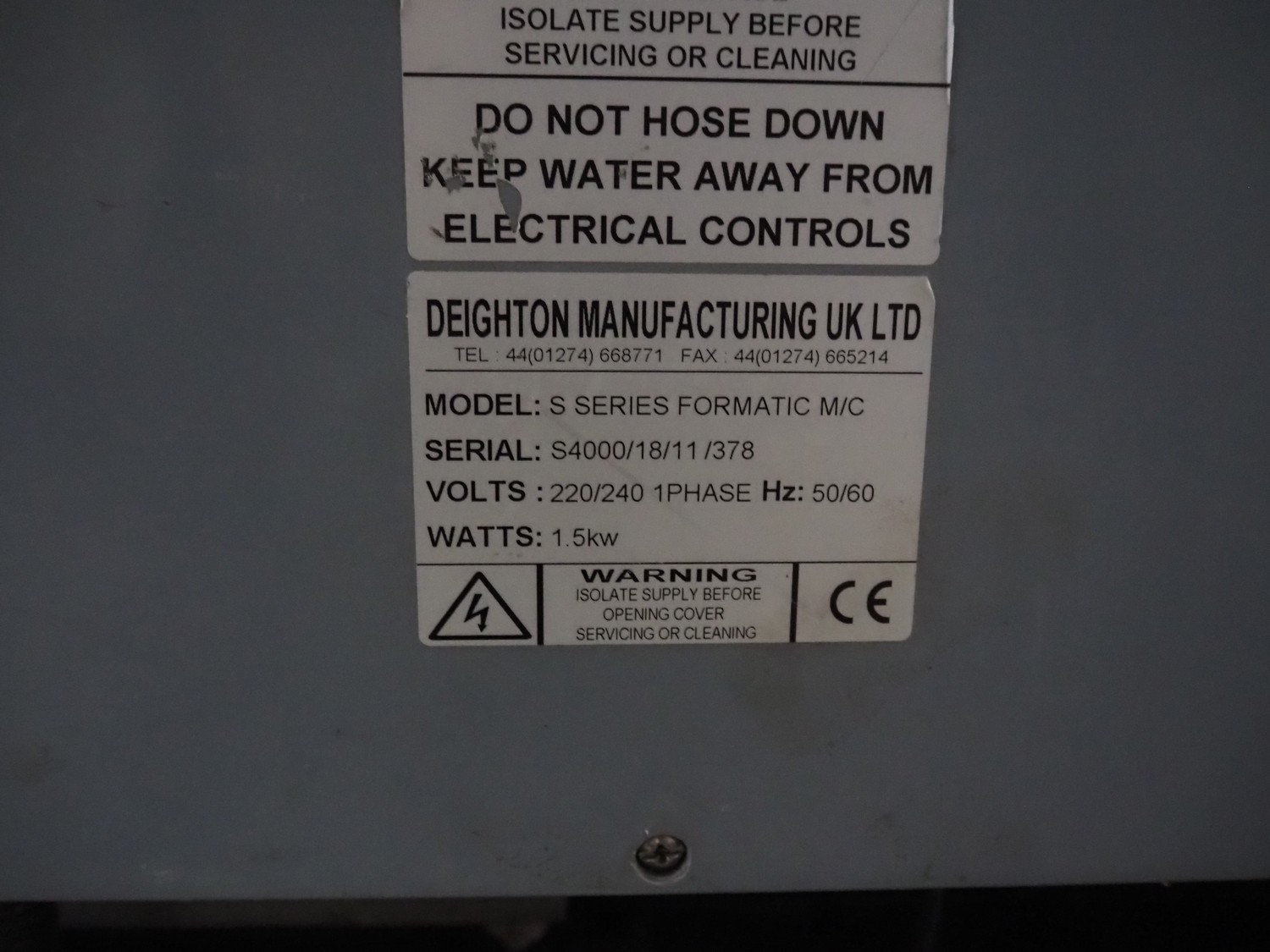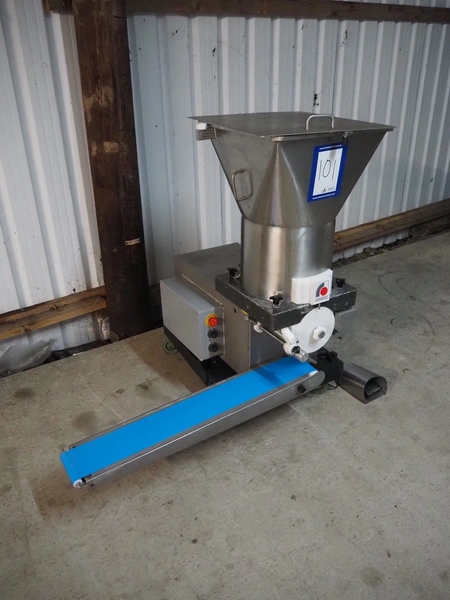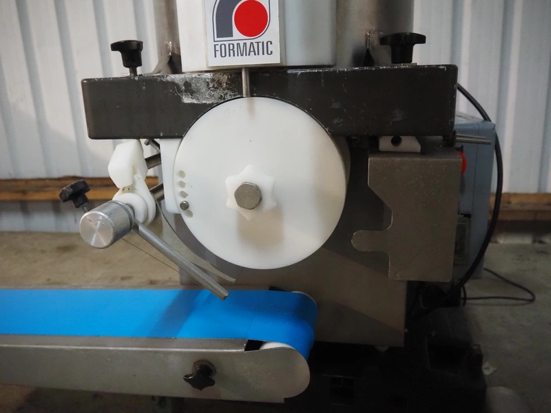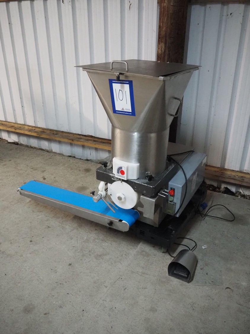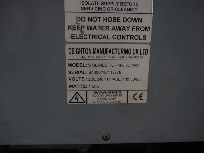 Deighton Manufacturing UK LTD burger forming machine, model: R SERIES 180 FORMATIC M/C, serial number: S4000/18/11/378, 220/240 V, 1 Ph, 50/60 Hz, 1.5 kW, dye: Ø 100 mm, belt width: 140 mm, total dimensions: 1400 mm x 1030 mm x 1320 mm.