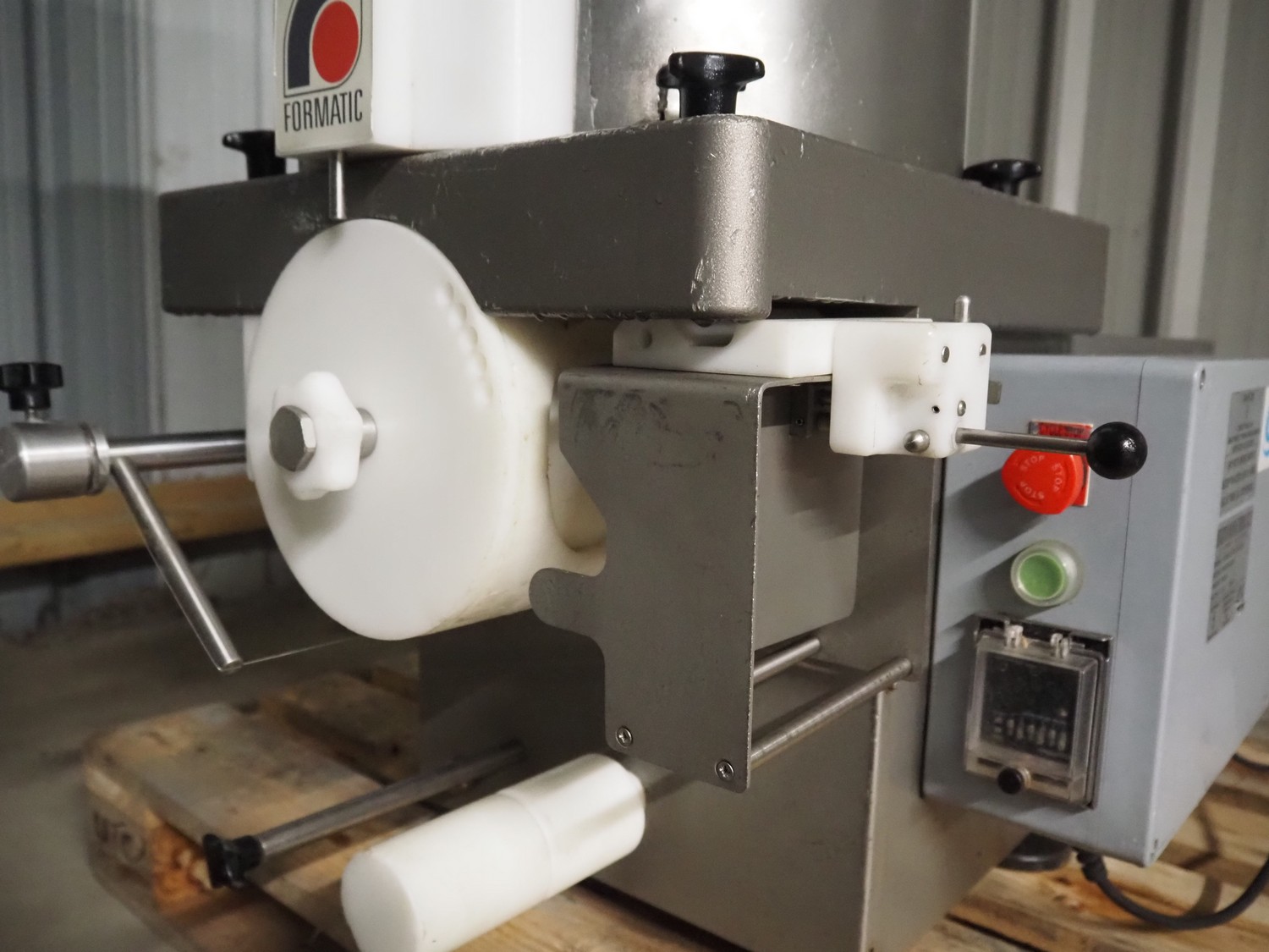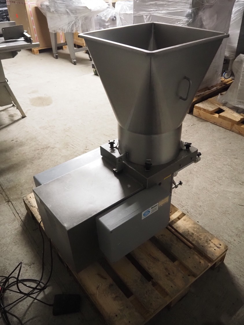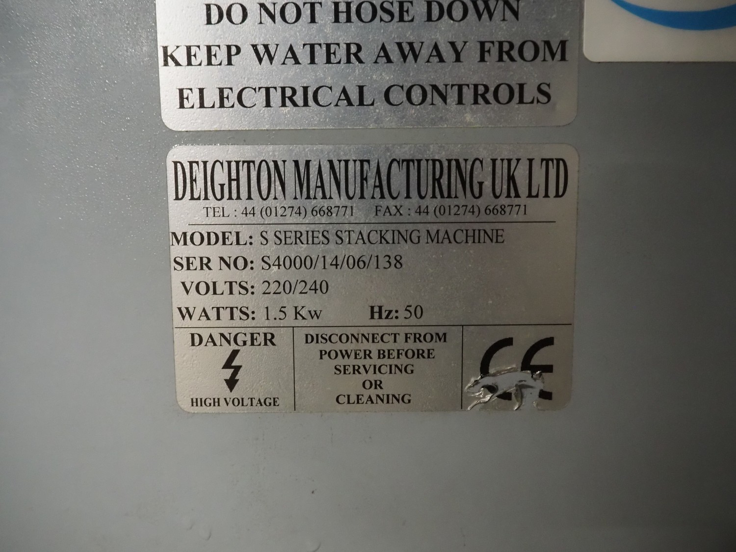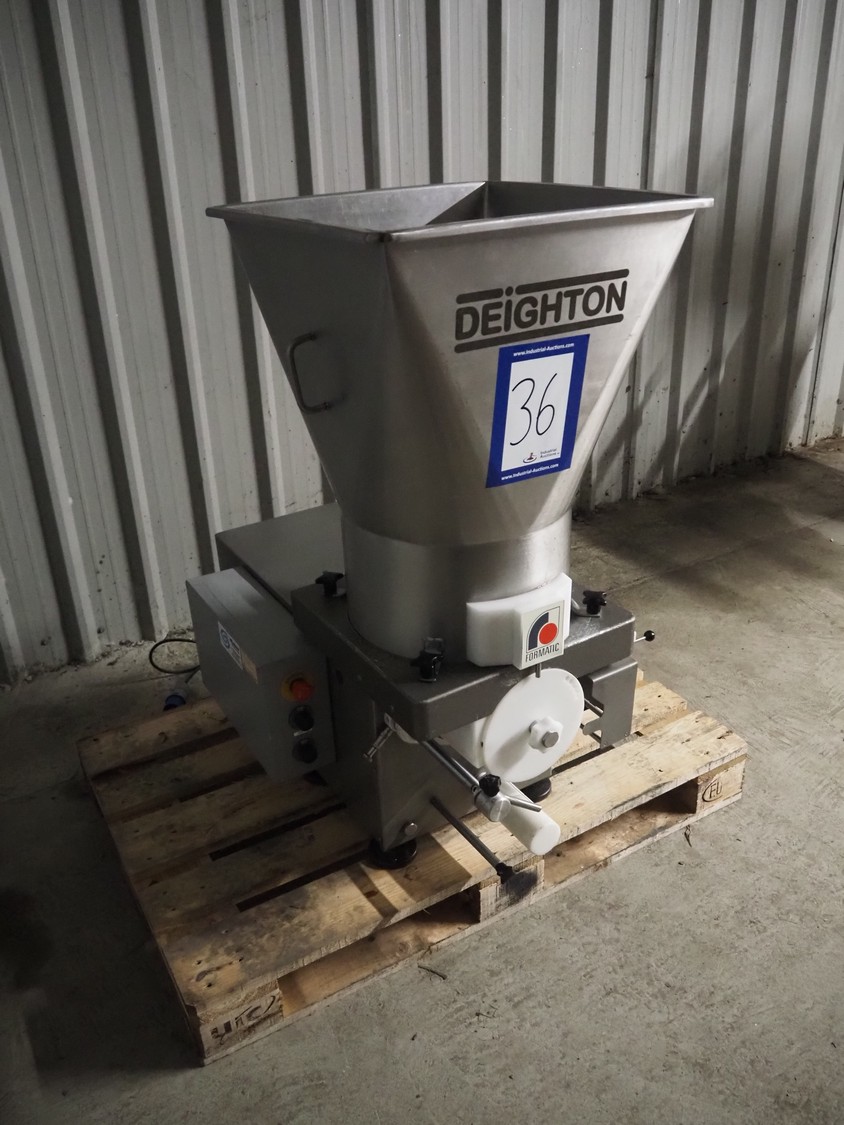 Deighton Manufacturing UK LTD burger forming machine, type: S Series stacking machine, serial number: S4000/14/06/138, 220/240 V, 50 Hz, 1.5 kW, form diameter: Ø 115 mm total dimensions: 980 mm x 600 mm x 1240 mm. Including outfeed conveyor without belt.