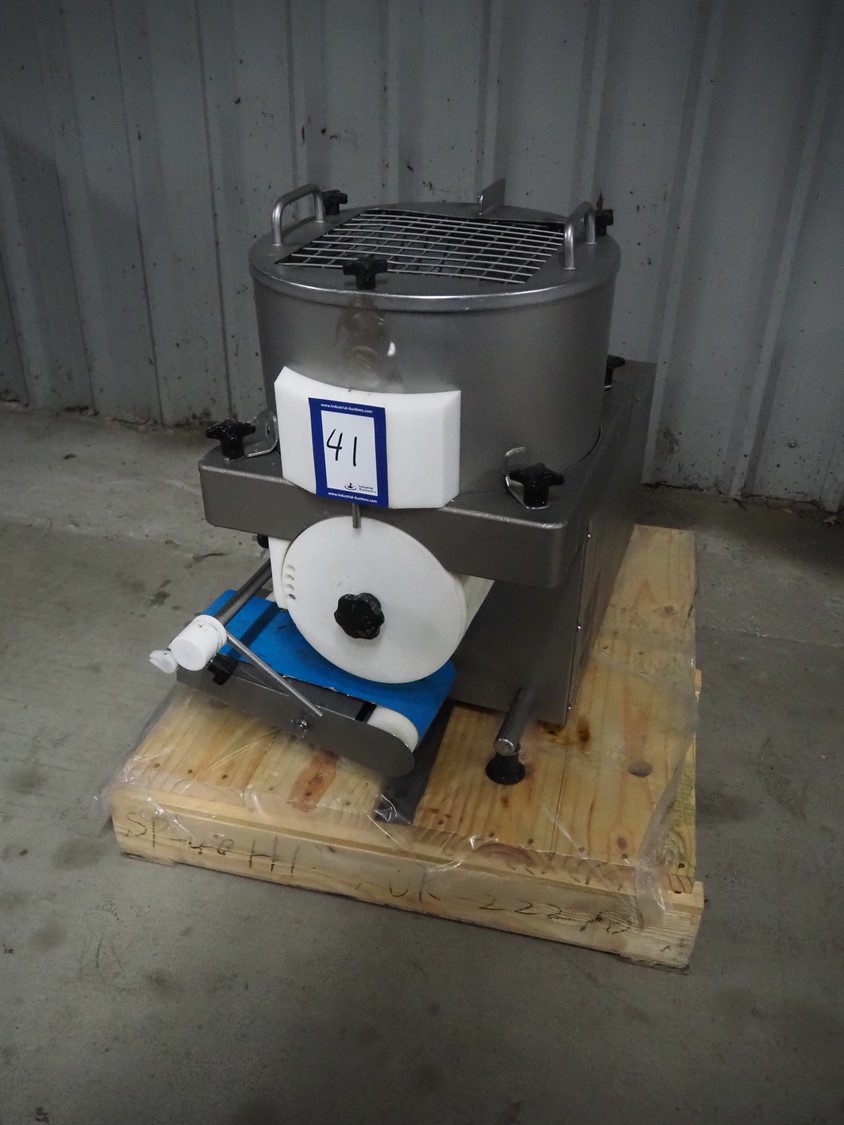 Deighton Manufacturing UK LTD burger forming machine, form diameter: Ø 115 mm, plastic belt, belt width: 120 mm, total dimensions: 470 mm x 450 mm x 570 mm.