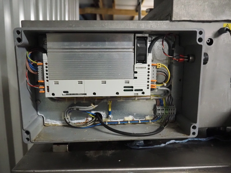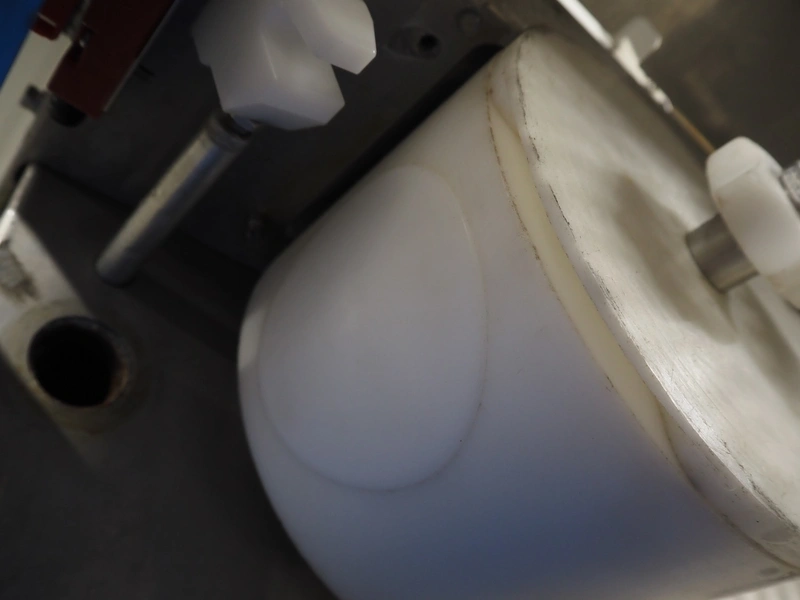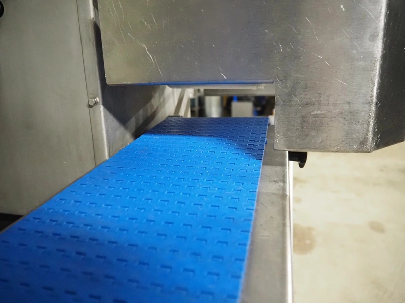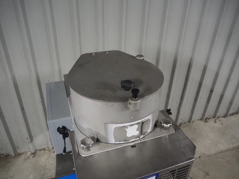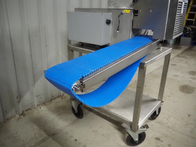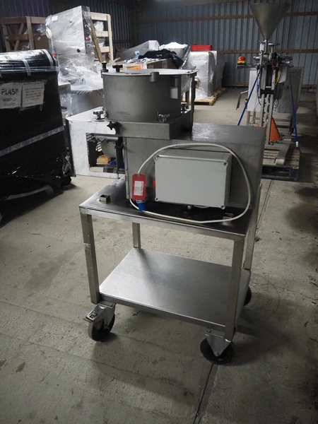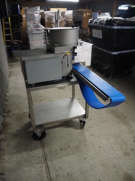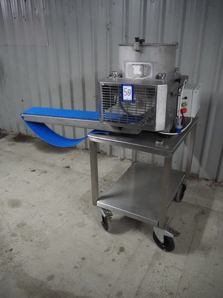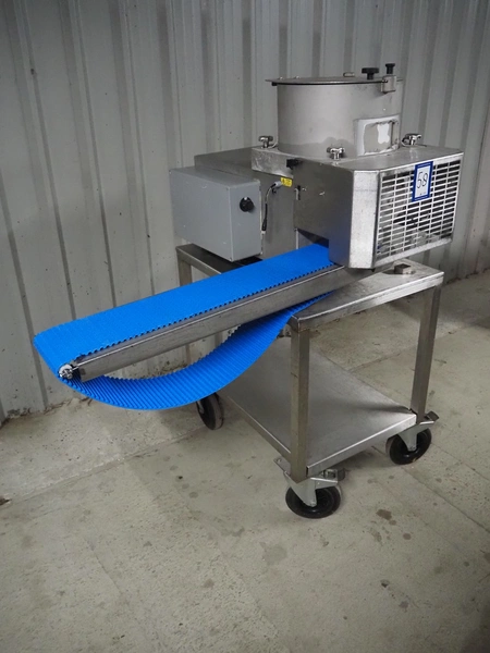 Burger forming machine on s/s trolley, form diameter: 100 mm, plastic outfeed belt, belt width: 150 mm, total dimensions: 1300 mm x 800 mm x 1500 mm. Technical condition unknown.