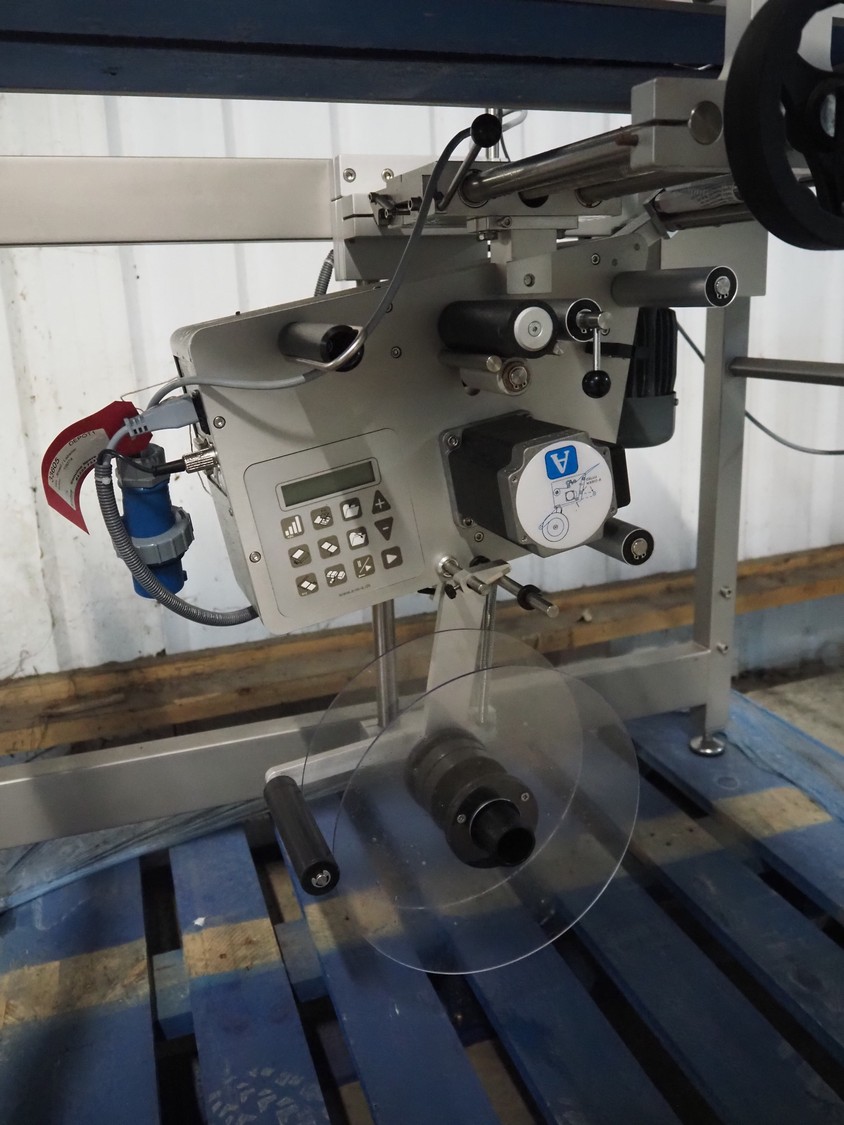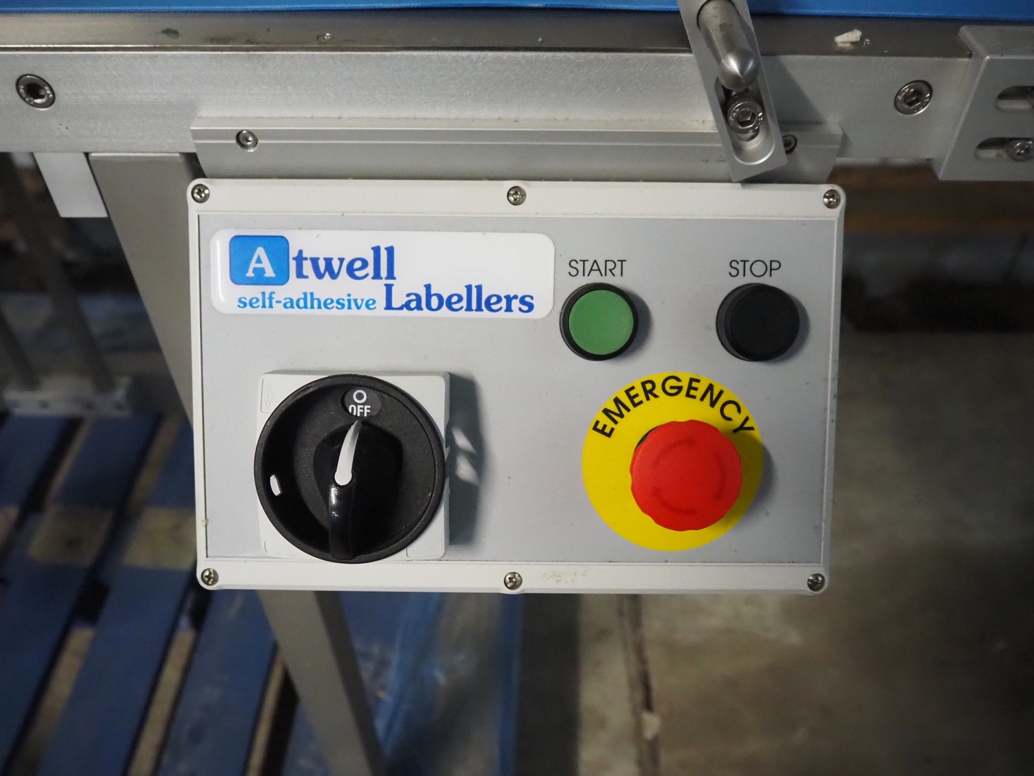Attwell automatic labelling machine, type: LC-1600/300-S2, serial number: 19074, year of construction: 2020, 230 V, 50/60 Hz, 350 W, plastic belt, belt width: 240 mm, total dimensions: 1650 mm x 700 mm x 1000 mm.