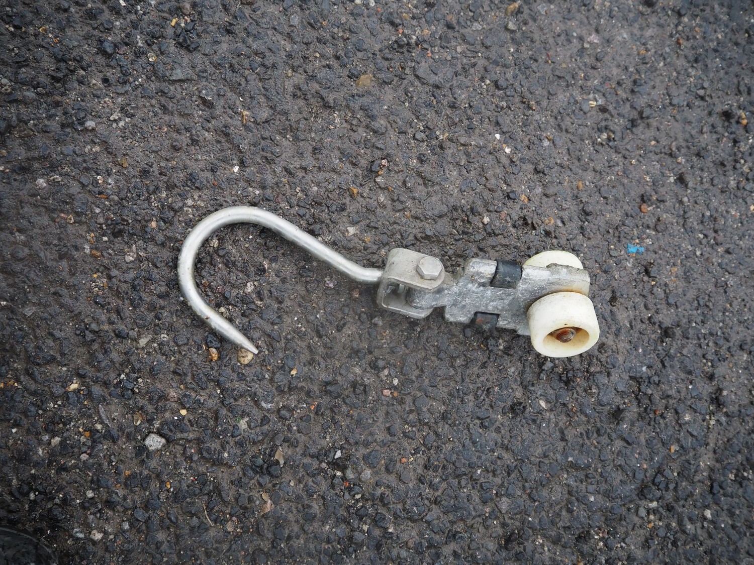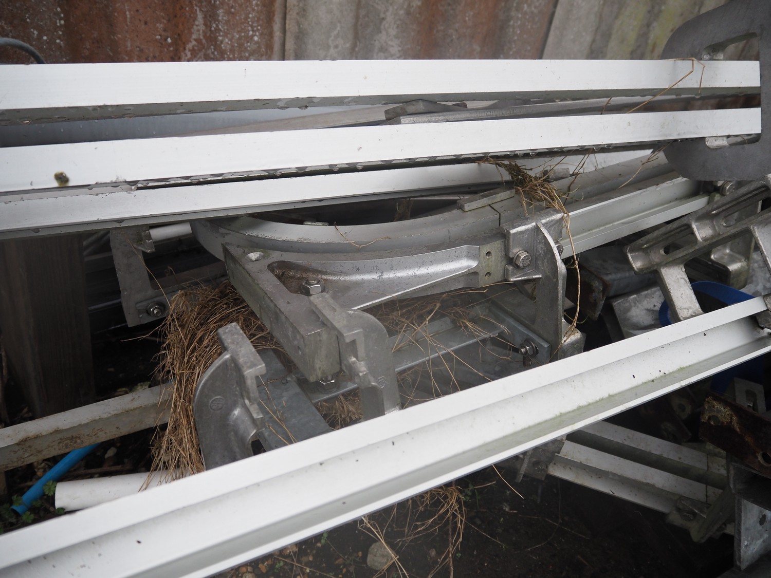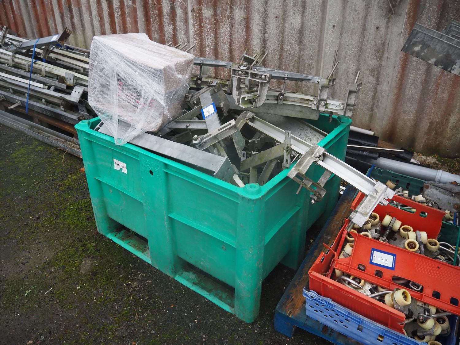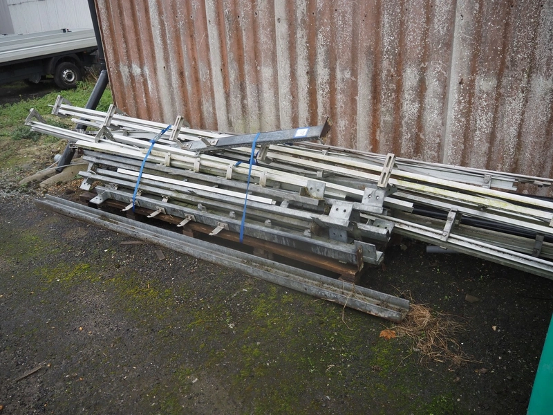 Steel tube rail with Avery Berkel weighing station and s/s hooks, model: L136, dimensions hooks: 200 mm x 100 mm, total dimensions: 6000 mm x 1000 mm x 1000 mm. With pallet and pallet box with parts.