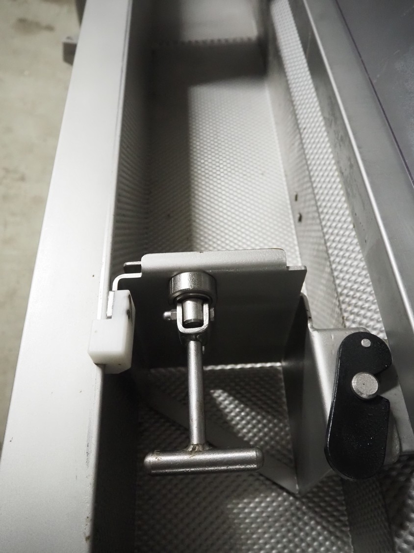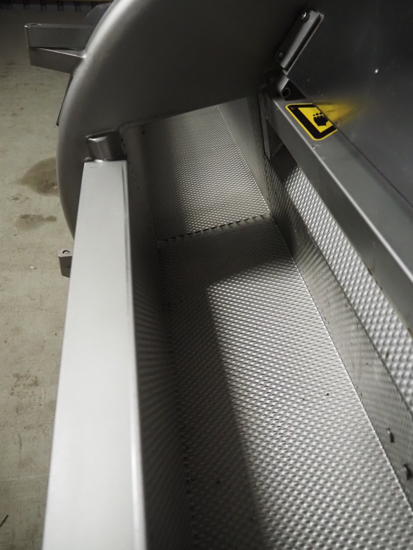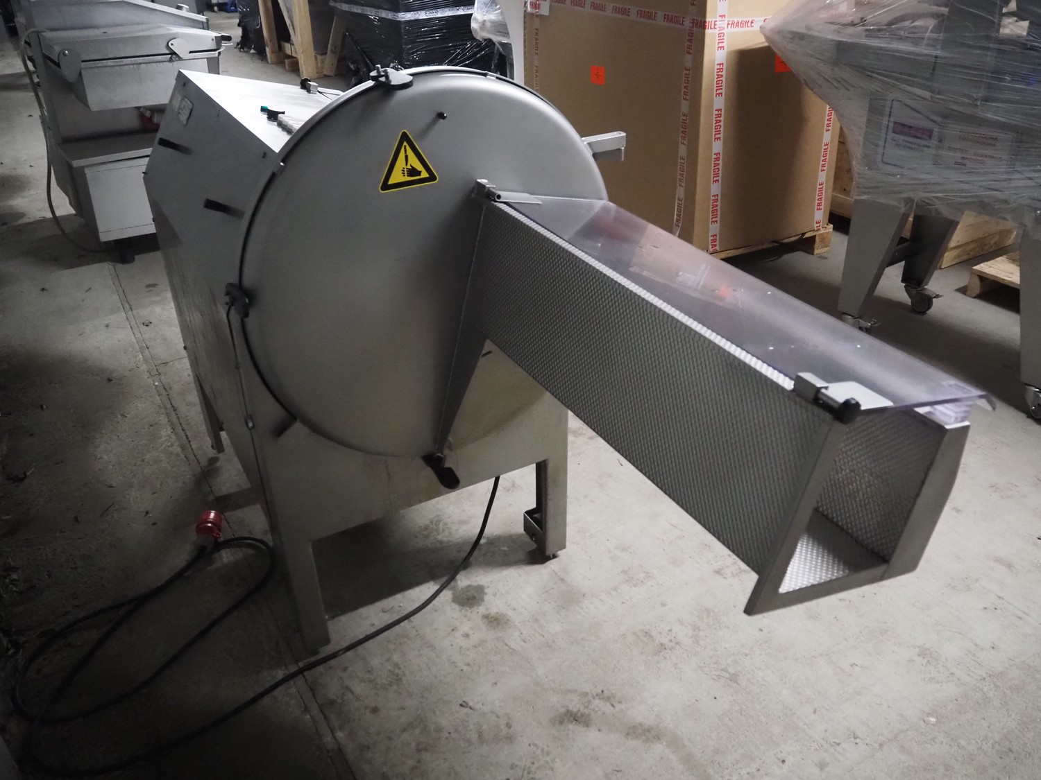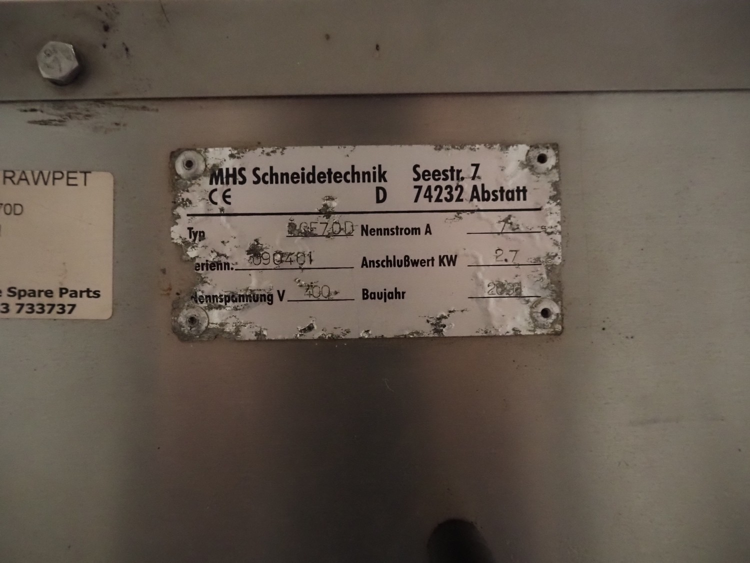 MHS Schneidetechnik slicer, type: PCE70D, serial number: 090401, 400 V, 7 A, 2.7 kW, clearance: 225 mm x 210 mm, total dimensions: 1850 mm x 860 mm x 1270 mm.
