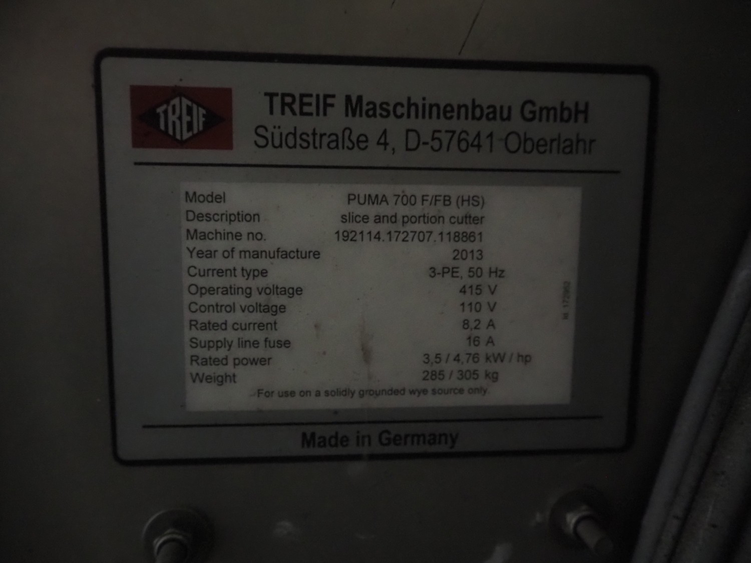 Treif Maschinenbau GmbH slicer, type: Puma700 F/FB (HS), serial number: 192114.172707.118861, year of construction: 2013, 415 V, 3 Ph, 50 Hz, 8.2/16 A, 3.5 kW, weight: 305 kg, clearance: 240 mm x 220 mm, total dimensions: 1960 mm x 900 mm x 1480 mm.