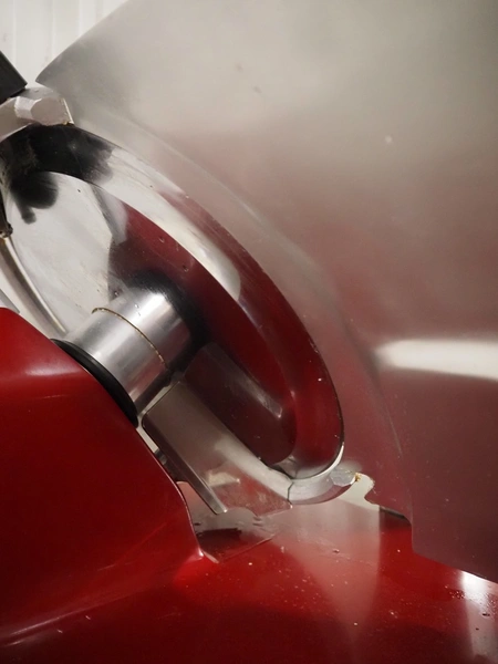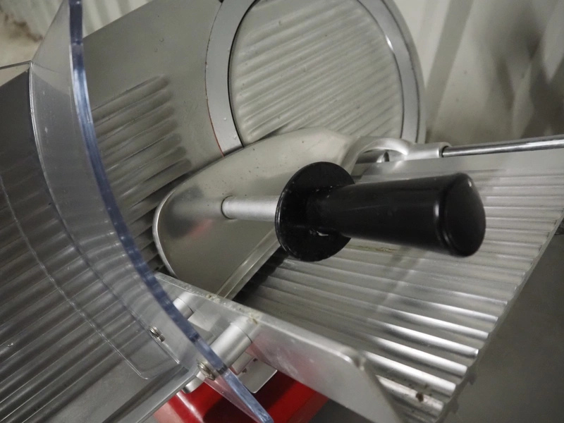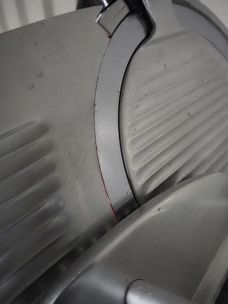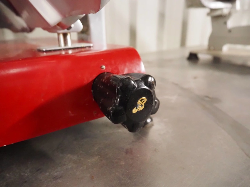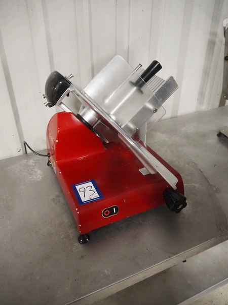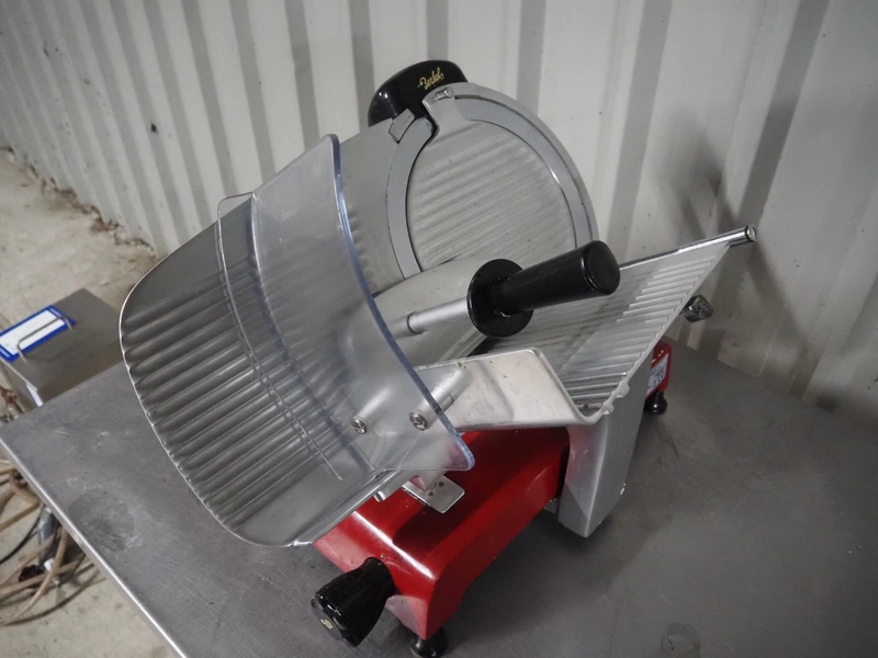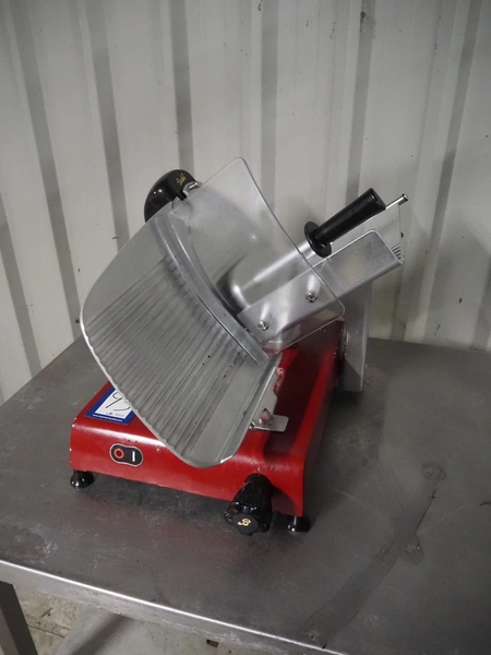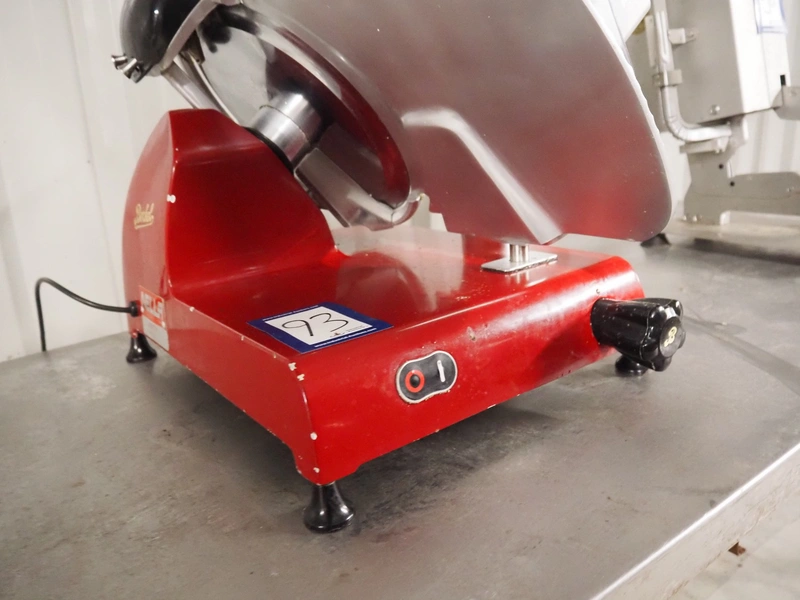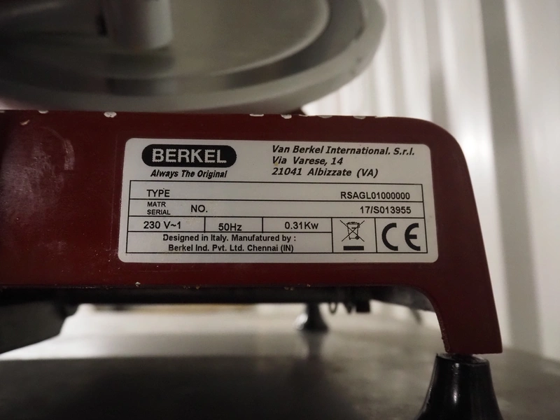 Berkel slicer, type: RSAL01000000, number: 17/S013955, 230 V, 1 Ph, 50 Hz, 0.31 kW, dimensions: 600 mm x 400 mm x 500 mm.