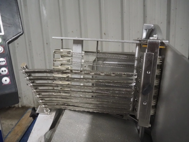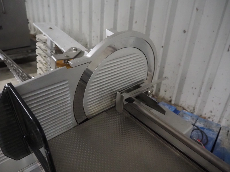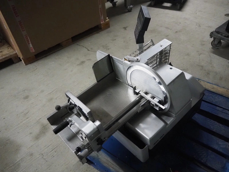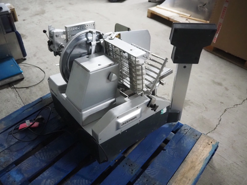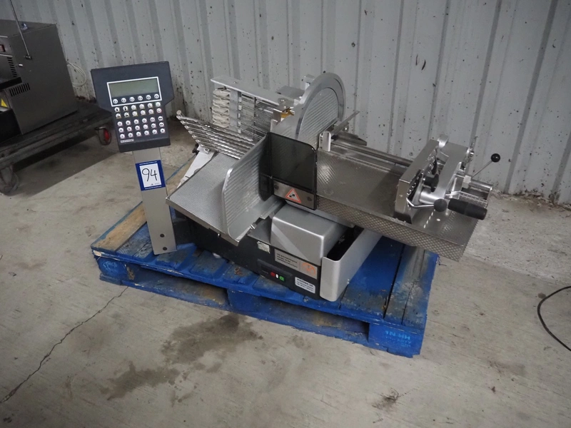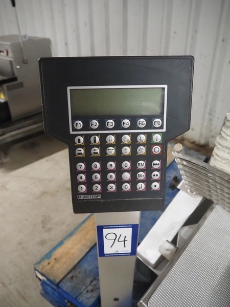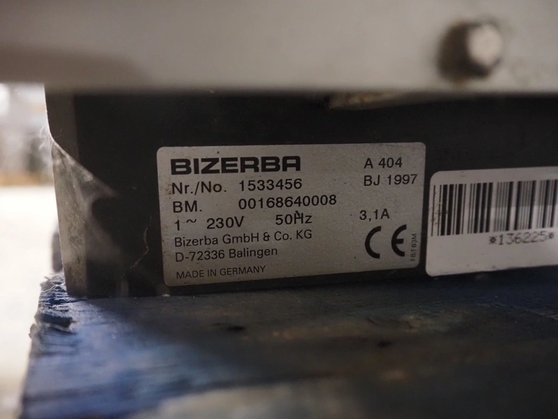 Bizerba automatic slicer, model: A 404, number: 1533456, year of construction: 1997, 230 V, 1 Ph, 50 Hz, 3.1 A, dimensions: 1100 mm x 650 mm x 1370 mm.