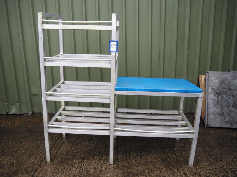 Aluminium packaging table with plastic top, dimensions worktop: 800 mm x 600 mm, 4 floors, dimensions each floor: (4x) 600 mm x 600 mm, total dimensions: 1500 mm x 600 mm x 1500 mm.