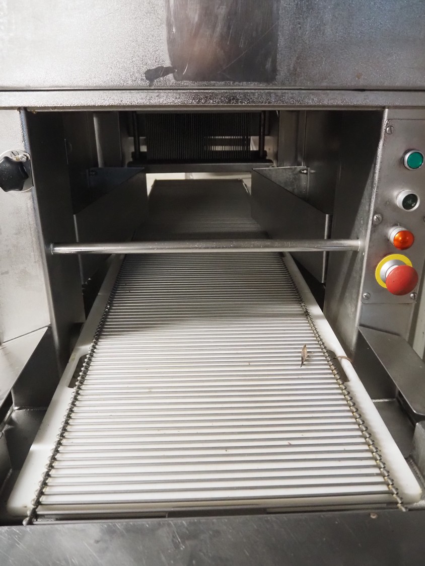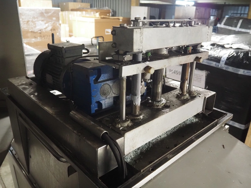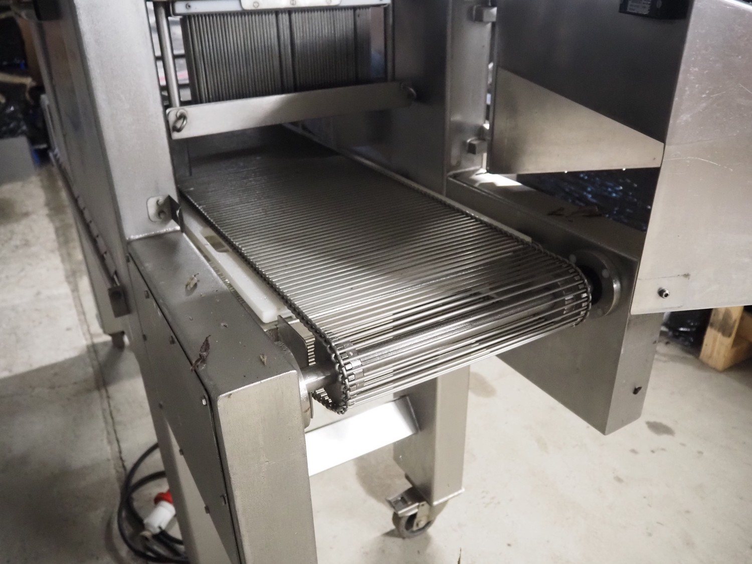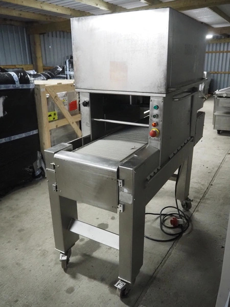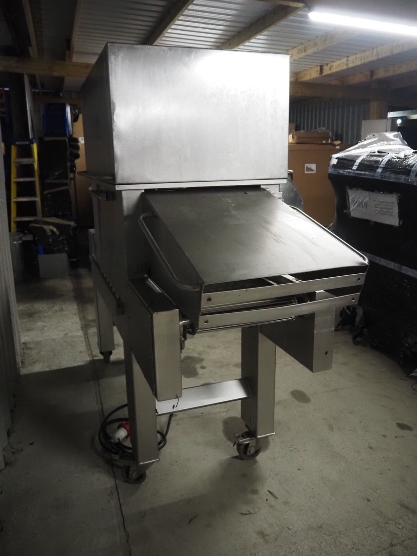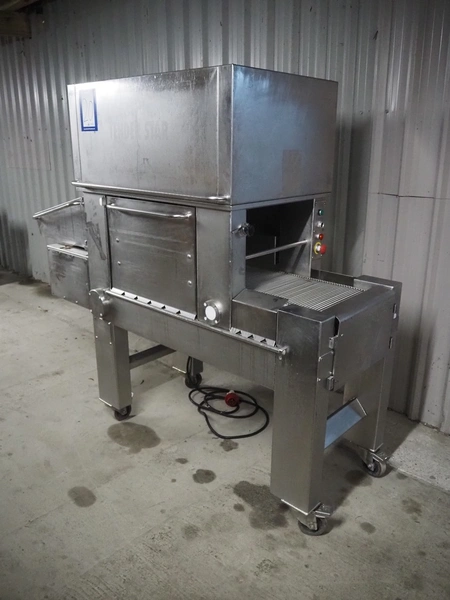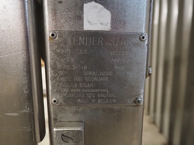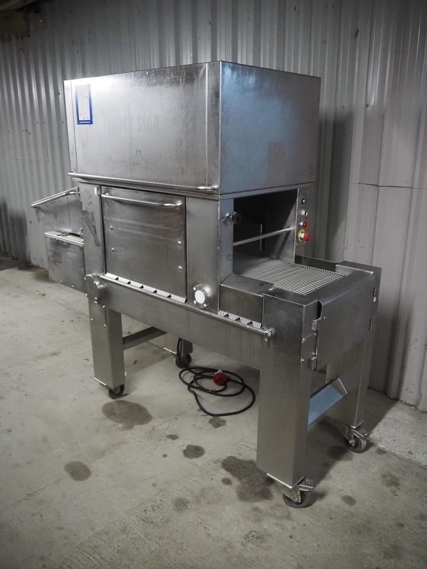 Tender Star mobile tenderizer, model: T.S.B. serial number: 201326, year of construction: 2001, 220/380 V, 3 Ph, 50 Hz, 12 A, s/s belt, belt width: 400 mm, clearance: 340 mm x 150 mm, total dimensions: 2200 mm x 850 mm x 1950 mm.