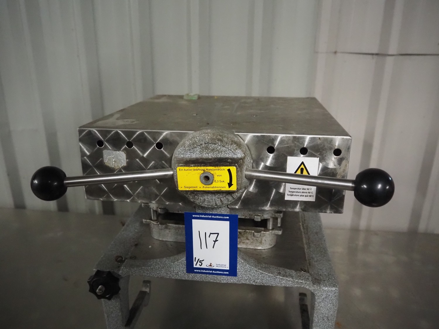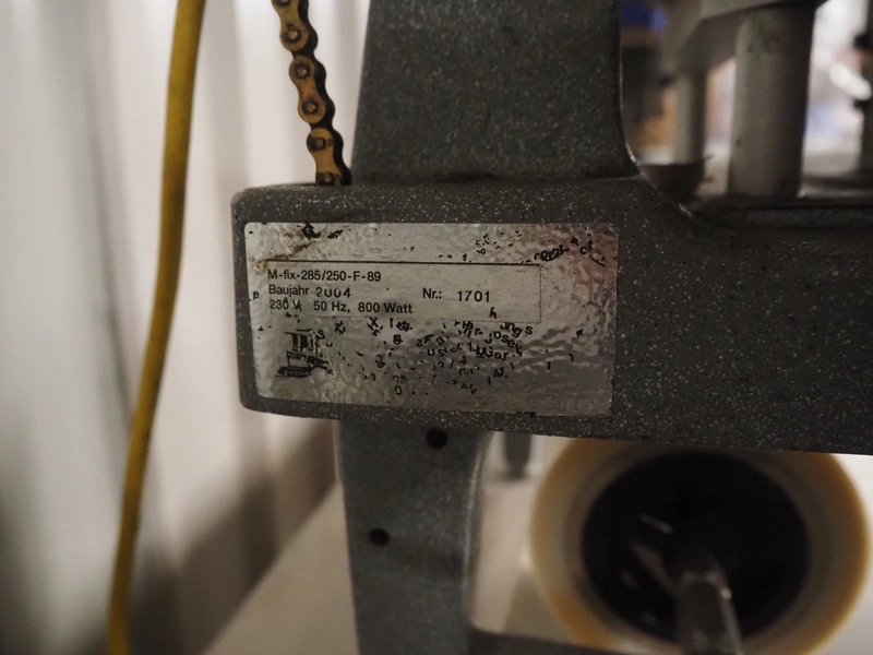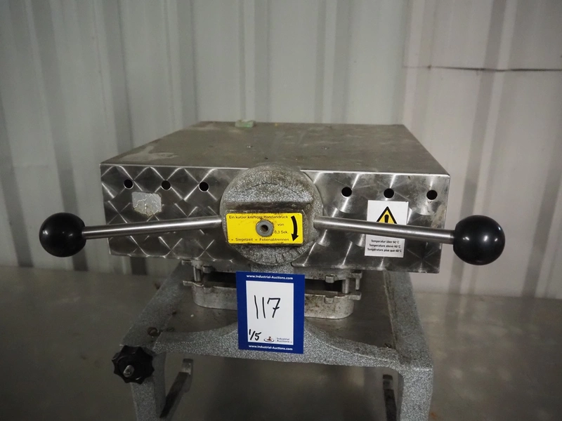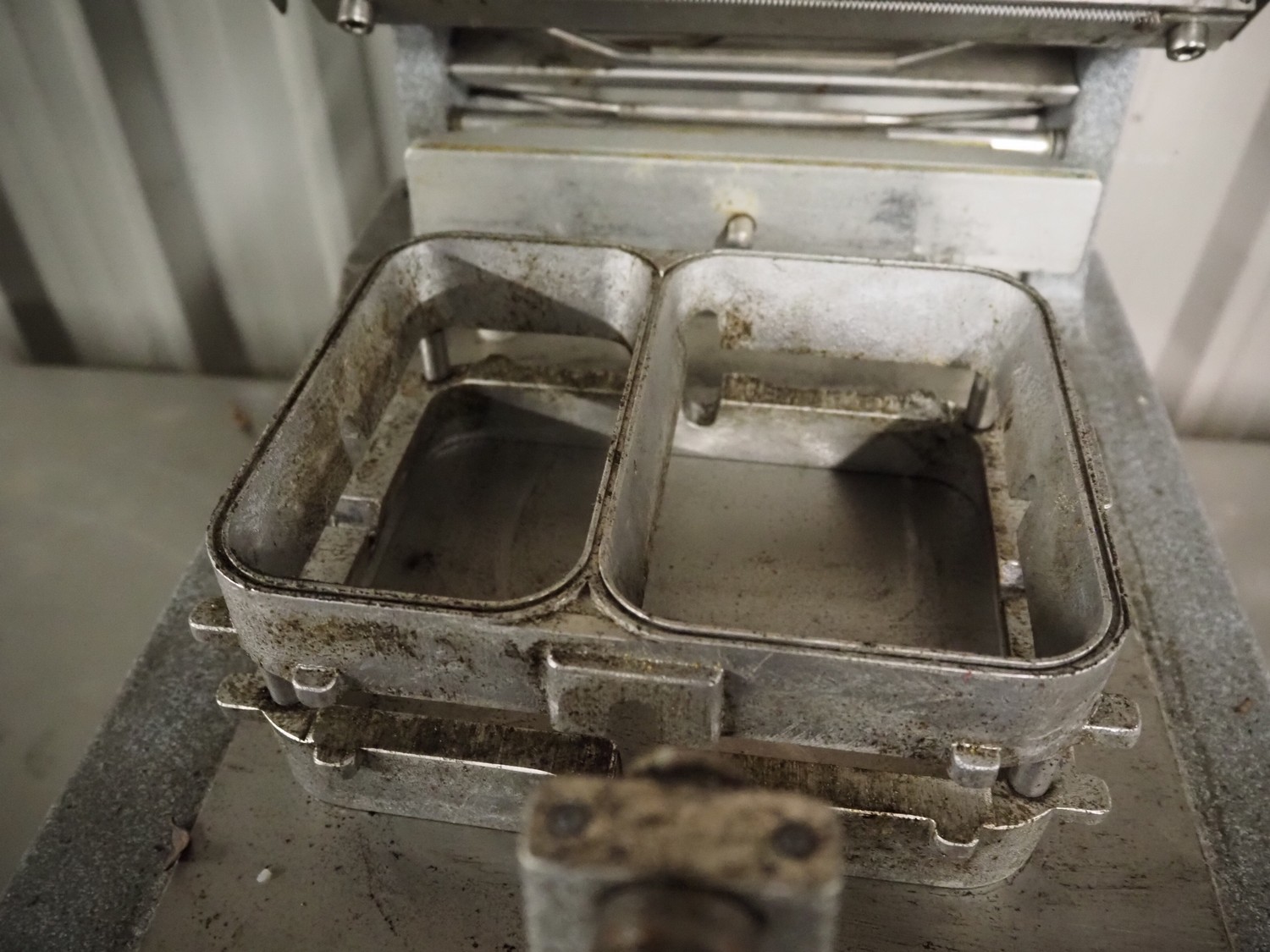 A.L.X.-Metall traysealer, model: M-fix-285/250-F-89, number: 1701, year of construction: 2004, 230 V, 50 Hz, 800 W, dimensions dye: 210 mm x 160 mm, total dimensions: 370 mm x 450 mm x 450 mm. Including 4 boxes with trays.