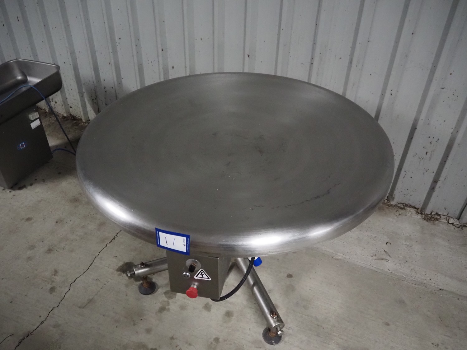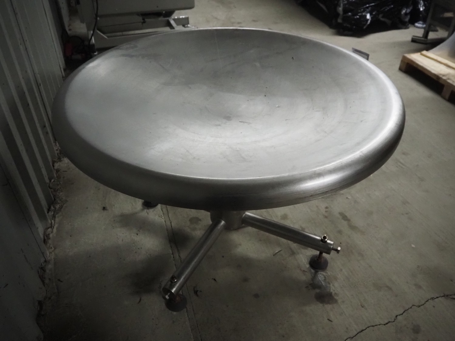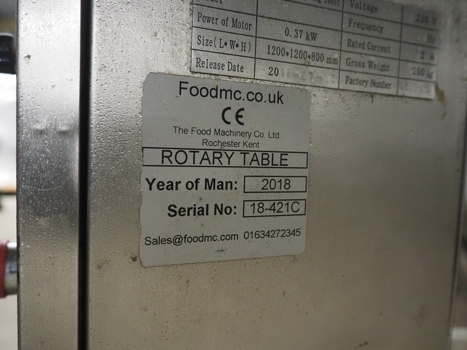 The Food Machinery Co. Ltd. s/s turning table, serial number: 18-421C, year of construction: 2018, 220 V, 50 Hz, 2 A, 0,37 kW, weight: 250 kg, table diameter: Ø1200 mm, total dimensions: Ø1200 mm x 800 mm.