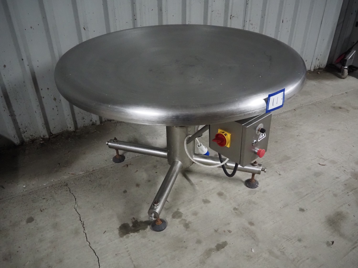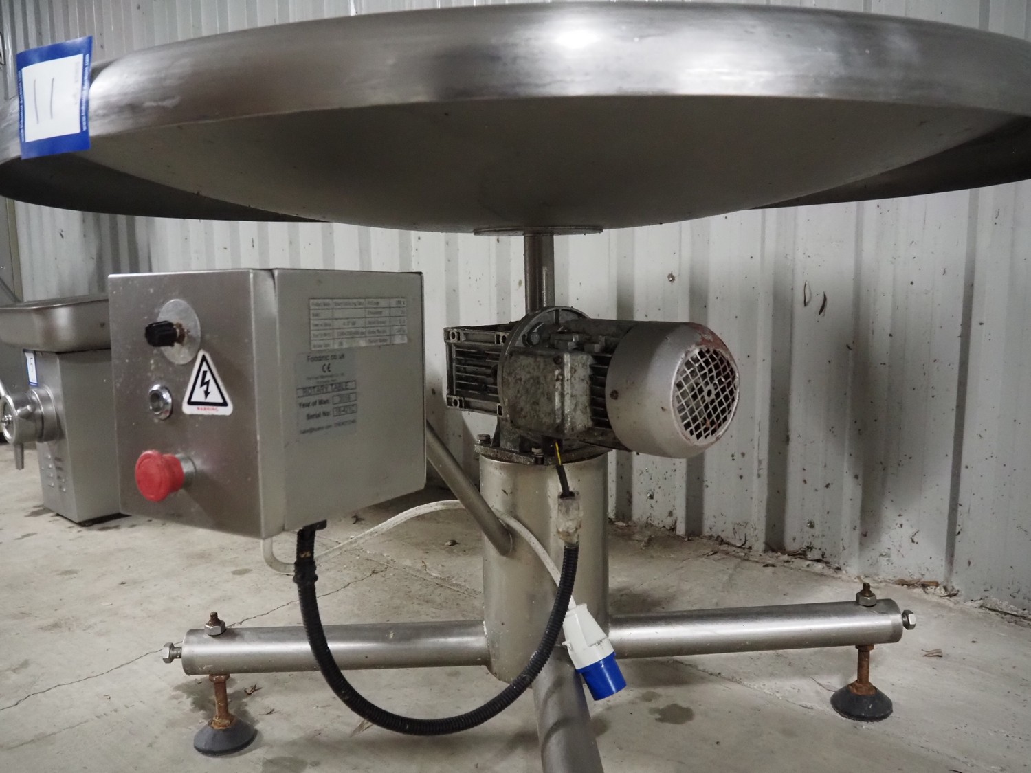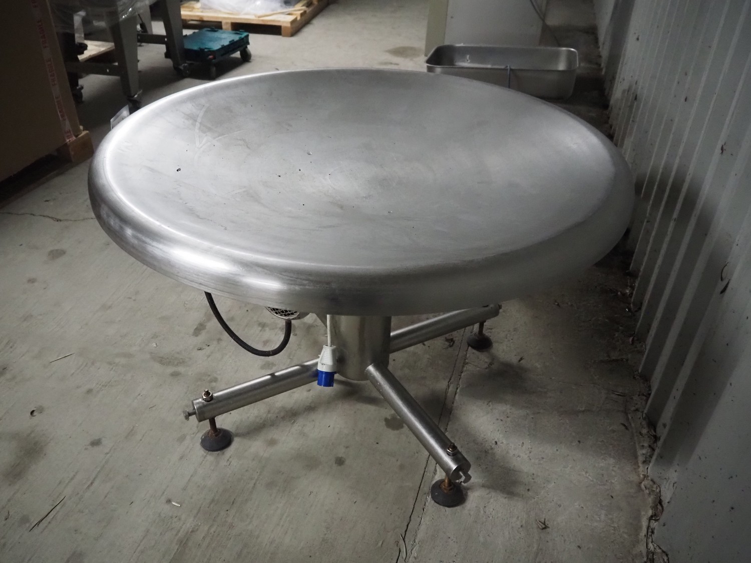 The Food Machinery Co. Ltd. s/s turning table, serial number: 18-421C, year of construction: 2018, 220 V, 50 Hz, 2 A, 0,37 kW, weight: 250 kg, table diameter: Ø1200 mm, total dimensions: Ø1200 mm x 800 mm.