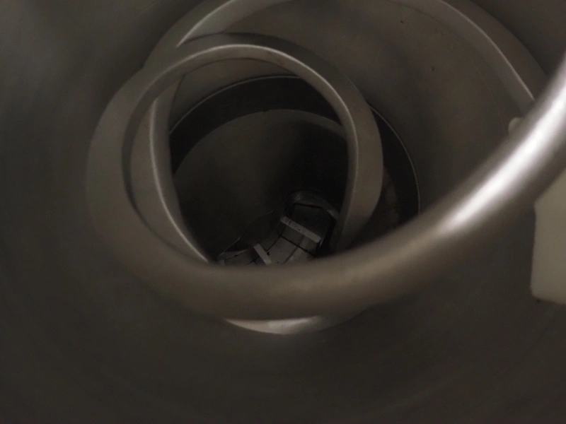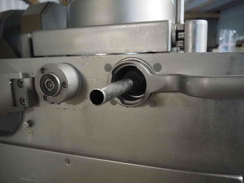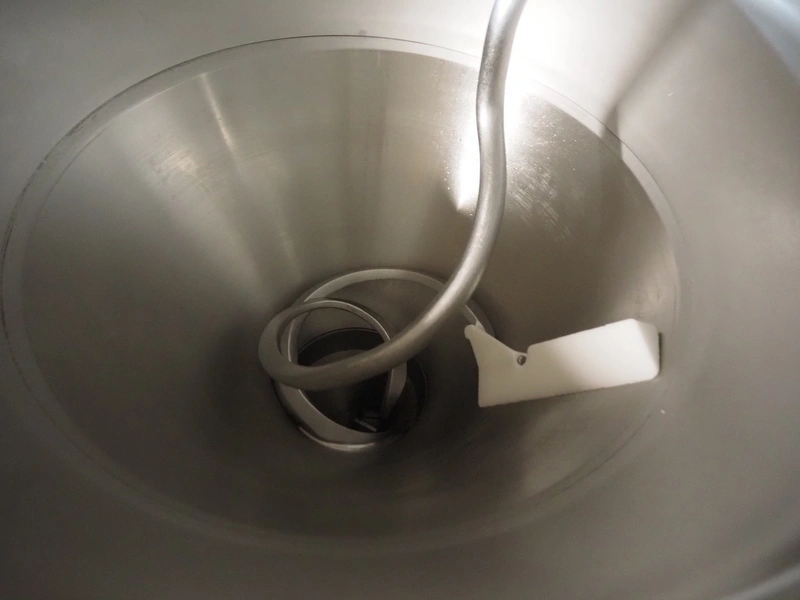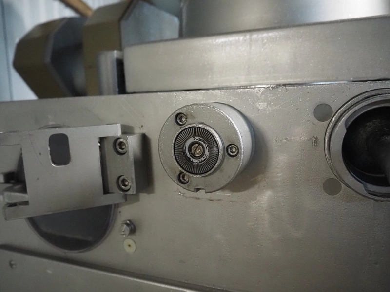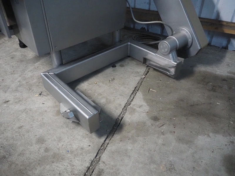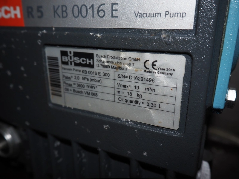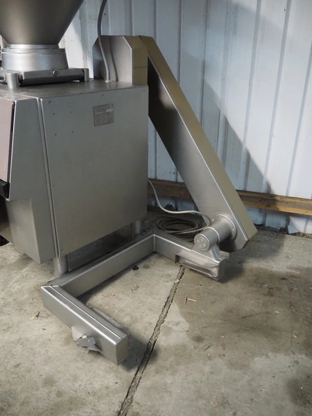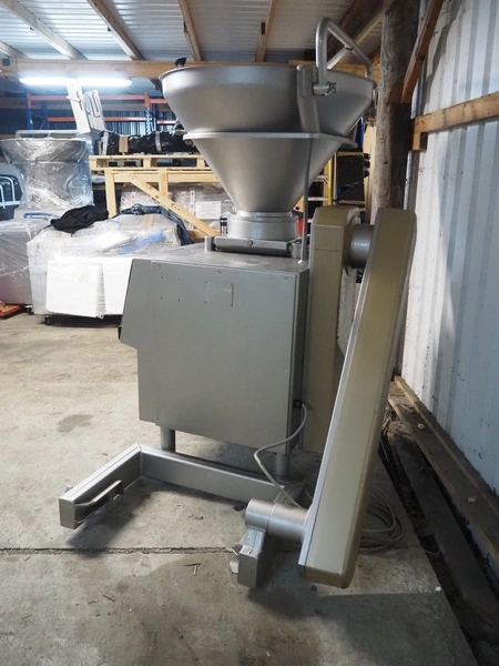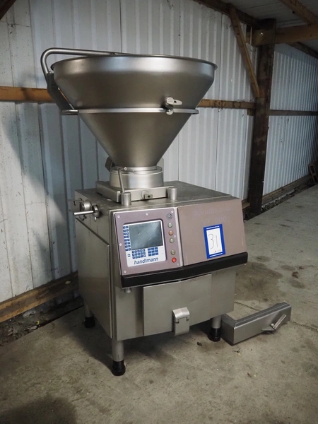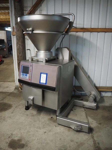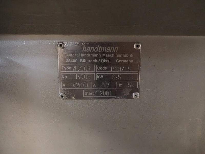Handtmann vacuum filling machine wilt lifter for 200 liter meat bins, type: VF200B, serial number: 14006, year of construction: 2001, 420 V, 3 Ph, 50 Hz, 17 A, 6.5 kW, Busch vacuum pump, type: KB 0016 E 300, capacity: 19 m³ per hour, total dimensions: 1600 mm x 1400 mm x 2100 mm. Technical condition unknown.
