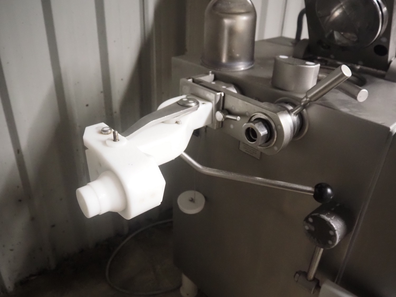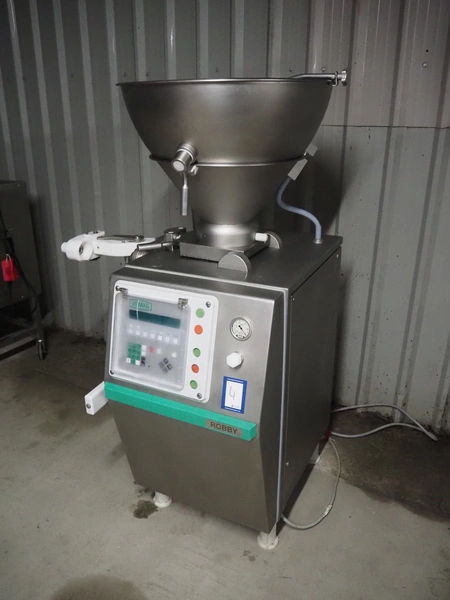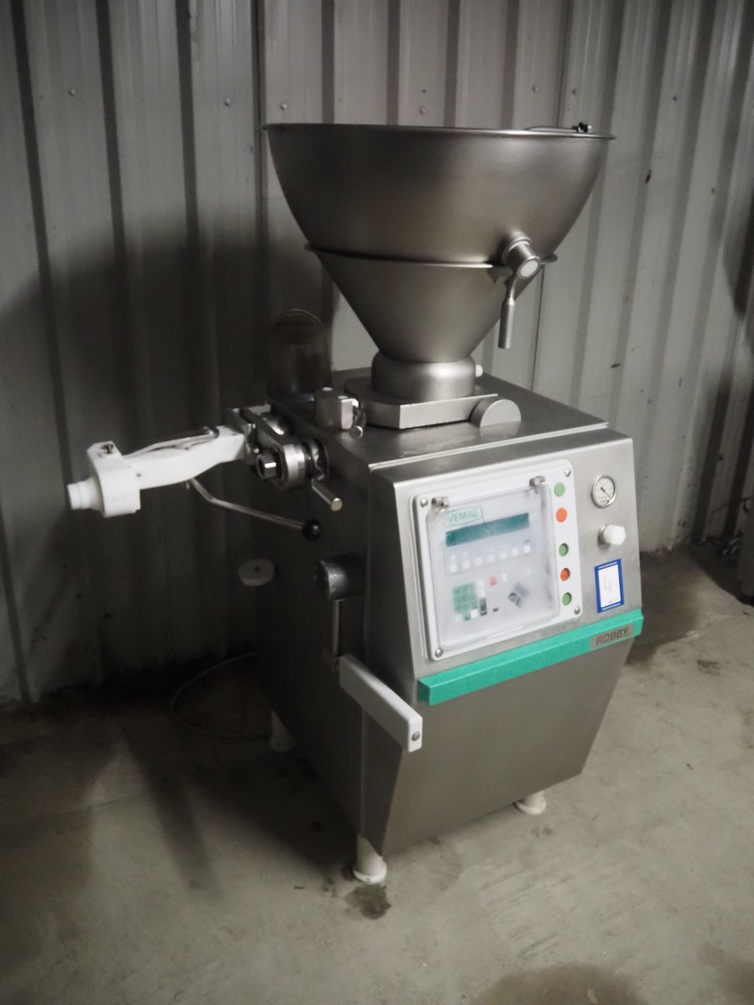 Vemag Maschinenbau GmbH vacuum filling machine with linking and case holding device, model: Robby, type: 134, serial number: 134 1305, 220-240 / 400-460 V3 Ph, 50/60 Hz, 11 / 20 / 25 A, type case holding device: 859-0, serial number: 0045, type case holding device: 8021175, Rietschle vacuum pump, total dimensions: 1120 mm x 930 mm x 1640 mm.