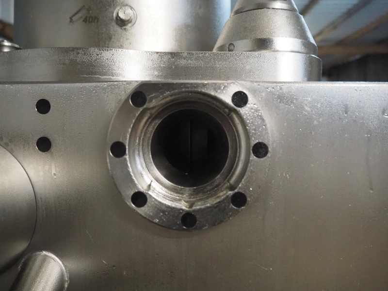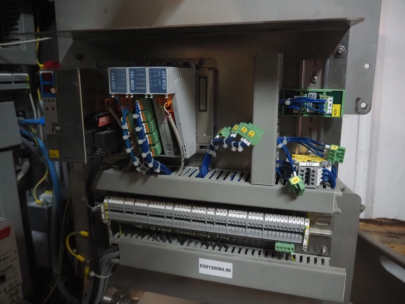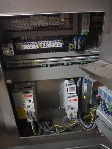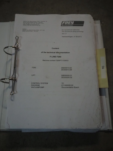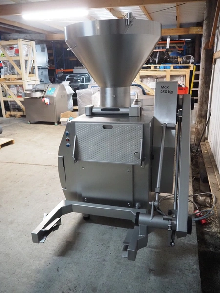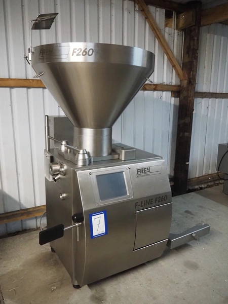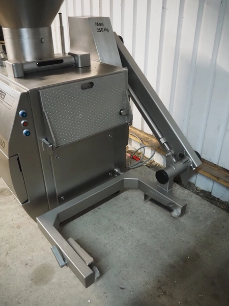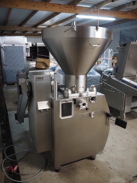 Frey Maschinenbau GmbH vacuum filling machine with lifter for 200 liter meat bins, type: F-line F260, serial number: F20PT1152833, year of construction: 2013, 400 V, 50/60 Hz, 45 kW, total dimensions: 1900 mm x 1180 mm x 2250 mm.