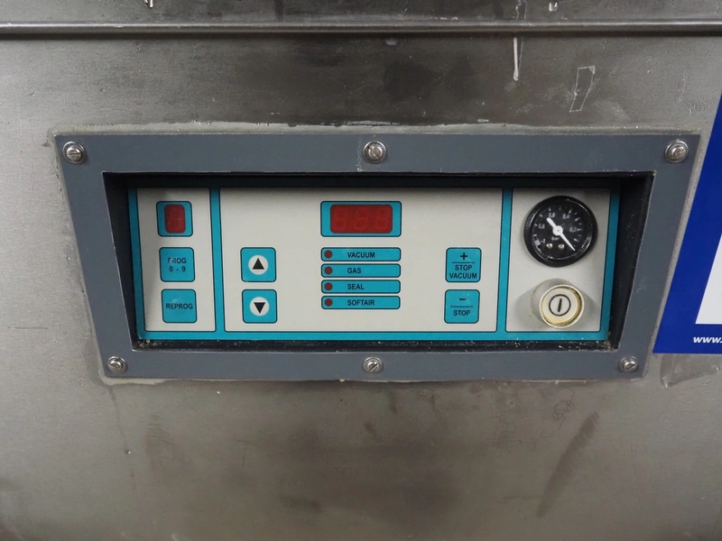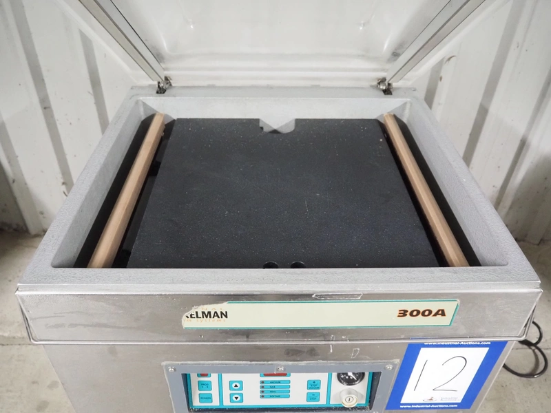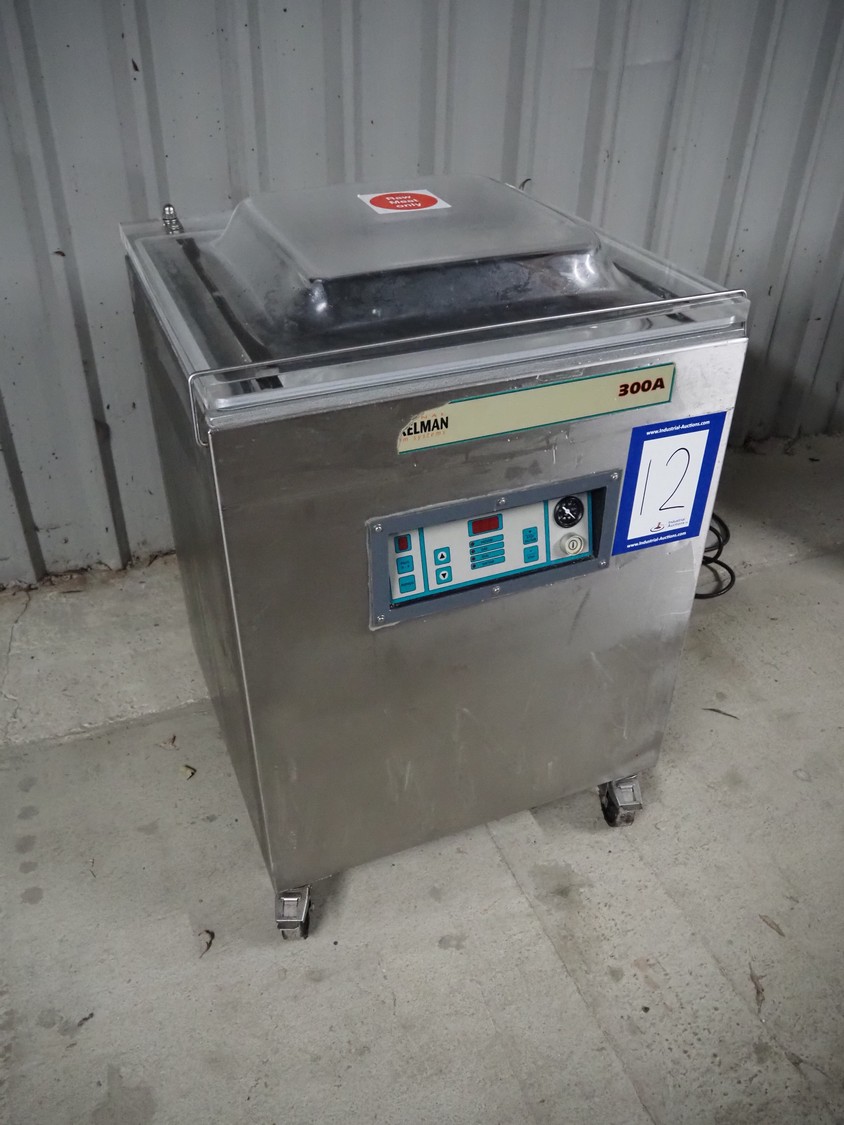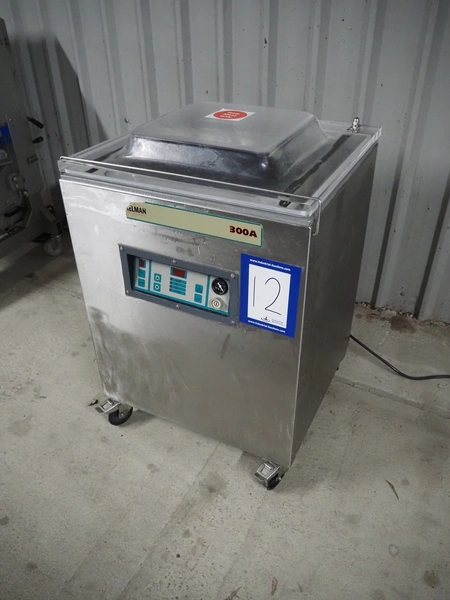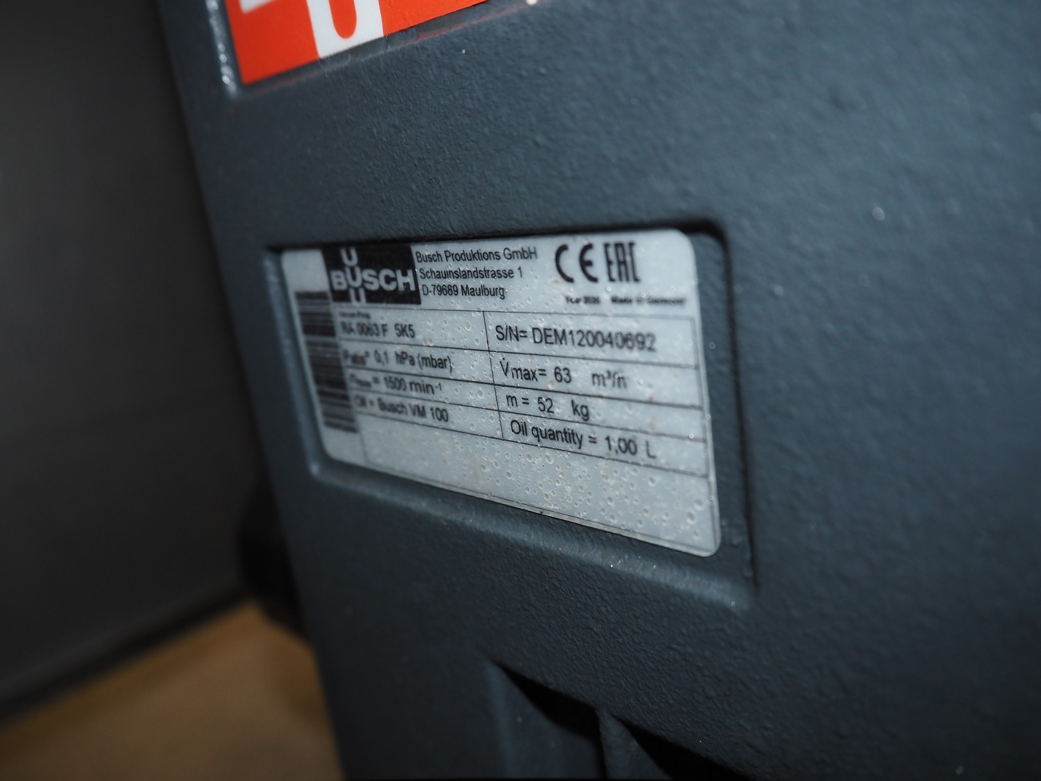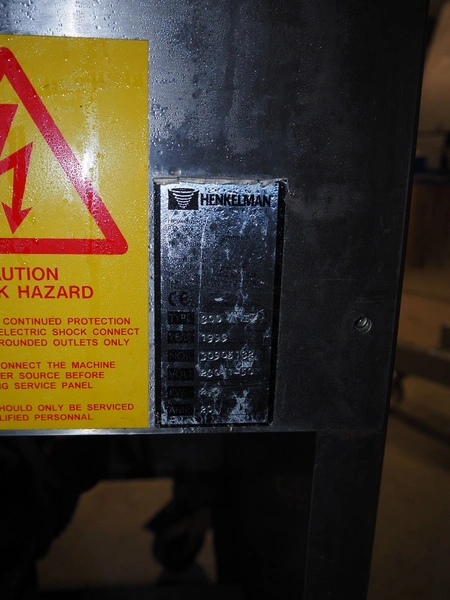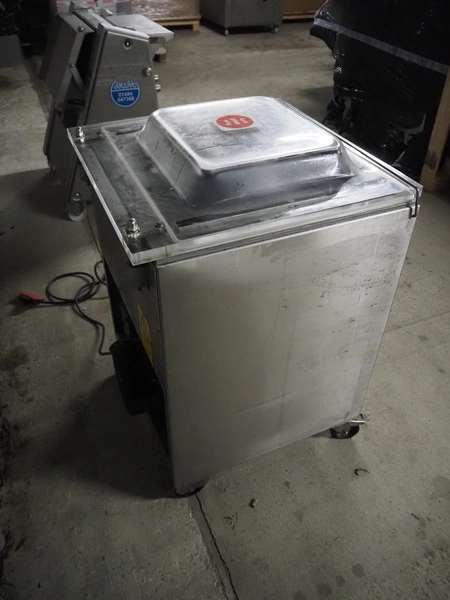 Henkelman mobile vacuum machine, type: 300 A+II, serial number: 30905132, year of construction: 1999, 230 V, 1 Ph, 50 Hz, 20 A, 2.9 kW, chamber dimensions: 505 mm x 530 mm, seal length: (2x) 510 mm, Busch vacuum pump, type: RA 0063 F 5K5, capacity: 63 m³ per hour, total dimensions: 700 mm x 680 mm x 1050 mm.