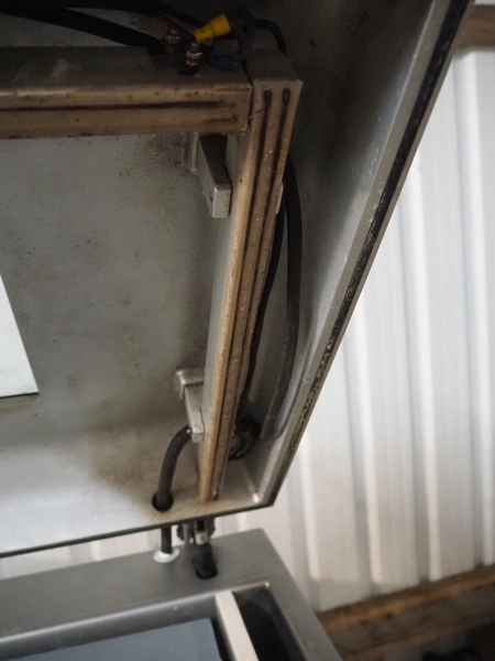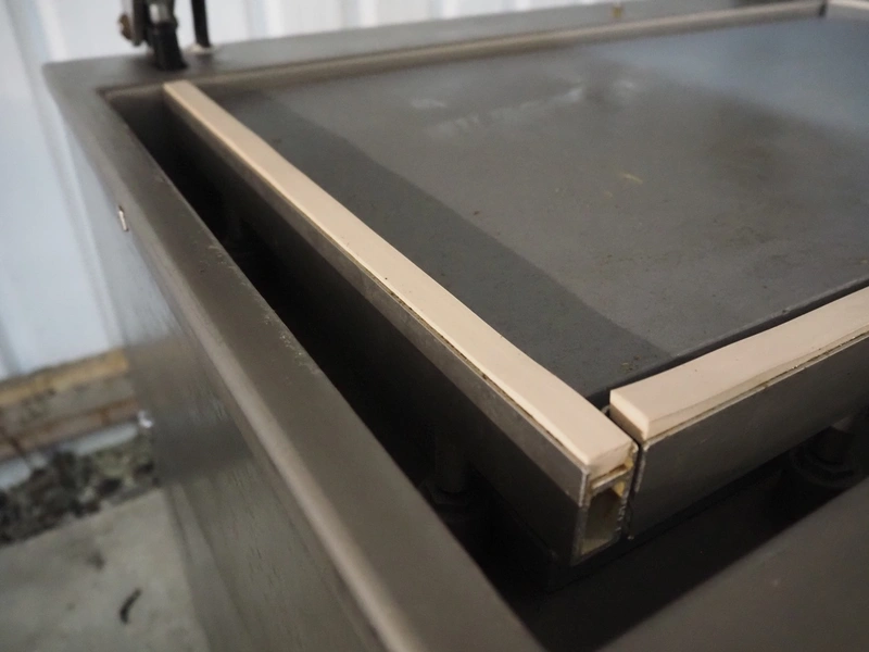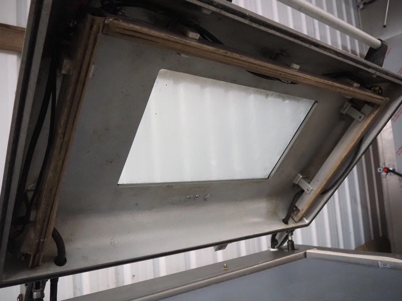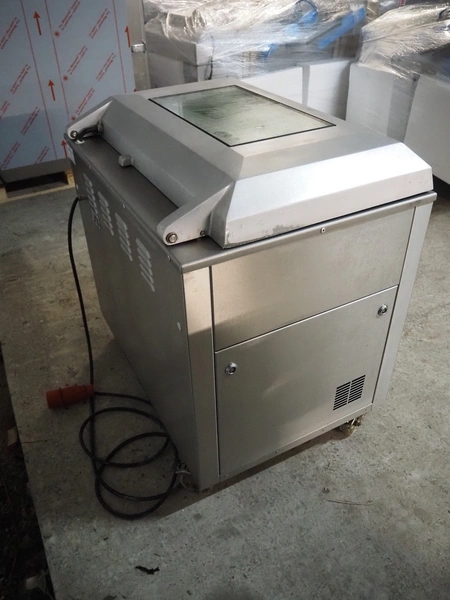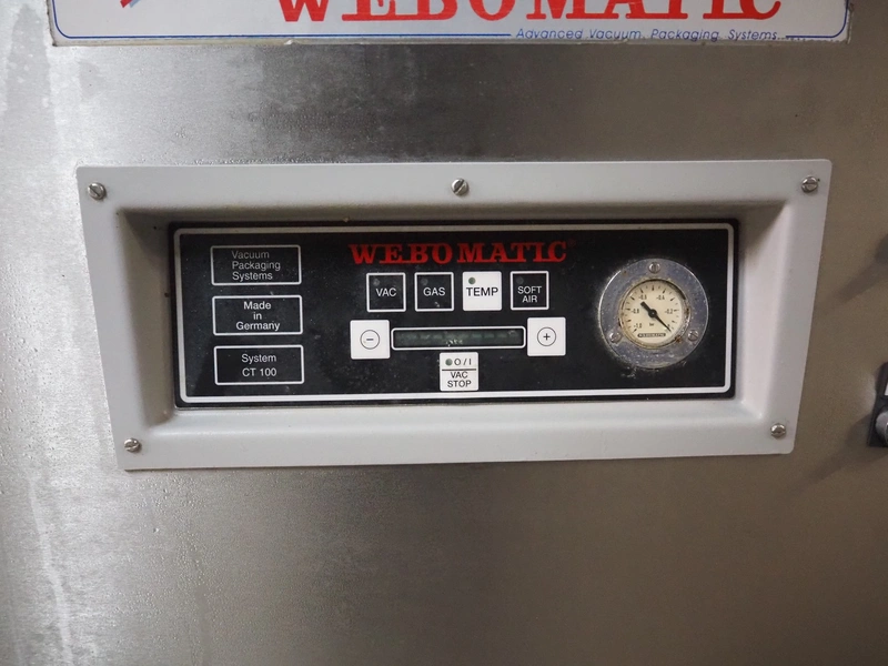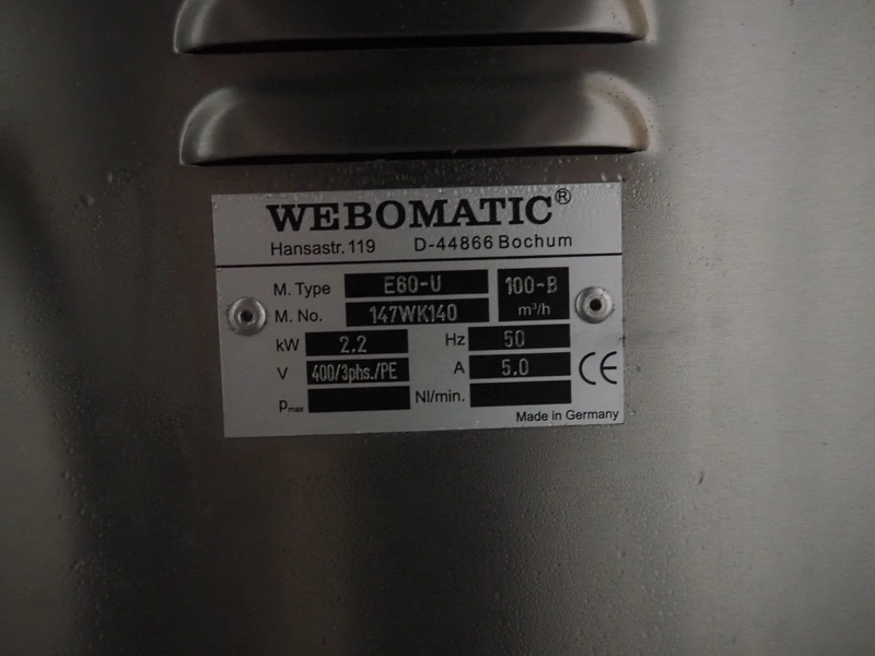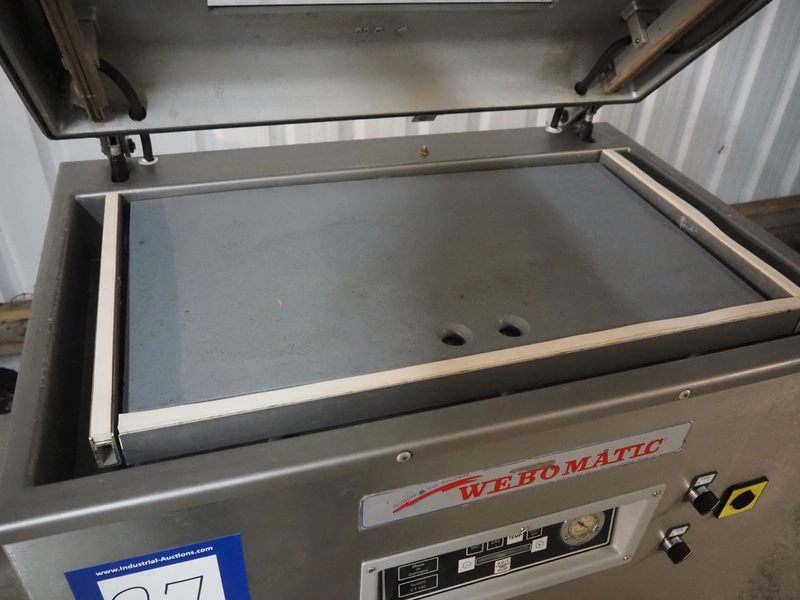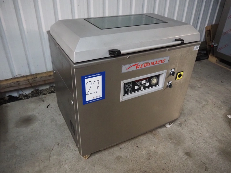 Webomatic mobile vacuum machine, type: E60-U, serial number: 147WK140, 400 V, 3 Ph, 50 Hz, 5 A, 2.2 kW, chamber dimensions: 780 mm x 510 mm, seal length: (2x) 465 mm and (2x) 775 mm, Busch vacuum pump, type: RA 0100 F 503, capacity: 100 m³ per hour, total dimensions: 960 mm x 670 mm x 950 mm.