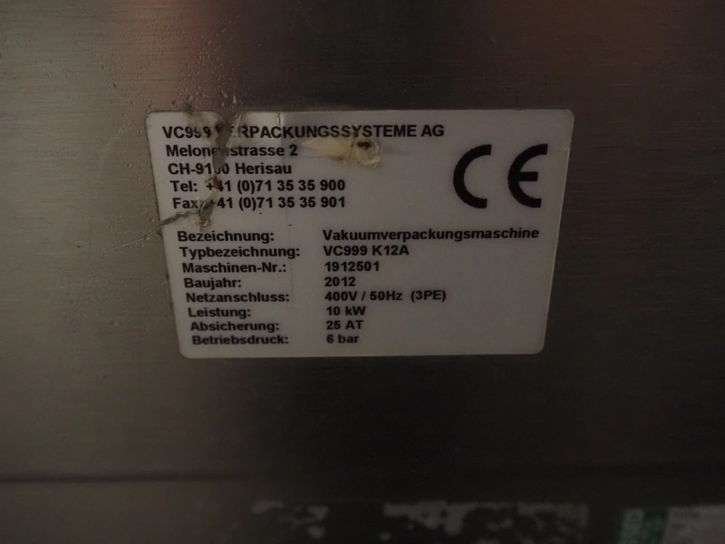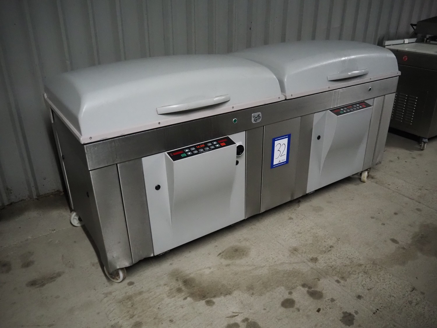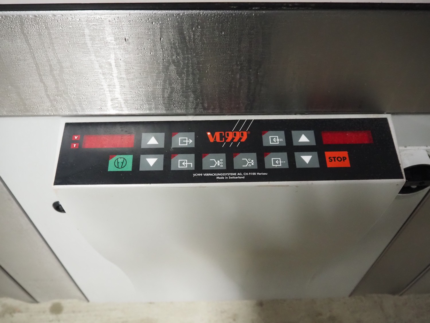 VC999 verpackungssysteme AG mobile double chamber vacuum machine, type: VC999 K12A, serial number: 1912501, year of construction: 2012, 400 V, 3 Ph, 50 Hz, 10 kW, 6 bar, chamber dimensions: (2x) 940 mm x 500 mm, seal length: (4x) 500 mm and (2x) 900 mm, 2 Rietschle vacuum pumps, total dimensions: 2220 mm x 950 mm x 1080 mm.
