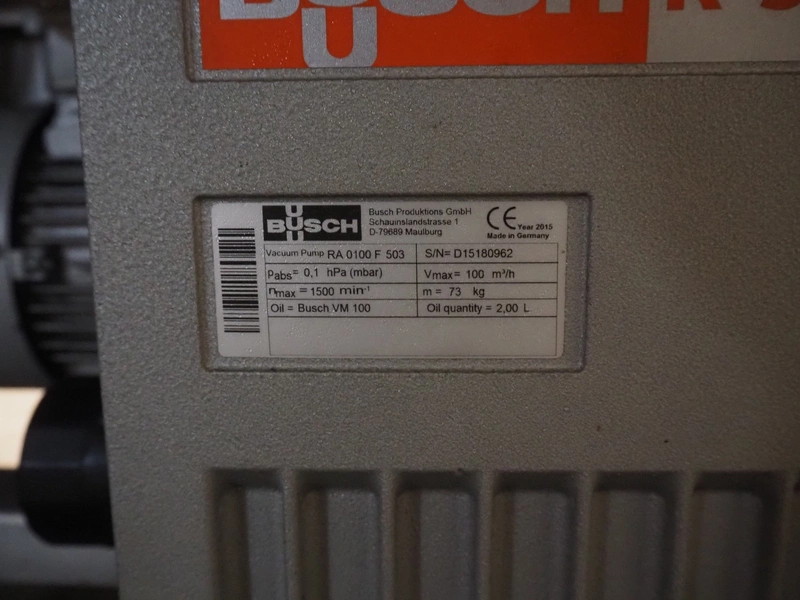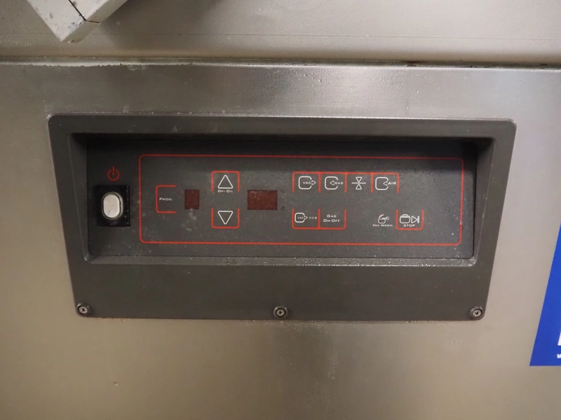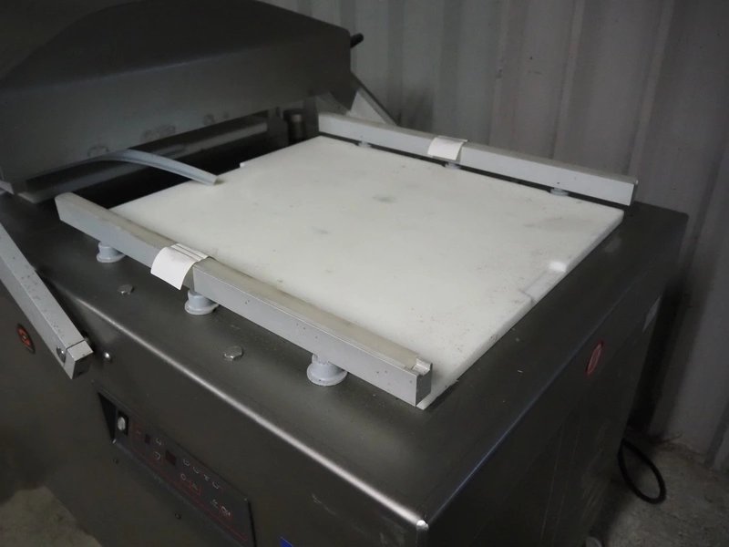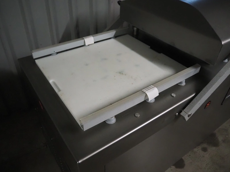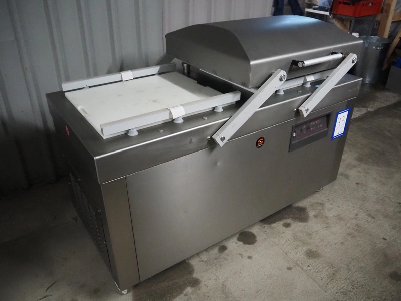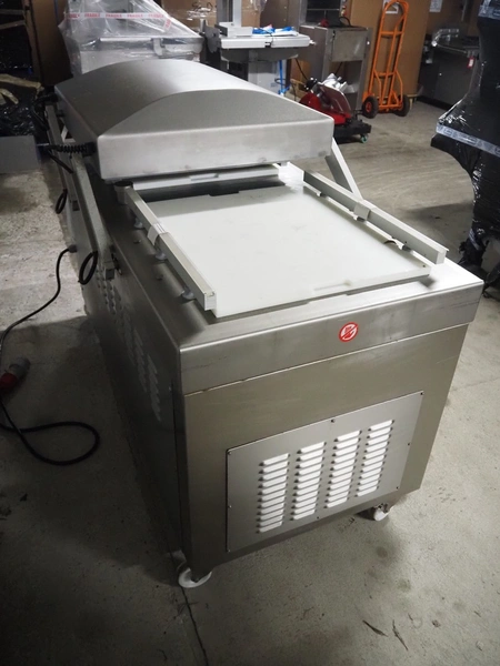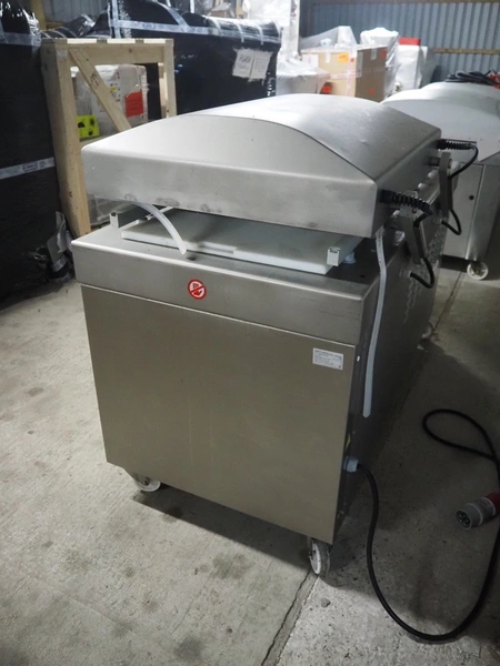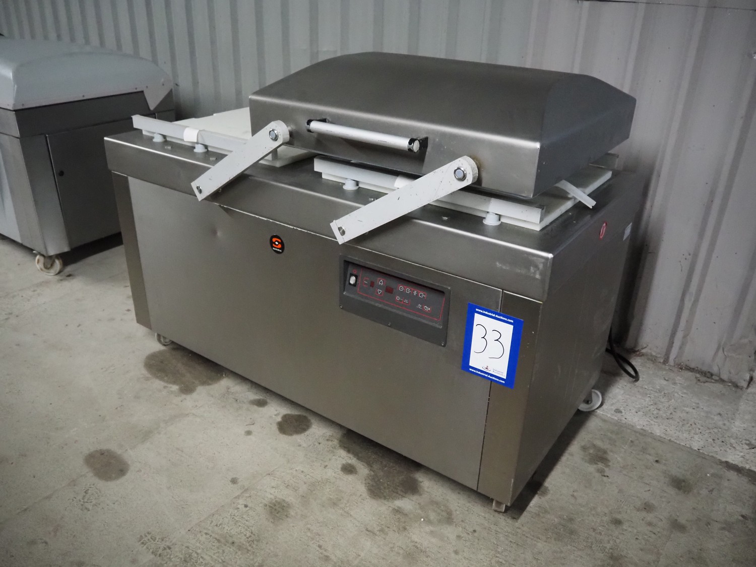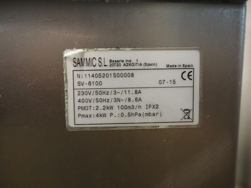 Sammic S.L. mobile double chamber vacuum machine, type: SV-6100, serial number: 11405201500008, 230/400 V, 3 Ph, 50 Hz, 8.6/11.8 A, 4 kW, 0.5 hPa, capacity: 100 m³/h, chamber dimensions: (2x) 560 mm x 675 mm, seal length: (4x) 675 mm, with Busch vacuum pump, type: RA 0100 F 503, capacity: 100 m³ per hour, total dimensions: 1650 mm x 900 mm x 1150 mm.