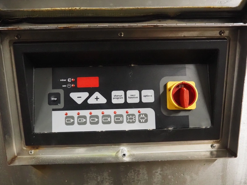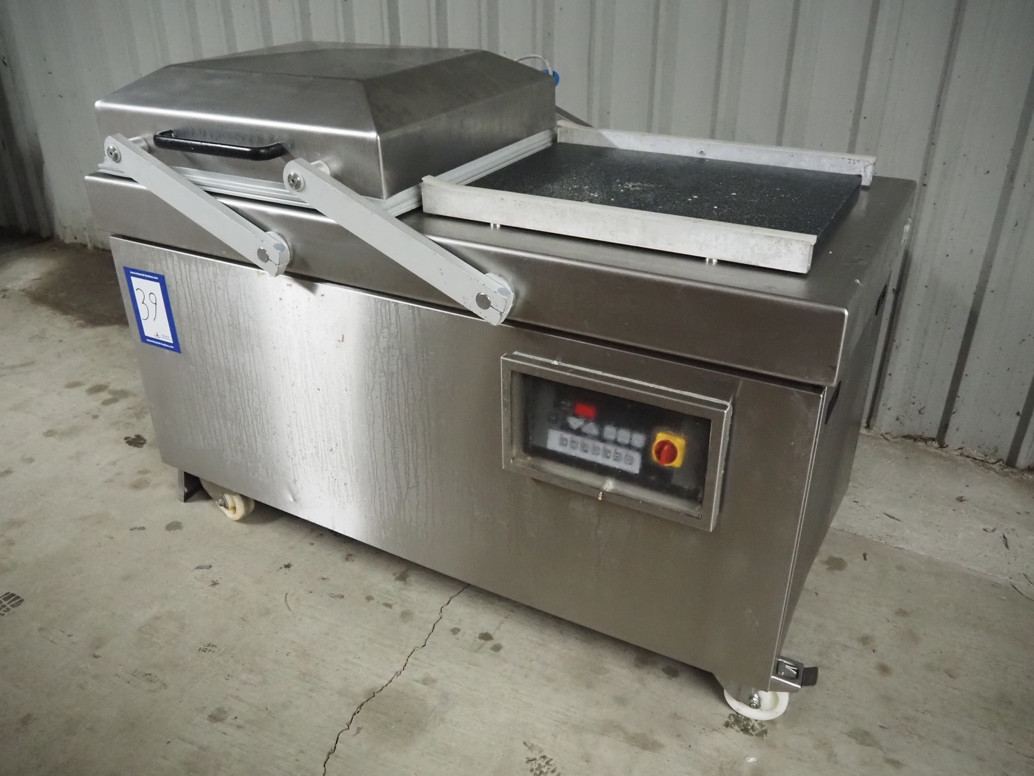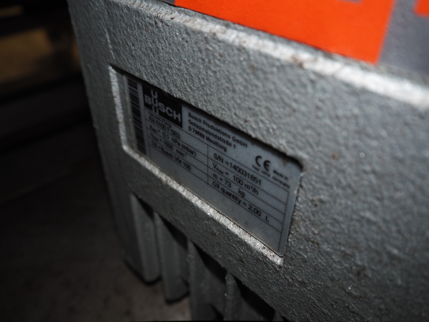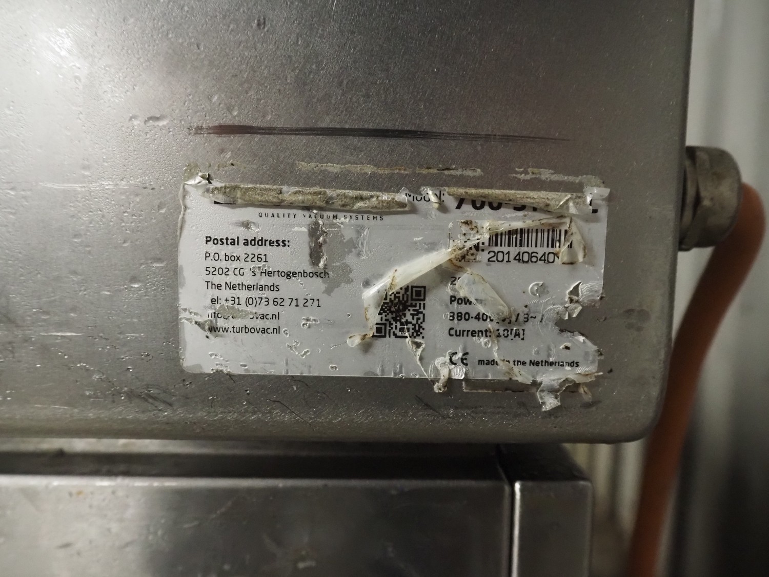 Turbovac mobile double chamber vacuum machine, type: ST-700, year of construction: 2014, 380-400 V, 3 Ph, 10 A, chamber dimensions: (2x) 700 mm x 515 mm, seal length: (4x) 700 mm, Busch vacuum pump, type: RA 0100 F 5R3, capacity: 100 m³ per hour, total dimensions: 1620 mm x 880 mm x 1260 mm. Broken cover.
