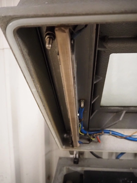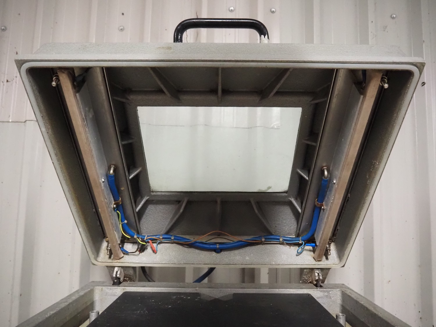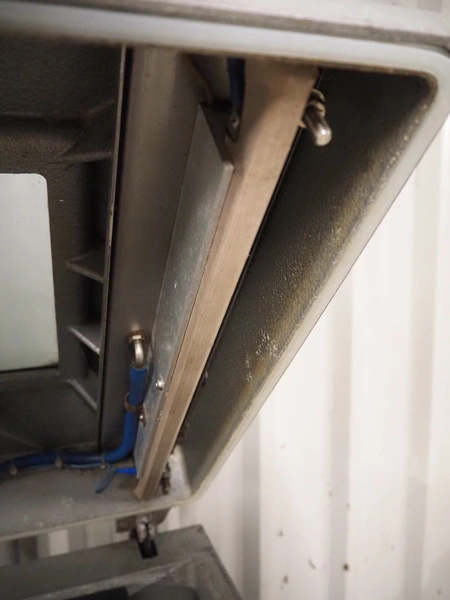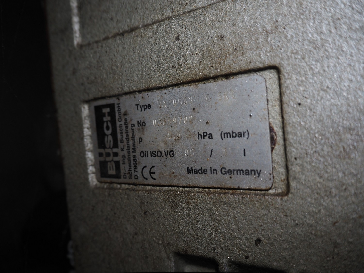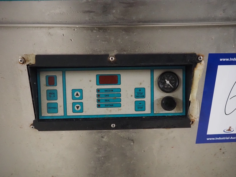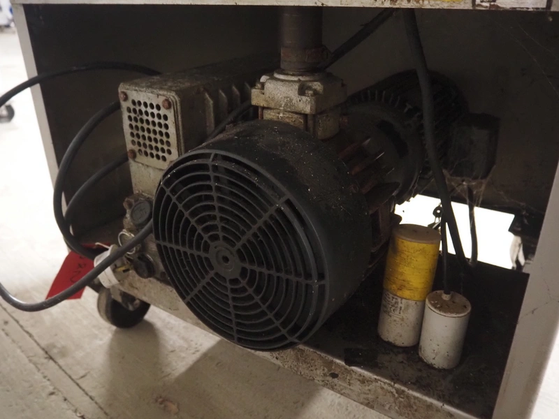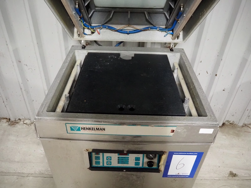 Henkelman mobile vacuum machine, type: 300 AA, serial number: 3100, year of construction: 2001, 240 V, 1 Ph, 50 Hz, 20 A, 2.3 kW, chamber dimensions: 500 mm x 500 mm, seal length: (2x) 510 mm, Busch vacuum pump, type: RA 0063 E 5K6, capacity: 63 m³ per hour, total dimensions: 700 mm x 700 mm x 1090 mm.
