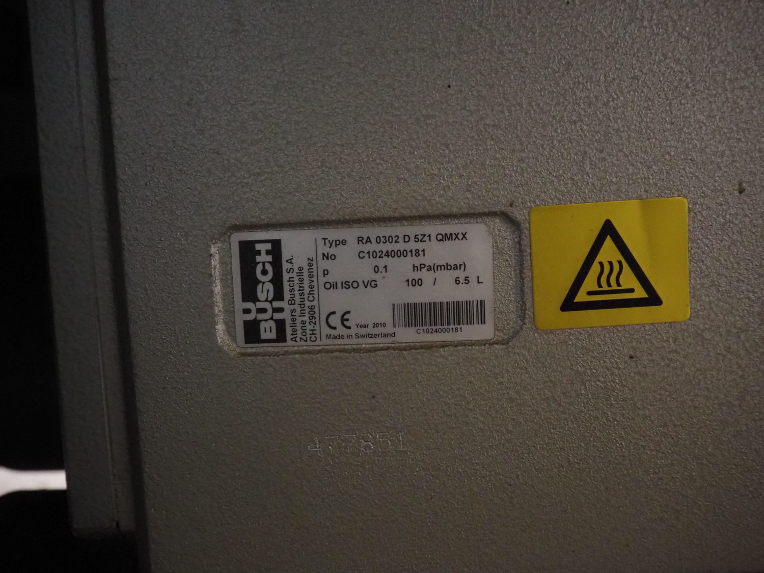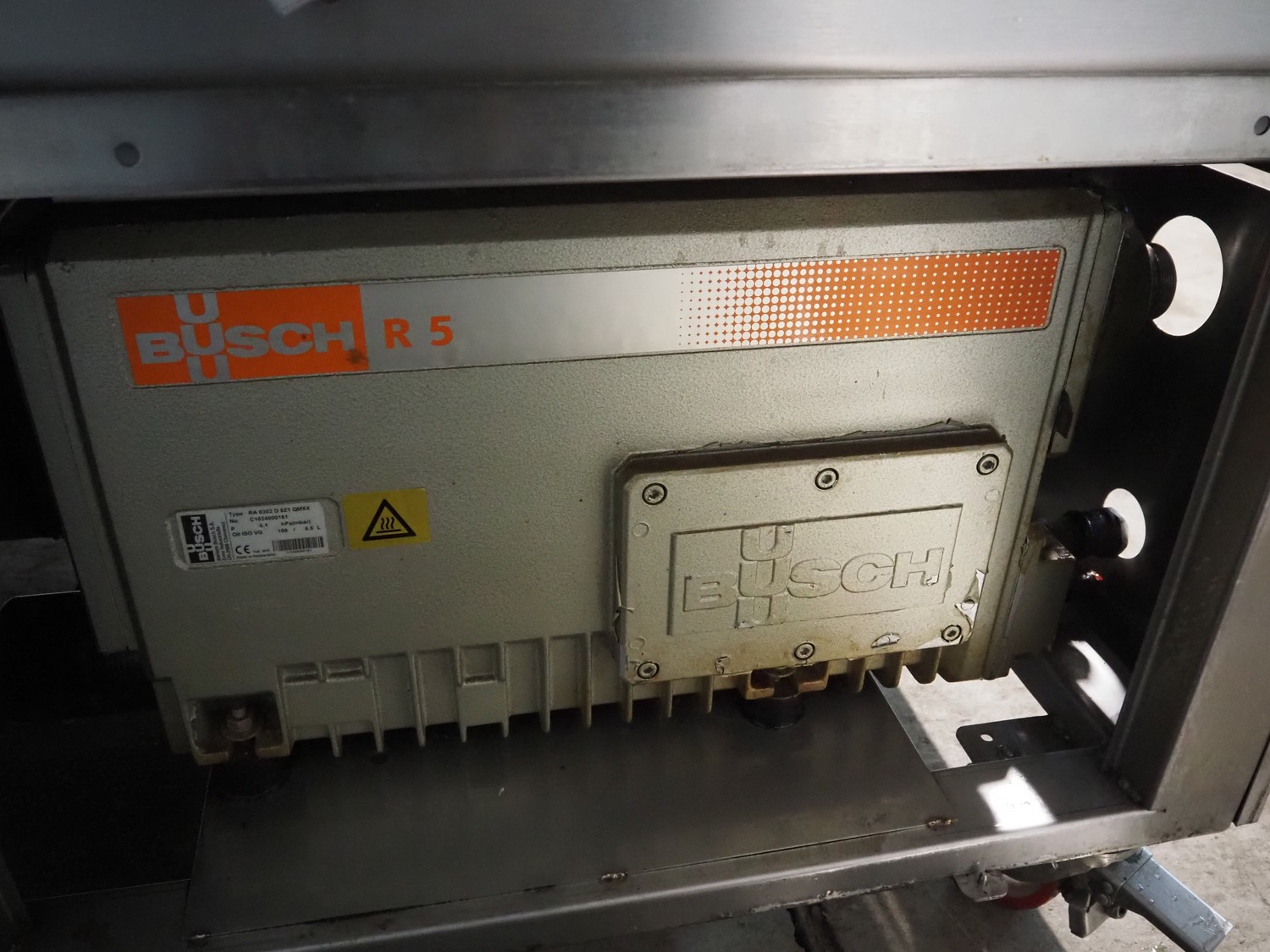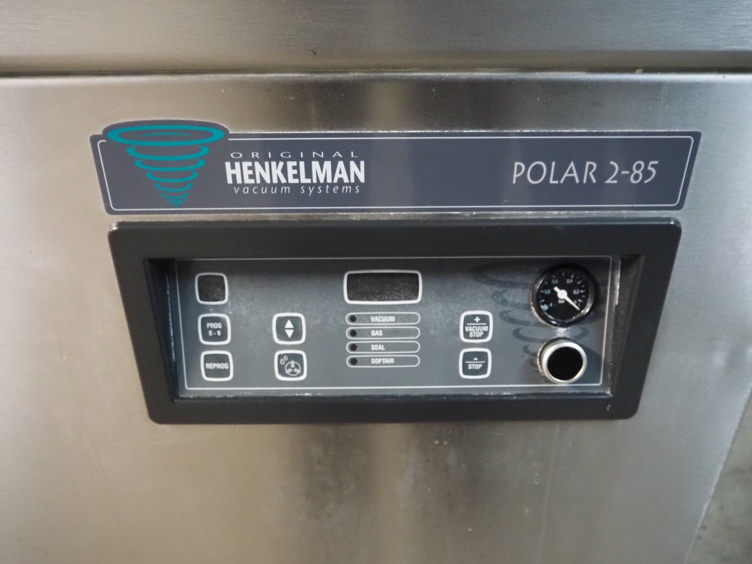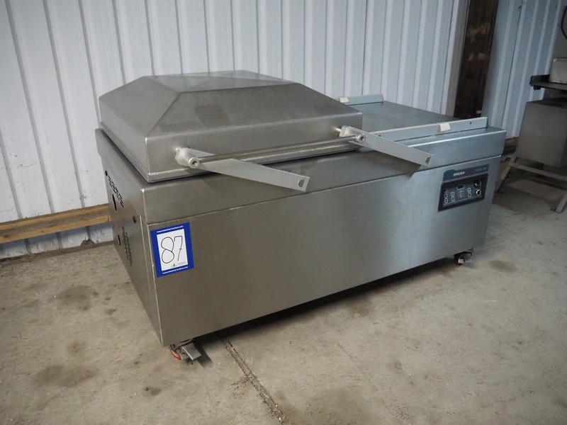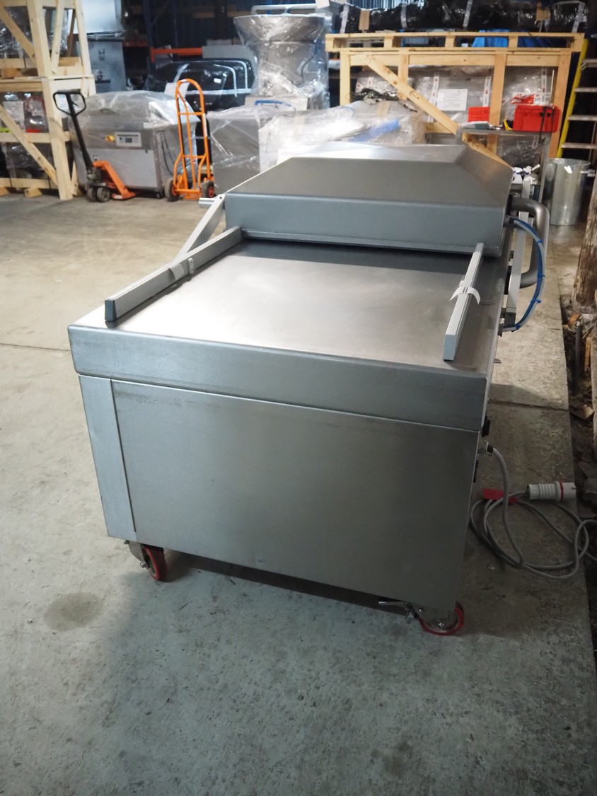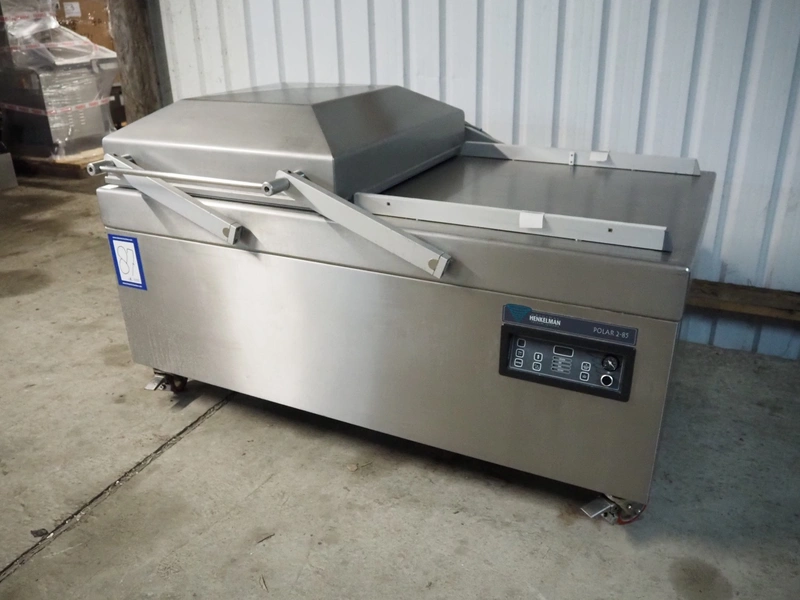 Henkelman mobile double chamber vacuum machine, type: Polar 2-85, machine number: P501007065, year of construction: 2010, 400 V, 3 Ph, 50 Hz, 20.5 A, 7 kW, chamber dimensions: (2x) 900 mm x 900 mm, seal length: (4x) 835 mm, Busch vacuum pump, type: RA 0302 D 5Z1 QMXX, capacity: 302 m³ per hour, total dimensions: 1900 mm x 1040 mm x 1230 mm.
