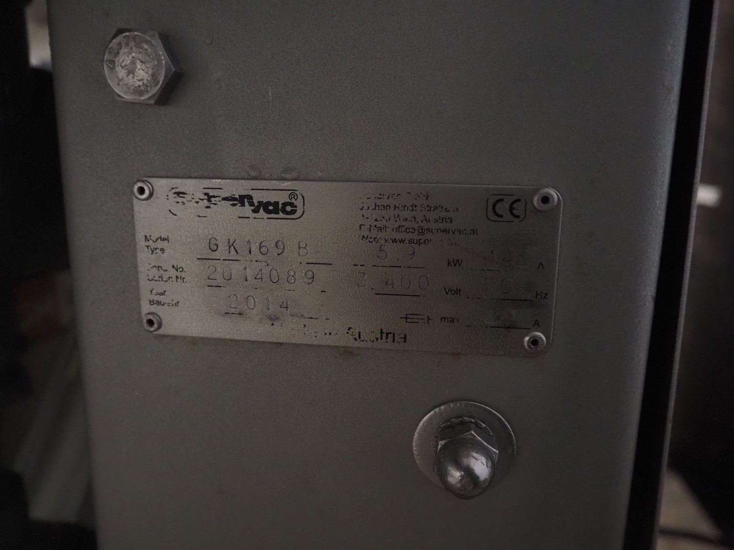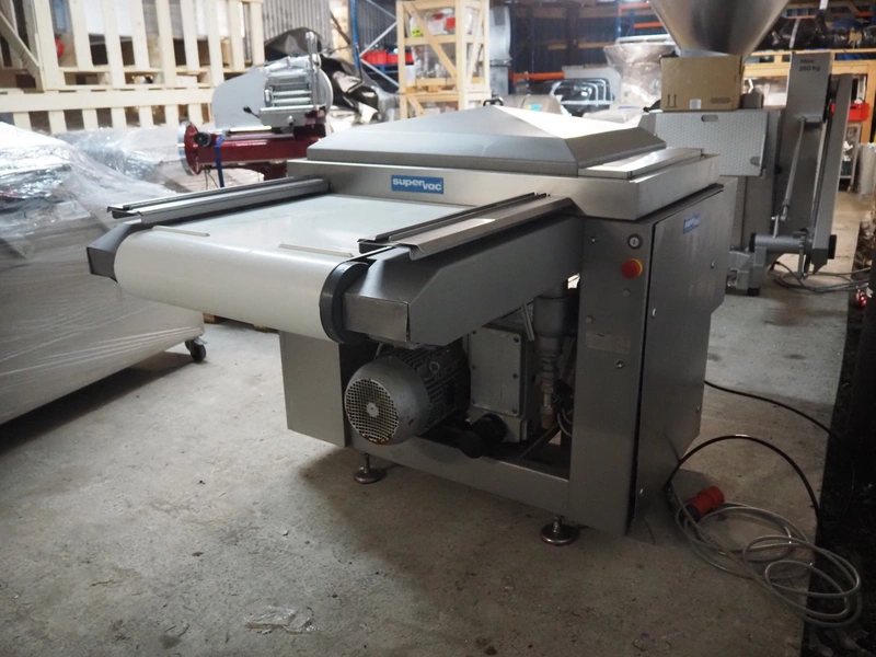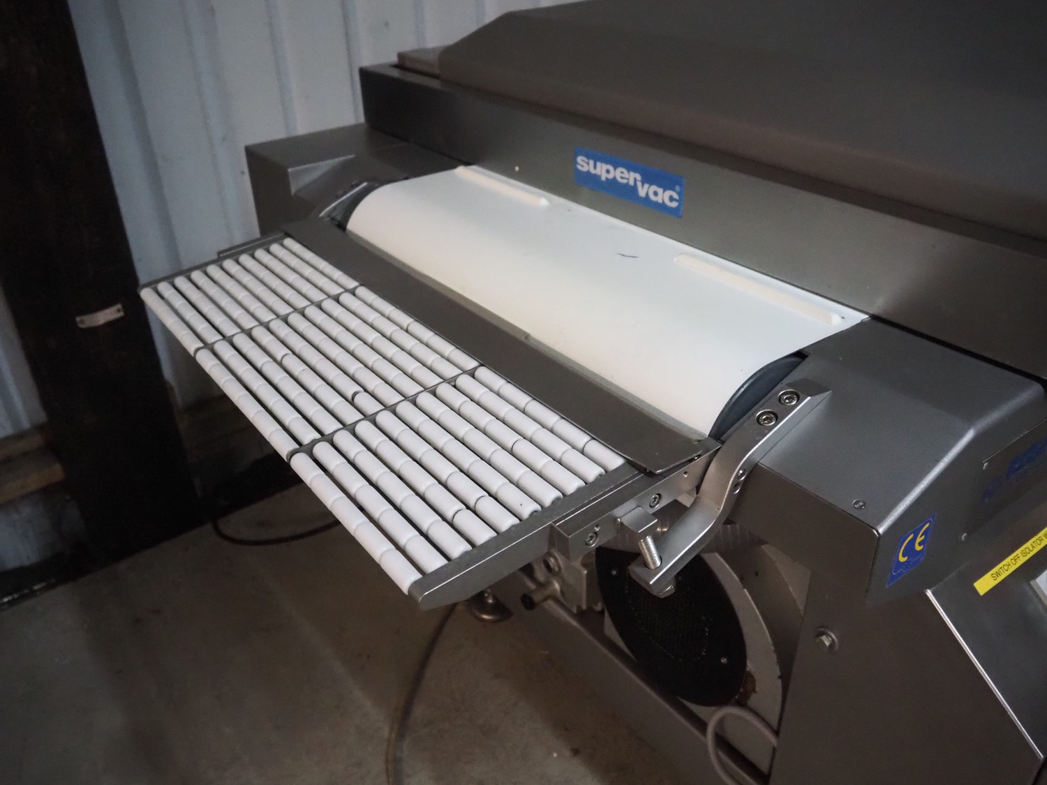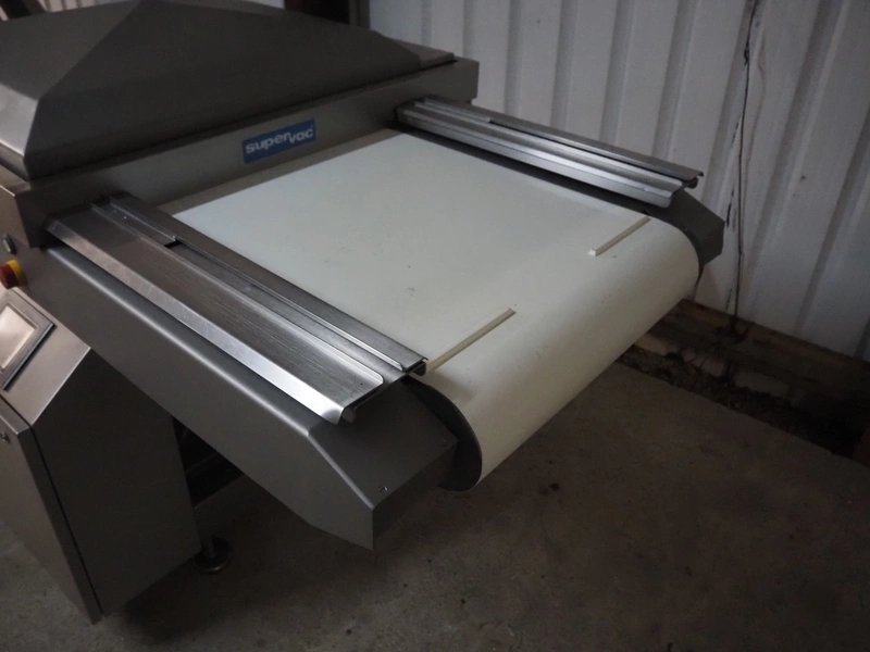 Supervac belt vacuum machine, model: GK169B, serial number: 2014089, year of construction: 2014, 400V, 50 Hz, 5,9 kW, Busch vacuum pump, plastic belt with dividers, belt width: 620 mm, divider width: 190 mm, divider height: 10 mm, total dimensions: 1950 mm x 1400 mm x 1230 mm.