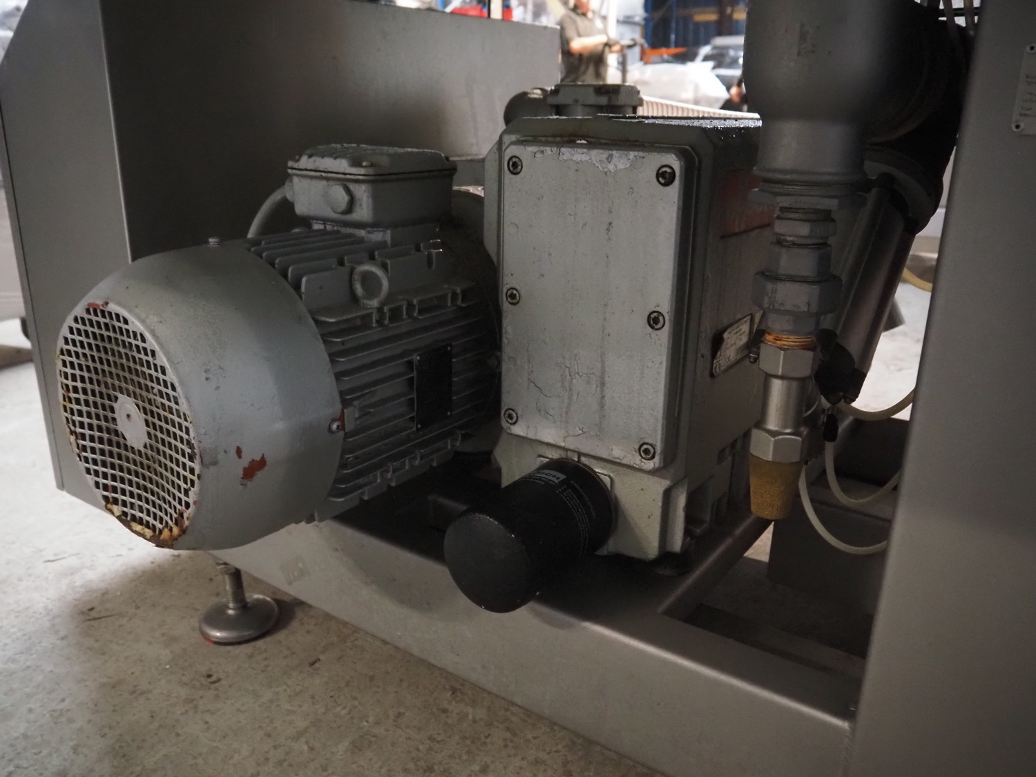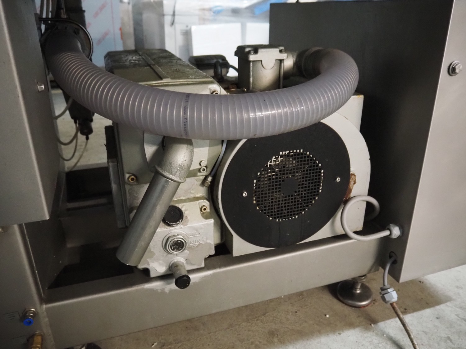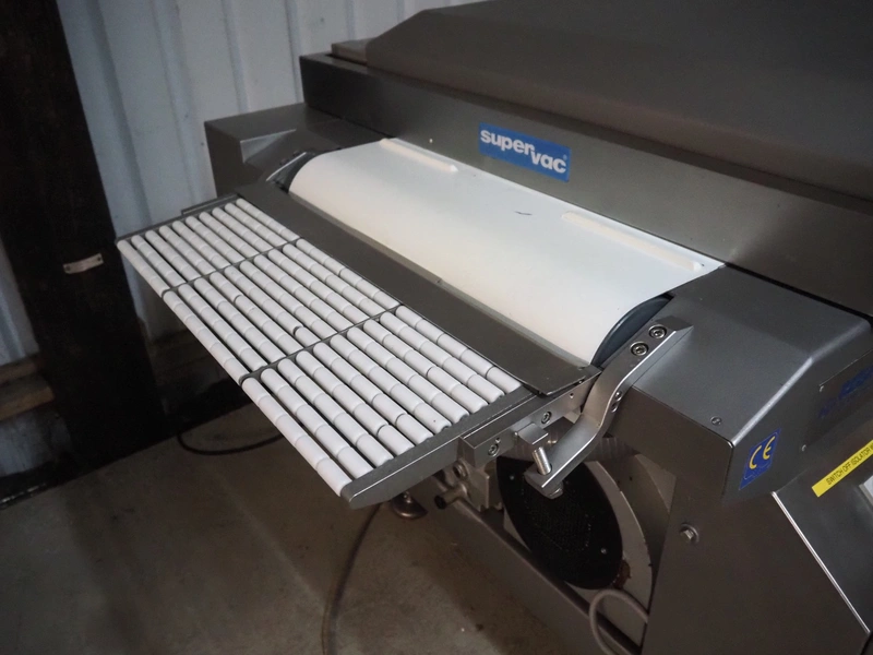Supervac belt vacuum machine, model: GK169B, serial number: 2014089, year of construction: 2014, 400V, 50 Hz, 5,9 kW, Busch vacuum pump, plastic belt with dividers, belt width: 620 mm, divider width: 190 mm, divider height: 10 mm, total dimensions: 1950 mm x 1400 mm x 1230 mm.
