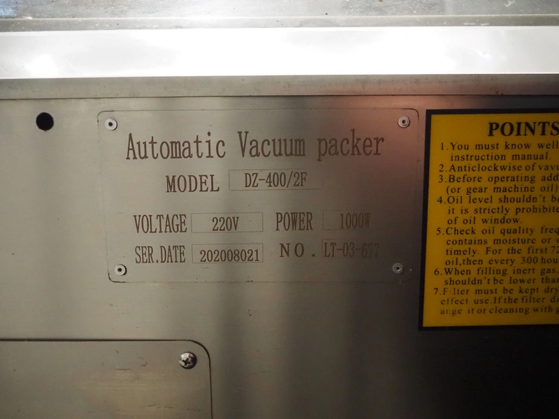 Vacuum machine, model: DZ-400/2F, serial number: number: LT-03-677, 220 V, 1000 W, chamber dimensions: 330 mm x 420 mm, seal length: 410 mm, total dimensions: 540 mm x 500 mm x 460 mm.