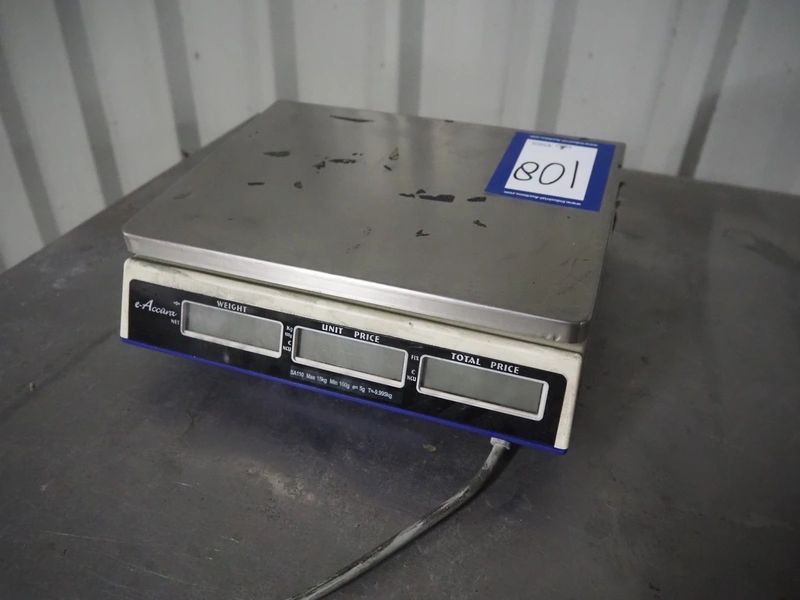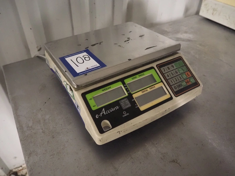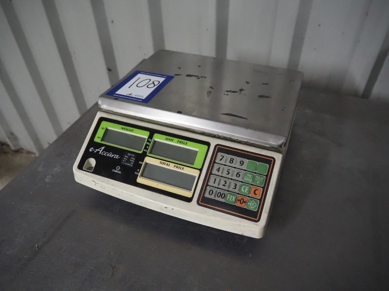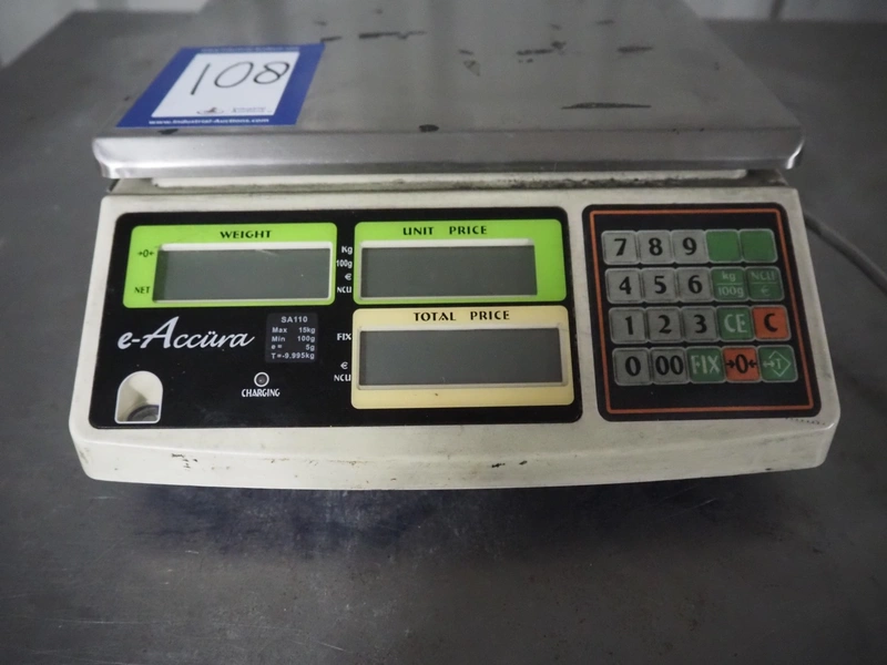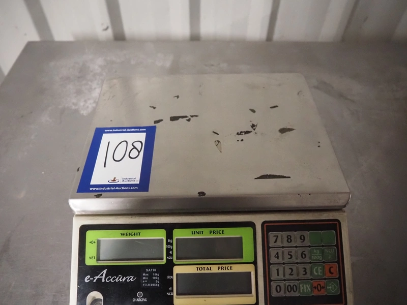 E-Accüra weighing scale, serial number: BCAC 00280, maximum capacity: 15 kg, minimum capacity: 0.10 kg, e=0.005 kg, T=-9.995 kg, dimensions: 330 mm x 290 mm x 110 mm.