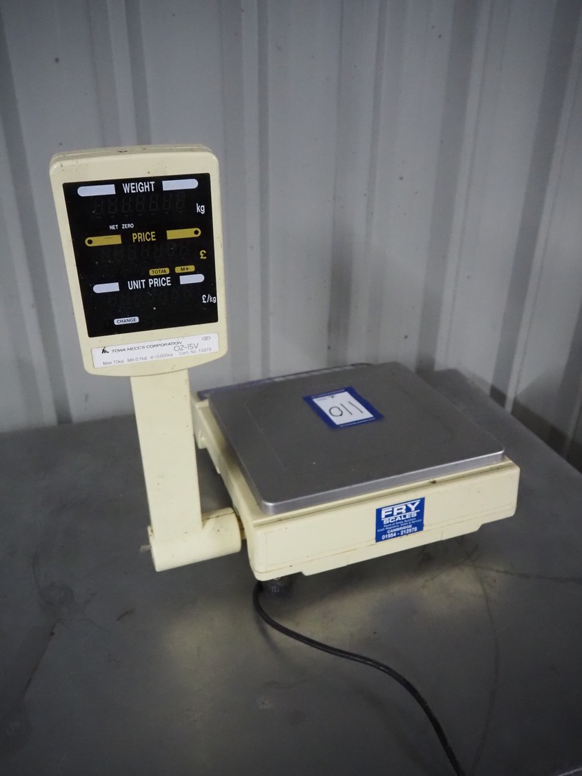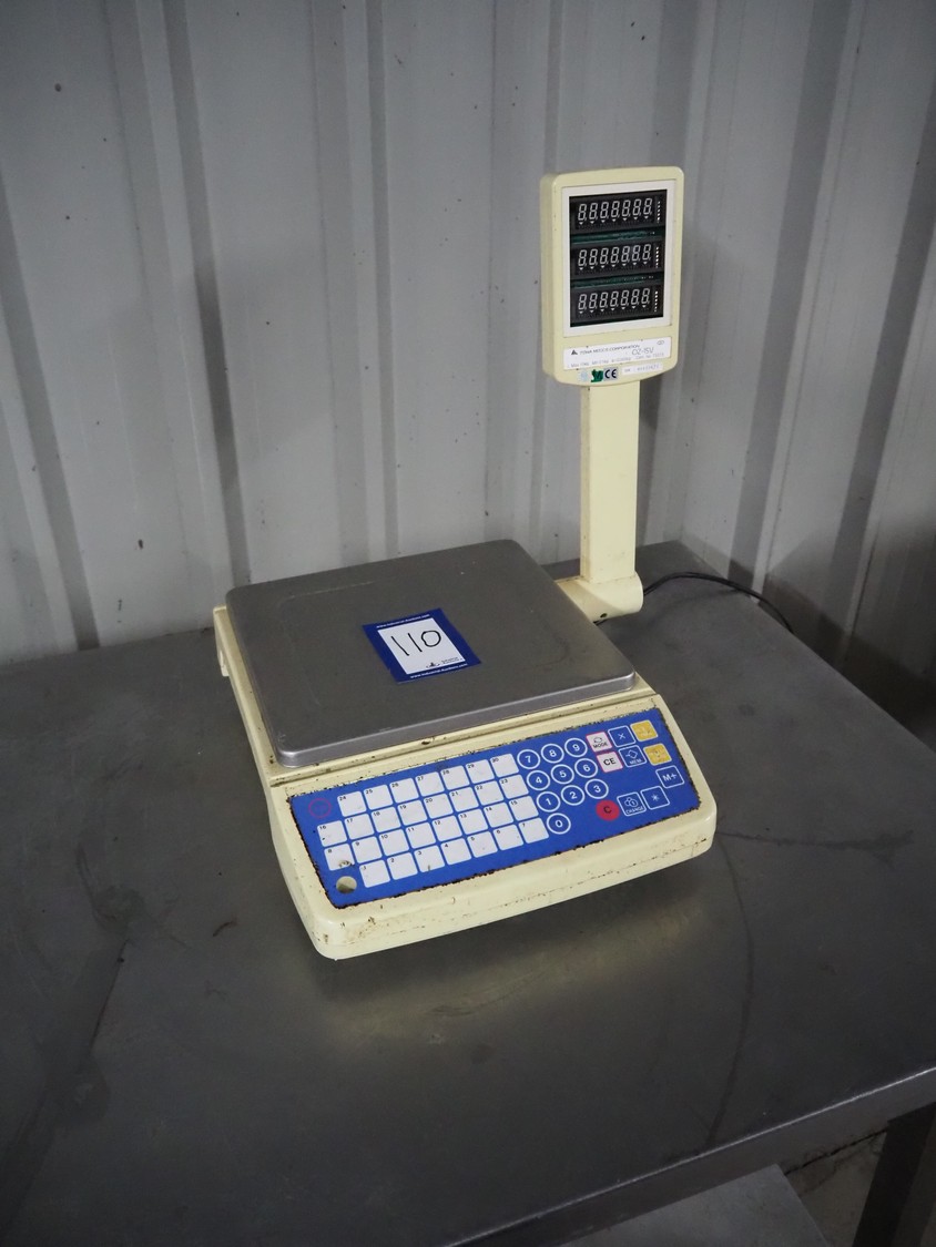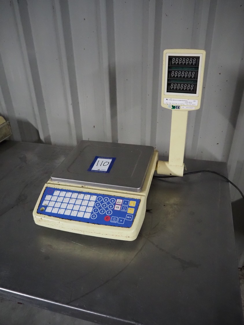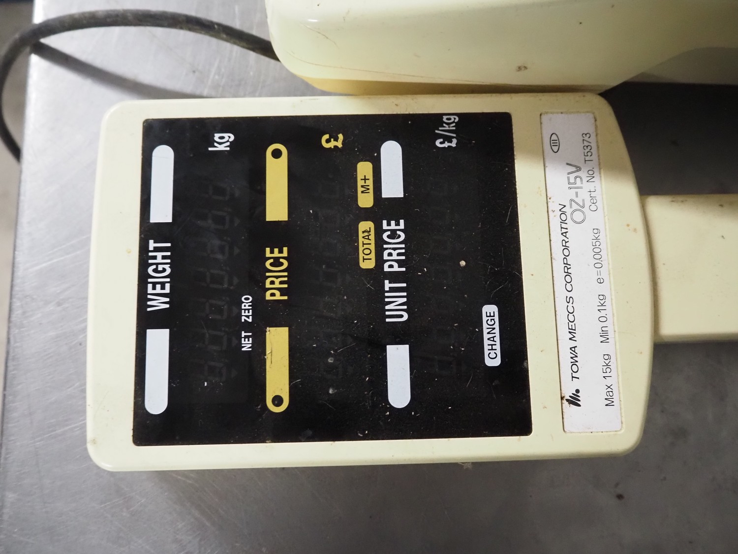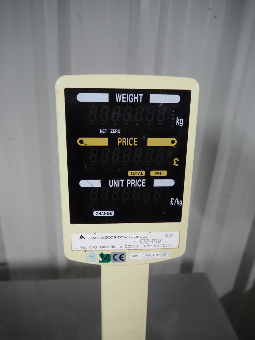 Towa Meccs Corporation weighing scale, 230 V, 1 Ph, 50/60 Hz, 200 mA, scale dimensions: 300 mm x 280 mm, total dimensions: 430 mm x 330 mm x 470 mm.