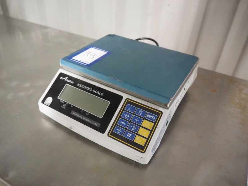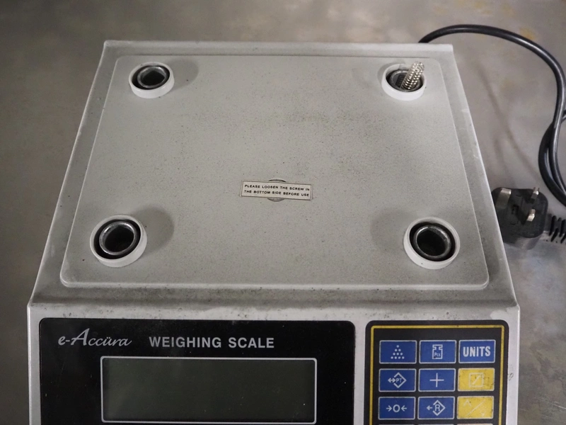 E-Accüra weighing scale, serial number: BFAA 00249, maximum capacity: 3 kg, minimum capacity: 2.02 kg, e=0.001 kg, T=-3 kg, dimensions: 330 mm x 290 mm x 110 mm.