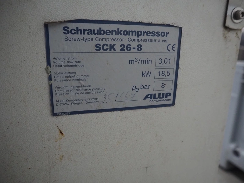 Alup Kompressoren screw compressor, model: SCK 26-8, 18.5 kW, volume flow rate: 3.01 m³/min, compressor discharge pressure: 8 pe bar, dimensions: 800 mm x 1300 mm x 1500 mm.