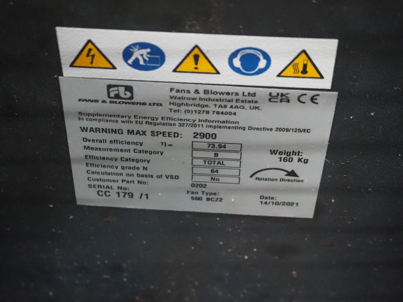 Fans & Blowers Ltd blower, type: 560 BCZ2, serial number: CC 179 /1, year of construction: 14/10/2021, weight: 160 kg, dimensions: 1250 mm x 950 mm x 940 mm.