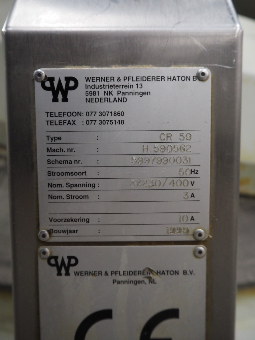 Werner & Pfleiderer Haton BV mobile conical rounding machine, type: CR 59, machine number: H. 590562, year of construction: 1995, 230/400 V, 3 Ph, 50 Hz, 3/10 A, dimensions: 1100 mm x 1100 mm x 1500 mm.