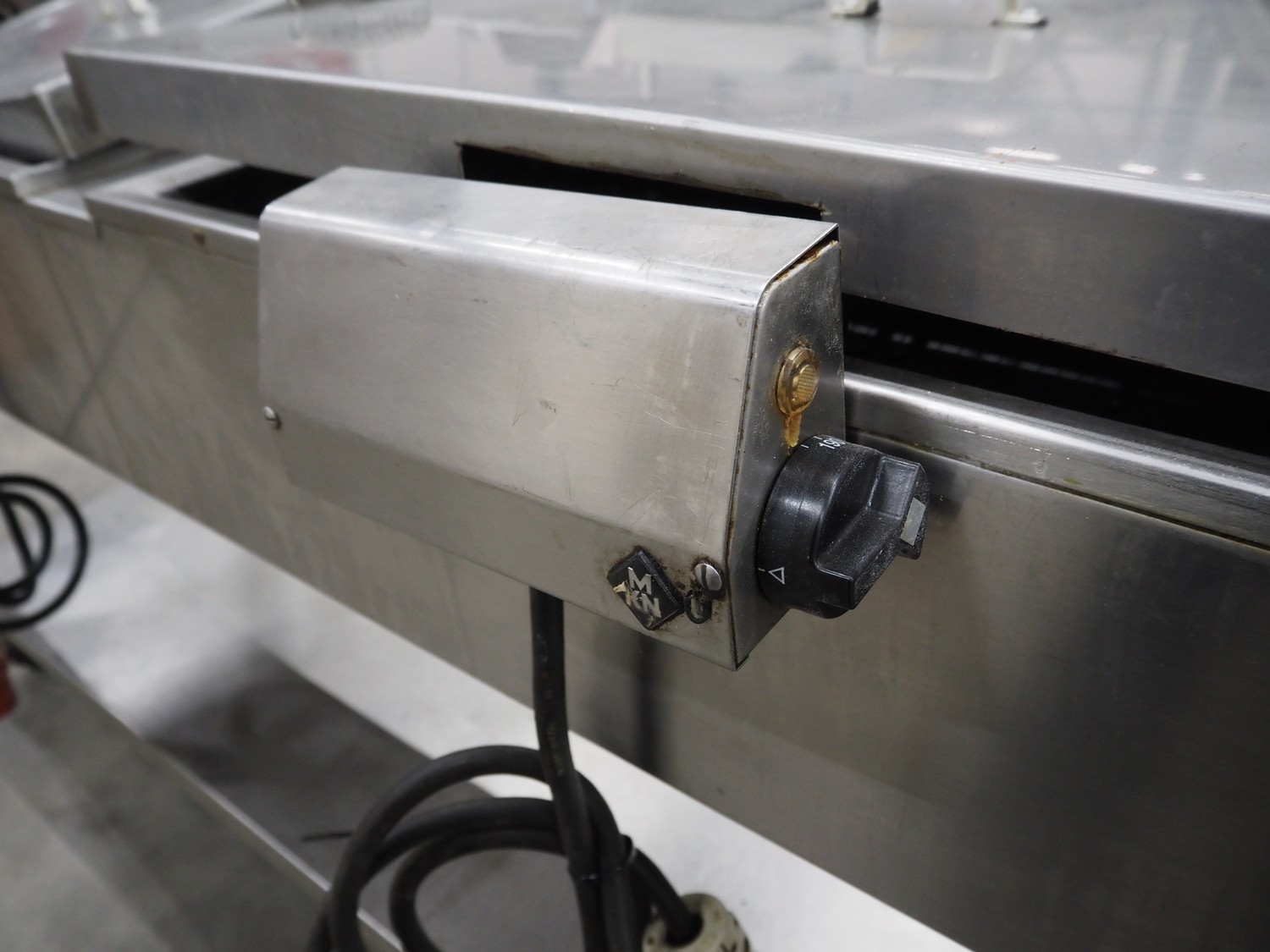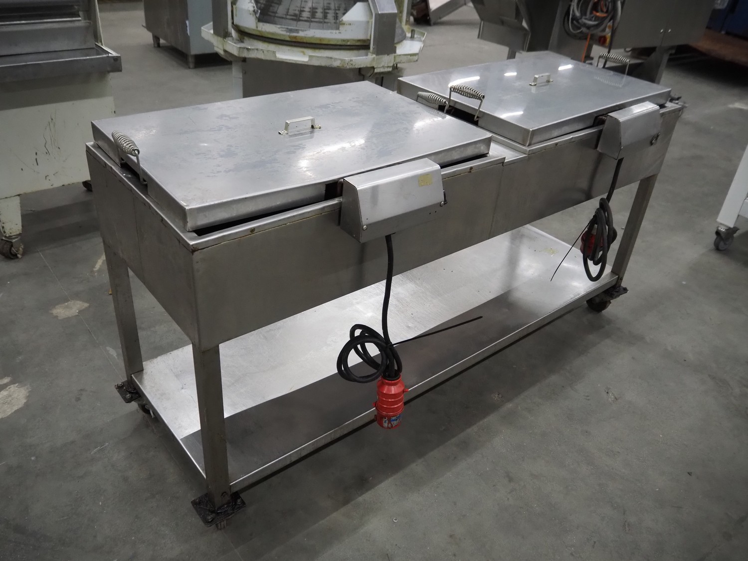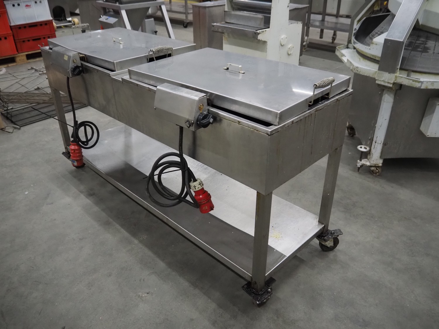 MKN s/s mobile double doughnut fryer, inside dimensions: (2x) 760 mm x 460 mm, total dimensions: 1760 mm x 630 mm x 1000 mm. Including extra baskets.