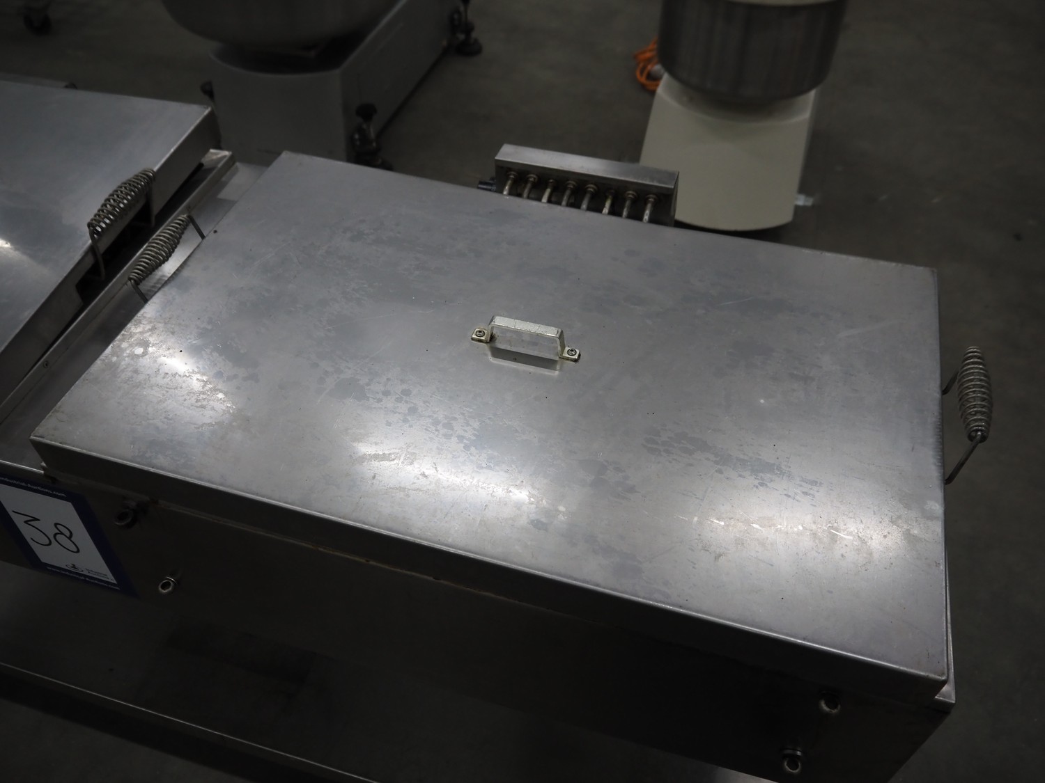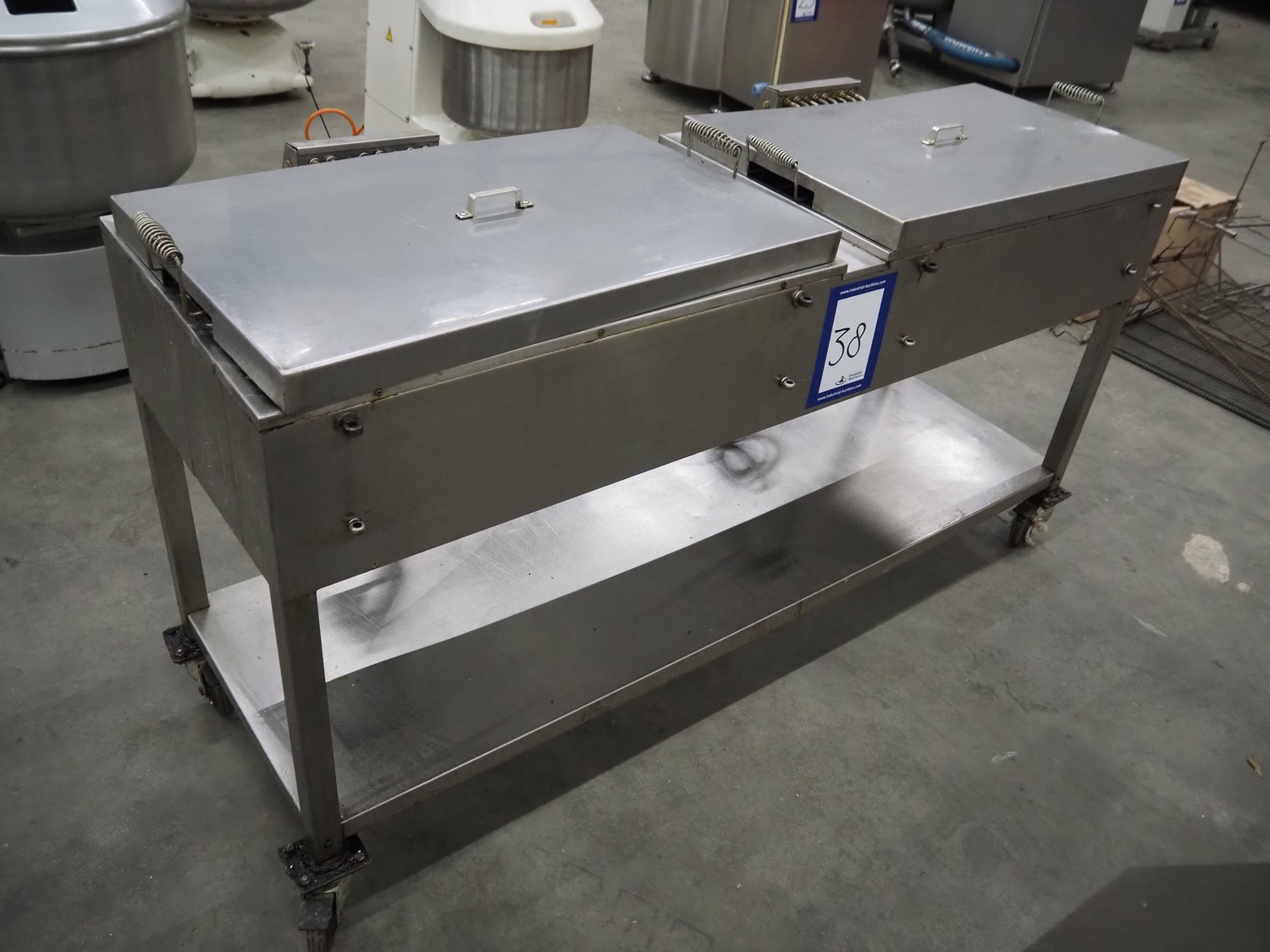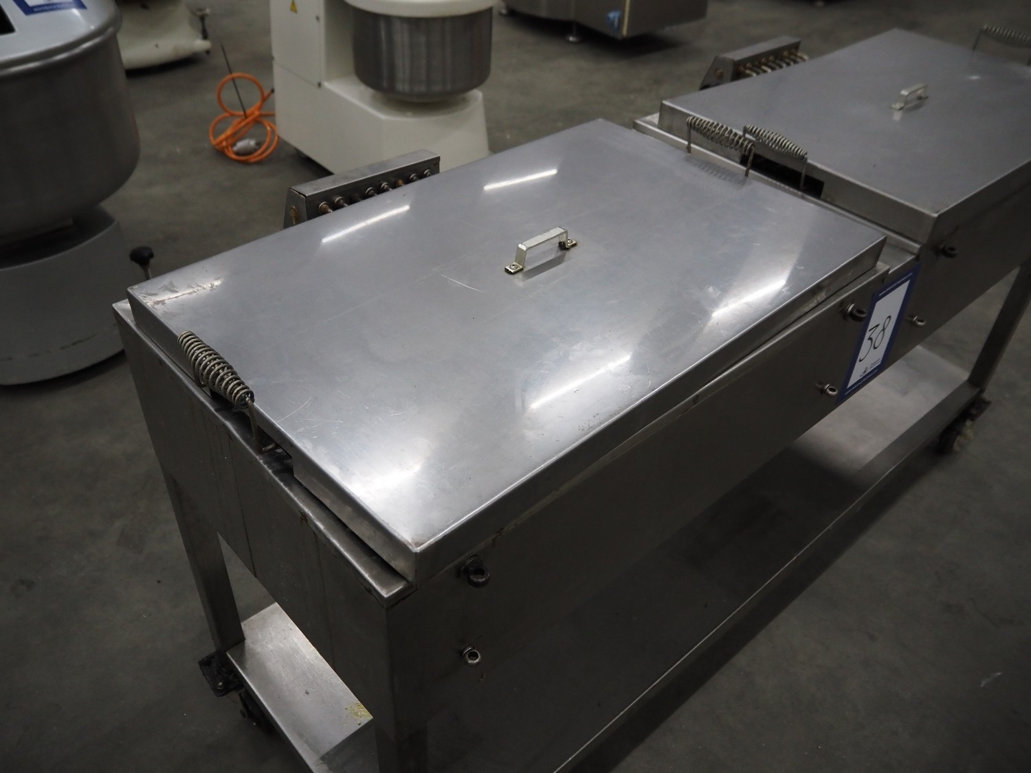 MKN s/s mobile double doughnut fryer, inside dimensions: (2x) 760 mm x 460 mm, total dimensions: 1760 mm x 630 mm x 1000 mm. Including extra baskets.