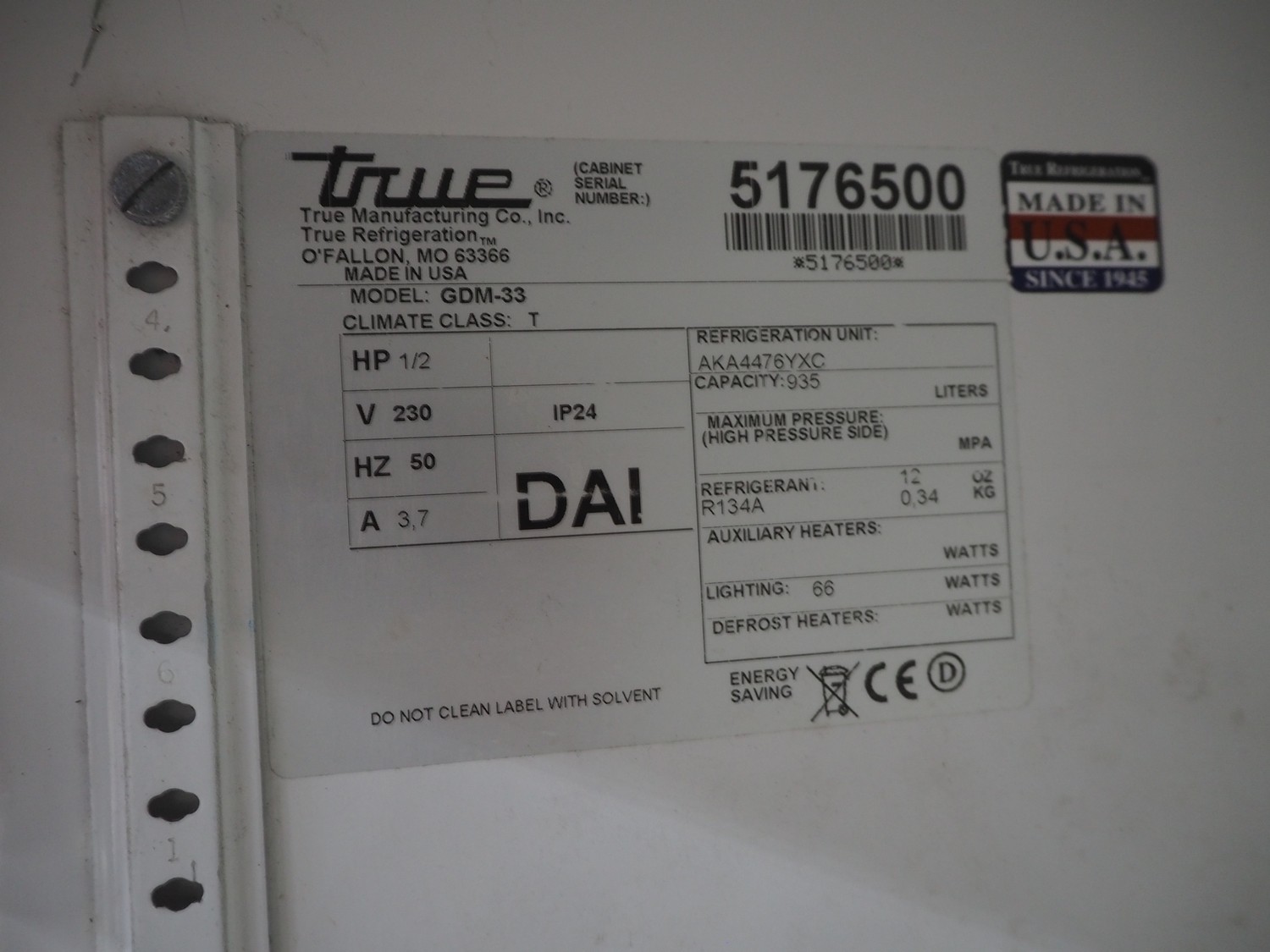 True mobile refrigerator, model: GDM-33, serial number: 5176500, refrigerant: R134A, 0.34 kg, capacity: 935 liter, dimensions: 1000 mm x 750 mm x 2080 mm.