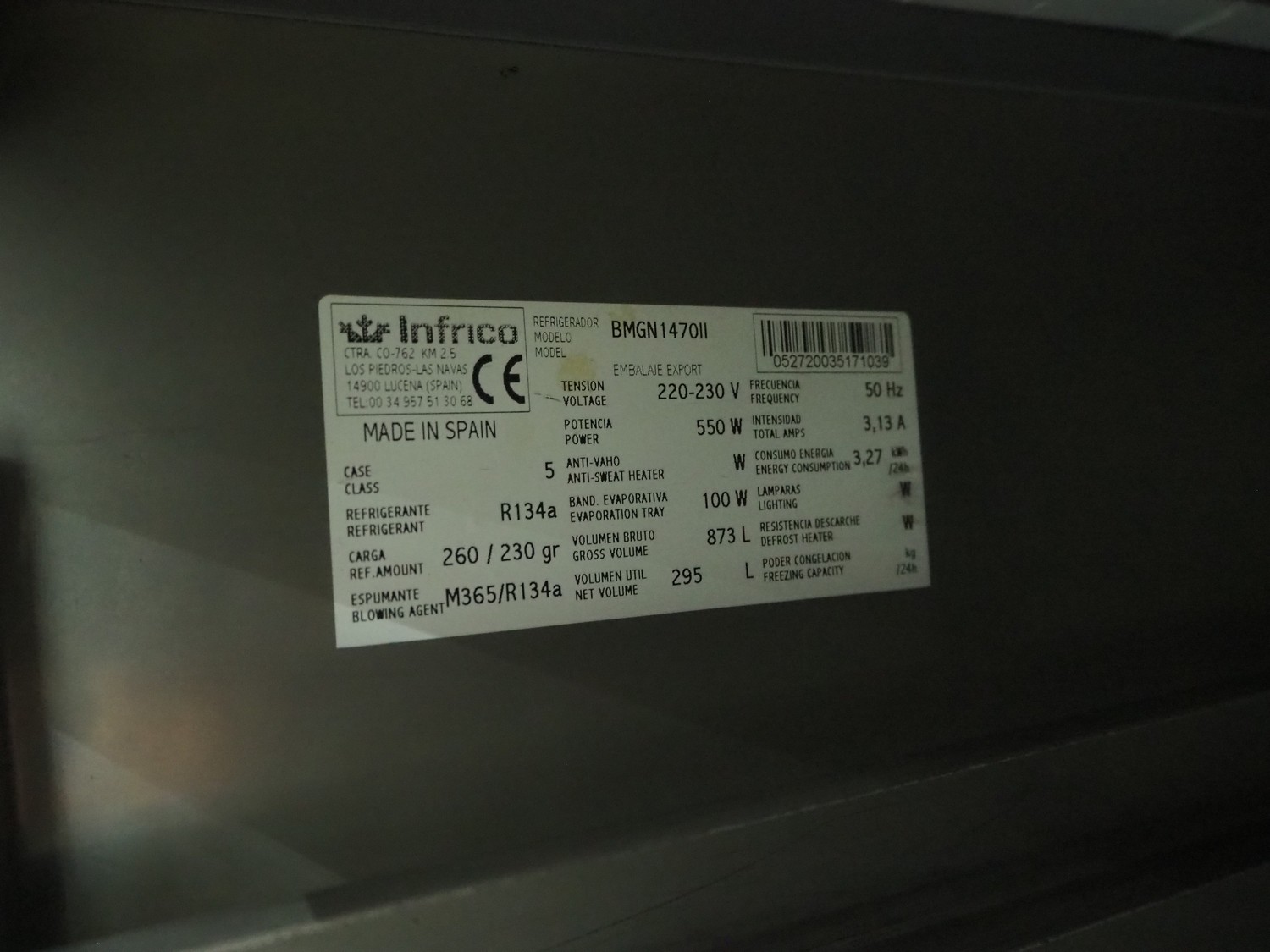 Infrico refrigerator, model: BMGN1470II, 220-230 V, 50 Hz, 3.13 A, 3.27 kW, gross volume: 873 liter, nett volume: 295 liter, refrigerant: R134a, 260/230 g, dimensions each floor: 540 mm x 330 mm, total dimensions: 1470 mm x 700 mm x 960 mm.