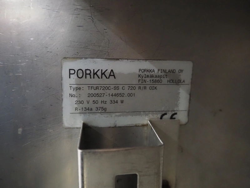 Porkka refrigerator, type: TFUR720C-SS C 720 R/R OIK, number: 200527-144652.001, 230 V, 50 Hz, 334 Watt, refrigerant: R-134a, 375 gram, dimensions: 850 mm x 710 mm x 1980 mm.